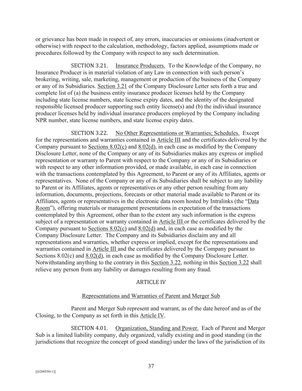 37 [[6200550v1]] or grievance has been made in respect of, any errors, inaccuracies or omissions (inadvertent or otherwise) with respect to the calculation, methodology, factors applied, assumptions made or procedures followed by the Company with respect to any such determination. Insurance Producers. To the Knowledge of the Company, no Insurance Producer is in material violation of any Law in connection with such person’s brokering, writing, sale, marketing, management or production of the business of the Company or any of its Subsidiaries. Section 3.21 of the Company Disclosure Letter sets forth a true and complete list of (a) the business entity insurance producer licenses held by the Company including state license numbers, state license expiry dates, and the identity of the designated responsible licensed producer supporting such entity license(s) and (b) the individual insurance producer licenses held by individual insurance producers employed by the Company including NPR number, state license numbers, and state license expiry dates. No Other Representations or Warranties; Schedules. Except for the representations and warranties contained in Article III and the certificates delivered by the Company pursuant to Sections 8.02(c) and 8.02(d), in each case as modified by the Company Disclosure Letter, none of the Company or any of its Subsidiaries makes any express or implied representation or warranty to Parent with respect to the Company or any of its Subsidiaries or with respect to any other information provided, or made available, in each case in connection with the transactions contemplated by this Agreement, to Parent or any of its Affiliates, agents or representatives. None of the Company or any of its Subsidiaries shall be subject to any liability to Parent or its Affiliates, agents or representatives or any other person resulting from any information, documents, projections, forecasts or other material made available to Parent or its Affiliates, agents or representatives in the electronic data room hosted by Intralinks (the “Data Room”), offering materials or management presentations in expectation of the transactions contemplated by this Agreement, other than to the extent any such information is the express subject of a representation or warranty contained in Article III or the certificates delivered by the Company pursuant to Sections 8.02(c) and 8.02(d) and, in each case as modified by the Company Disclosure Letter. The Company and its Subsidiaries disclaim any and all representations and warranties, whether express or implied, except for the representations and warranties contained in Article III and the certificates delivered by the Company pursuant to Sections 8.02(c) and 8.02(d), in each case as modified by the Company Disclosure Letter. Notwithstanding anything to the contrary in this Section 3.22, nothing in this Section 3.22 shall relieve any person from any liability or damages resulting from any fraud. Representations and Warranties of Parent and Merger Sub Parent and Merger Sub represent and warrant, as of the date hereof and as of the Closing, to the Company as set forth in this Article IV. Organization, Standing and Power. Each of Parent and Merger Sub is a limited liability company, duly organized, validly existing and in good standing (in the jurisdictions that recognize the concept of good standing) under the laws of the jurisdiction of its