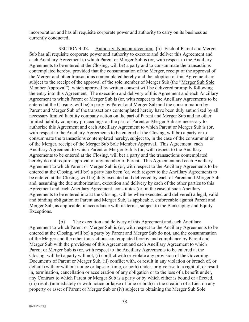 38 [[6200550v1]] incorporation and has all requisite corporate power and authority to carry on its business as currently conducted. Authority; Noncontravention. Each of Parent and Merger Sub has all requisite corporate power and authority to execute and deliver this Agreement and each Ancillary Agreement to which Parent or Merger Sub is (or, with respect to the Ancillary Agreements to be entered at the Closing, will be) a party and to consummate the transactions contemplated hereby, provided that the consummation of the Merger, receipt of the approval of the Merger and other transactions contemplated hereby and the adoption of this Agreement are subject to the receipt of the approval of the sole member of Merger Sub (the “Merger Sub Sole Member Approval”), which approval by written consent will be delivered promptly following the entry into this Agreement. The execution and delivery of this Agreement and each Ancillary Agreement to which Parent or Merger Sub is (or, with respect to the Ancillary Agreements to be entered at the Closing, will be) a party by Parent and Merger Sub and the consummation by Parent and Merger Sub of the transactions contemplated hereby have been duly authorized by all necessary limited liability company action on the part of Parent and Merger Sub and no other limited liability company proceedings on the part of Parent or Merger Sub are necessary to authorize this Agreement and each Ancillary Agreement to which Parent or Merger Sub is (or, with respect to the Ancillary Agreements to be entered at the Closing, will be) a party or to consummate the transactions contemplated hereby, subject to, in the case of the consummation of the Merger, receipt of the Merger Sub Sole Member Approval. This Agreement, each Ancillary Agreement to which Parent or Merger Sub is (or, with respect to the Ancillary Agreements to be entered at the Closing, will be) a party and the transactions contemplated hereby do not require approval of any member of Parent. This Agreement and each Ancillary Agreement to which Parent or Merger Sub is (or, with respect to the Ancillary Agreements to be entered at the Closing, will be) a party has been (or, with respect to the Ancillary Agreements to be entered at the Closing, will be) duly executed and delivered by each of Parent and Merger Sub and, assuming the due authorization, execution and delivery by each of the other parties to this Agreement and each Ancillary Agreement, constitutes (or, in the case of such Ancillary Agreements to be entered into at the Closing, will be when executed and delivered) a legal, valid and binding obligation of Parent and Merger Sub, as applicable, enforceable against Parent and Merger Sub, as applicable, in accordance with its terms, subject to the Bankruptcy and Equity Exceptions. The execution and delivery of this Agreement and each Ancillary Agreement to which Parent or Merger Sub is (or, with respect to the Ancillary Agreements to be entered at the Closing, will be) a party by Parent and Merger Sub do not, and the consummation of the Merger and the other transactions contemplated hereby and compliance by Parent and Merger Sub with the provisions of this Agreement and each Ancillary Agreement to which Parent or Merger Sub is (or, with respect to the Ancillary Agreements to be entered at the Closing, will be) a party will not, (i) conflict with or violate any provision of the Governing Documents of Parent or Merger Sub, (ii) conflict with, or result in any violation or breach of, or default (with or without notice or lapse of time, or both) under, or give rise to a right of, or result in, termination, cancellation or acceleration of any obligation or to the loss of a benefit under, any Contract to which Parent or Merger Sub is a party or by which either is bound or affected, (iii) result (immediately or with notice or lapse of time or both) in the creation of a Lien on any property or asset of Parent or Merger Sub or (iv) subject to obtaining the Merger Sub Sole
