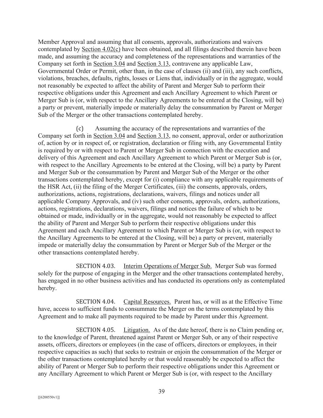39 [[6200550v1]] Member Approval and assuming that all consents, approvals, authorizations and waivers contemplated by Section 4.02(c) have been obtained, and all filings described therein have been made, and assuming the accuracy and completeness of the representations and warranties of the Company set forth in Section 3.04 and Section 3.13, contravene any applicable Law, Governmental Order or Permit, other than, in the case of clauses (ii) and (iii), any such conflicts, violations, breaches, defaults, rights, losses or Liens that, individually or in the aggregate, would not reasonably be expected to affect the ability of Parent and Merger Sub to perform their respective obligations under this Agreement and each Ancillary Agreement to which Parent or Merger Sub is (or, with respect to the Ancillary Agreements to be entered at the Closing, will be) a party or prevent, materially impede or materially delay the consummation by Parent or Merger Sub of the Merger or the other transactions contemplated hereby. Assuming the accuracy of the representations and warranties of the Company set forth in Section 3.04 and Section 3.13, no consent, approval, order or authorization of, action by or in respect of, or registration, declaration or filing with, any Governmental Entity is required by or with respect to Parent or Merger Sub in connection with the execution and delivery of this Agreement and each Ancillary Agreement to which Parent or Merger Sub is (or, with respect to the Ancillary Agreements to be entered at the Closing, will be) a party by Parent and Merger Sub or the consummation by Parent and Merger Sub of the Merger or the other transactions contemplated hereby, except for (i) compliance with any applicable requirements of the HSR Act, (ii) the filing of the Merger Certificates, (iii) the consents, approvals, orders, authorizations, actions, registrations, declarations, waivers, filings and notices under all applicable Company Approvals, and (iv) such other consents, approvals, orders, authorizations, actions, registrations, declarations, waivers, filings and notices the failure of which to be obtained or made, individually or in the aggregate, would not reasonably be expected to affect the ability of Parent and Merger Sub to perform their respective obligations under this Agreement and each Ancillary Agreement to which Parent or Merger Sub is (or, with respect to the Ancillary Agreements to be entered at the Closing, will be) a party or prevent, materially impede or materially delay the consummation by Parent or Merger Sub of the Merger or the other transactions contemplated hereby. Interim Operations of Merger Sub. Merger Sub was formed solely for the purpose of engaging in the Merger and the other transactions contemplated hereby, has engaged in no other business activities and has conducted its operations only as contemplated hereby. Capital Resources. Parent has, or will as at the Effective Time have, access to sufficient funds to consummate the Merger on the terms contemplated by this Agreement and to make all payments required to be made by Parent under this Agreement. Litigation. As of the date hereof, there is no Claim pending or, to the knowledge of Parent, threatened against Parent or Merger Sub, or any of their respective assets, officers, directors or employees (in the case of officers, directors or employees, in their respective capacities as such) that seeks to restrain or enjoin the consummation of the Merger or the other transactions contemplated hereby or that would reasonably be expected to affect the ability of Parent or Merger Sub to perform their respective obligations under this Agreement or any Ancillary Agreement to which Parent or Merger Sub is (or, with respect to the Ancillary
