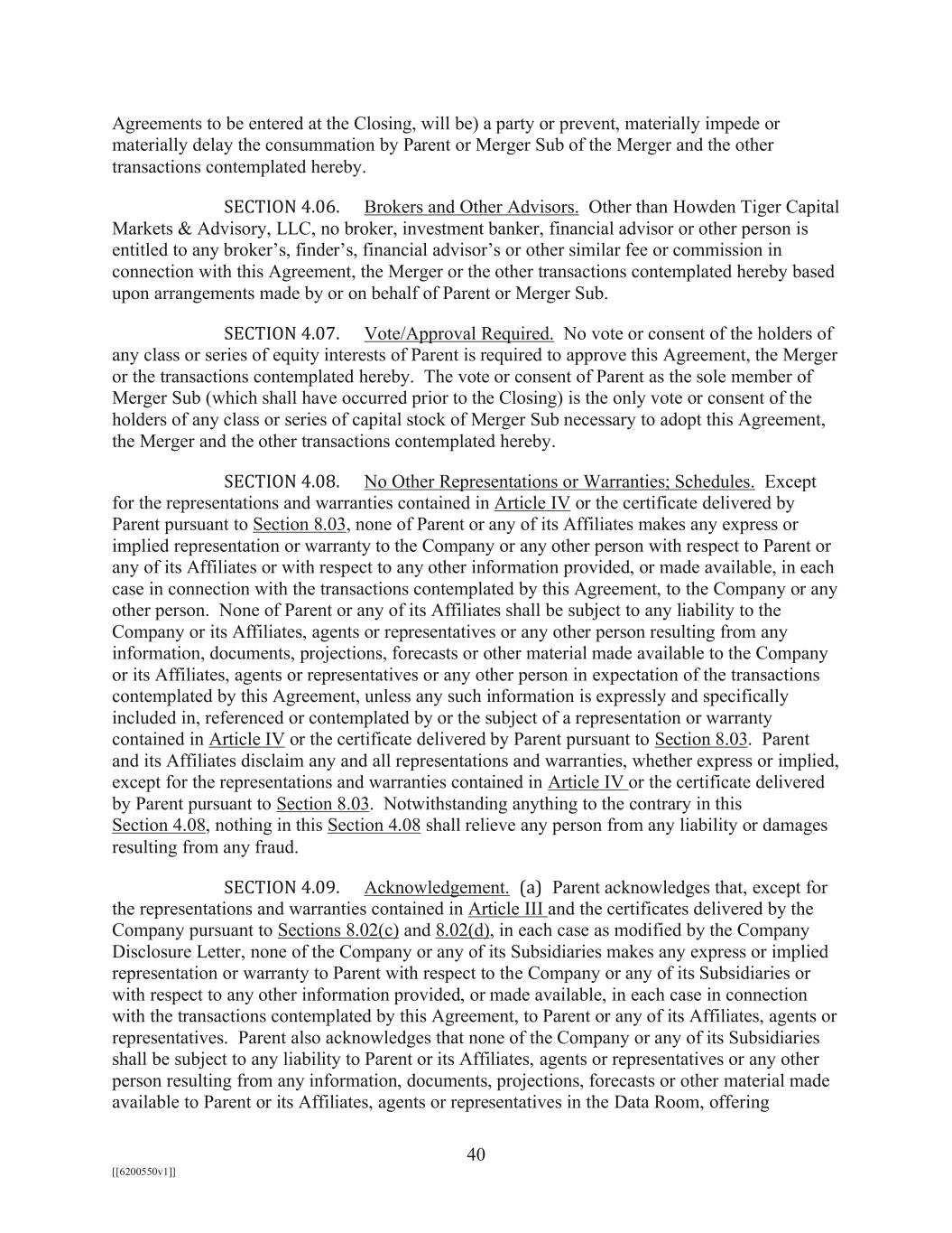 40 [[6200550v1]] Agreements to be entered at the Closing, will be) a party or prevent, materially impede or materially delay the consummation by Parent or Merger Sub of the Merger and the other transactions contemplated hereby. Brokers and Other Advisors. Other than Howden Tiger Capital Markets & Advisory, LLC, no broker, investment banker, financial advisor or other person is entitled to any broker’s, finder’s, financial advisor’s or other similar fee or commission in connection with this Agreement, the Merger or the other transactions contemplated hereby based upon arrangements made by or on behalf of Parent or Merger Sub. Vote/Approval Required. No vote or consent of the holders of any class or series of equity interests of Parent is required to approve this Agreement, the Merger or the transactions contemplated hereby. The vote or consent of Parent as the sole member of Merger Sub (which shall have occurred prior to the Closing) is the only vote or consent of the holders of any class or series of capital stock of Merger Sub necessary to adopt this Agreement, the Merger and the other transactions contemplated hereby. No Other Representations or Warranties; Schedules. Except for the representations and warranties contained in Article IV or the certificate delivered by Parent pursuant to Section 8.03, none of Parent or any of its Affiliates makes any express or implied representation or warranty to the Company or any other person with respect to Parent or any of its Affiliates or with respect to any other information provided, or made available, in each case in connection with the transactions contemplated by this Agreement, to the Company or any other person. None of Parent or any of its Affiliates shall be subject to any liability to the Company or its Affiliates, agents or representatives or any other person resulting from any information, documents, projections, forecasts or other material made available to the Company or its Affiliates, agents or representatives or any other person in expectation of the transactions contemplated by this Agreement, unless any such information is expressly and specifically included in, referenced or contemplated by or the subject of a representation or warranty contained in Article IV or the certificate delivered by Parent pursuant to Section 8.03. Parent and its Affiliates disclaim any and all representations and warranties, whether express or implied, except for the representations and warranties contained in Article IV or the certificate delivered by Parent pursuant to Section 8.03. Notwithstanding anything to the contrary in this Section 4.08, nothing in this Section 4.08 shall relieve any person from any liability or damages resulting from any fraud. Acknowledgement. Parent acknowledges that, except for the representations and warranties contained in Article III and the certificates delivered by the Company pursuant to Sections 8.02(c) and 8.02(d), in each case as modified by the Company Disclosure Letter, none of the Company or any of its Subsidiaries makes any express or implied representation or warranty to Parent with respect to the Company or any of its Subsidiaries or with respect to any other information provided, or made available, in each case in connection with the transactions contemplated by this Agreement, to Parent or any of its Affiliates, agents or representatives. Parent also acknowledges that none of the Company or any of its Subsidiaries shall be subject to any liability to Parent or its Affiliates, agents or representatives or any other person resulting from any information, documents, projections, forecasts or other material made available to Parent or its Affiliates, agents or representatives in the Data Room, offering