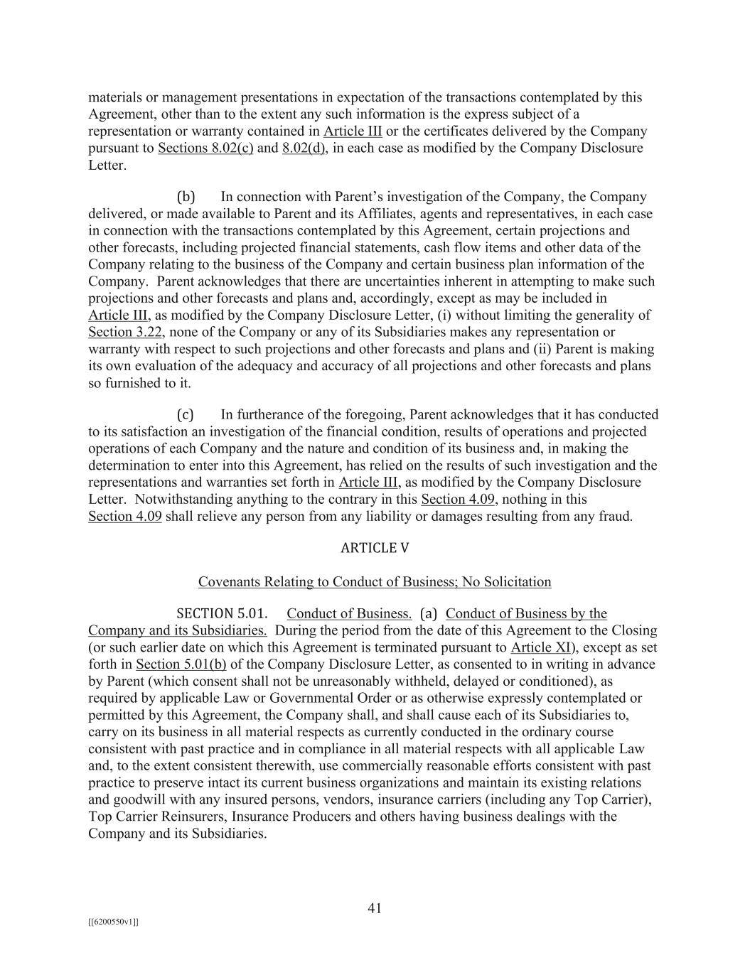 41 [[6200550v1]] materials or management presentations in expectation of the transactions contemplated by this Agreement, other than to the extent any such information is the express subject of a representation or warranty contained in Article III or the certificates delivered by the Company pursuant to Sections 8.02(c) and 8.02(d), in each case as modified by the Company Disclosure Letter. In connection with Parent’s investigation of the Company, the Company delivered, or made available to Parent and its Affiliates, agents and representatives, in each case in connection with the transactions contemplated by this Agreement, certain projections and other forecasts, including projected financial statements, cash flow items and other data of the Company relating to the business of the Company and certain business plan information of the Company. Parent acknowledges that there are uncertainties inherent in attempting to make such projections and other forecasts and plans and, accordingly, except as may be included in Article III, as modified by the Company Disclosure Letter, (i) without limiting the generality of Section 3.22, none of the Company or any of its Subsidiaries makes any representation or warranty with respect to such projections and other forecasts and plans and (ii) Parent is making its own evaluation of the adequacy and accuracy of all projections and other forecasts and plans so furnished to it. In furtherance of the foregoing, Parent acknowledges that it has conducted to its satisfaction an investigation of the financial condition, results of operations and projected operations of each Company and the nature and condition of its business and, in making the determination to enter into this Agreement, has relied on the results of such investigation and the representations and warranties set forth in Article III, as modified by the Company Disclosure Letter. Notwithstanding anything to the contrary in this Section 4.09, nothing in this Section 4.09 shall relieve any person from any liability or damages resulting from any fraud. Covenants Relating to Conduct of Business; No Solicitation Conduct of Business. Conduct of Business by the Company and its Subsidiaries. During the period from the date of this Agreement to the Closing (or such earlier date on which this Agreement is terminated pursuant to Article XI), except as set forth in Section 5.01(b) of the Company Disclosure Letter, as consented to in writing in advance by Parent (which consent shall not be unreasonably withheld, delayed or conditioned), as required by applicable Law or Governmental Order or as otherwise expressly contemplated or permitted by this Agreement, the Company shall, and shall cause each of its Subsidiaries to, carry on its business in all material respects as currently conducted in the ordinary course consistent with past practice and in compliance in all material respects with all applicable Law and, to the extent consistent therewith, use commercially reasonable efforts consistent with past practice to preserve intact its current business organizations and maintain its existing relations and goodwill with any insured persons, vendors, insurance carriers (including any Top Carrier), Top Carrier Reinsurers, Insurance Producers and others having business dealings with the Company and its Subsidiaries.