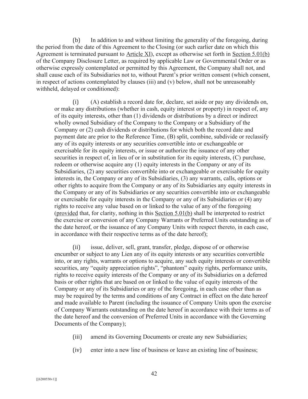 42 [[6200550v1]] In addition to and without limiting the generality of the foregoing, during the period from the date of this Agreement to the Closing (or such earlier date on which this Agreement is terminated pursuant to Article XI), except as otherwise set forth in Section 5.01(b) of the Company Disclosure Letter, as required by applicable Law or Governmental Order or as otherwise expressly contemplated or permitted by this Agreement, the Company shall not, and shall cause each of its Subsidiaries not to, without Parent’s prior written consent (which consent, in respect of actions contemplated by clauses (iii) and (v) below, shall not be unreasonably withheld, delayed or conditioned): (A) establish a record date for, declare, set aside or pay any dividends on, or make any distributions (whether in cash, equity interest or property) in respect of, any of its equity interests, other than (1) dividends or distributions by a direct or indirect wholly owned Subsidiary of the Company to the Company or a Subsidiary of the Company or (2) cash dividends or distributions for which both the record date and payment date are prior to the Reference Time, (B) split, combine, subdivide or reclassify any of its equity interests or any securities convertible into or exchangeable or exercisable for its equity interests, or issue or authorize the issuance of any other securities in respect of, in lieu of or in substitution for its equity interests, (C) purchase, redeem or otherwise acquire any (1) equity interests in the Company or any of its Subsidiaries, (2) any securities convertible into or exchangeable or exercisable for equity interests in, the Company or any of its Subsidiaries, (3) any warrants, calls, options or other rights to acquire from the Company or any of its Subsidiaries any equity interests in the Company or any of its Subsidiaries or any securities convertible into or exchangeable or exercisable for equity interests in the Company or any of its Subsidiaries or (4) any rights to receive any value based on or linked to the value of any of the foregoing (provided that, for clarity, nothing in this Section 5.01(b) shall be interpreted to restrict the exercise or conversion of any Company Warrants or Preferred Units outstanding as of the date hereof, or the issuance of any Company Units with respect thereto, in each case, in accordance with their respective terms as of the date hereof); issue, deliver, sell, grant, transfer, pledge, dispose of or otherwise encumber or subject to any Lien any of its equity interests or any securities convertible into, or any rights, warrants or options to acquire, any such equity interests or convertible securities, any “equity appreciation rights”, “phantom” equity rights, performance units, rights to receive equity interests of the Company or any of its Subsidiaries on a deferred basis or other rights that are based on or linked to the value of equity interests of the Company or any of its Subsidiaries or any of the foregoing, in each case other than as may be required by the terms and conditions of any Contract in effect on the date hereof and made available to Parent (including the issuance of Company Units upon the exercise of Company Warrants outstanding on the date hereof in accordance with their terms as of the date hereof and the conversion of Preferred Units in accordance with the Governing Documents of the Company); amend its Governing Documents or create any new Subsidiaries; enter into a new line of business or leave an existing line of business;