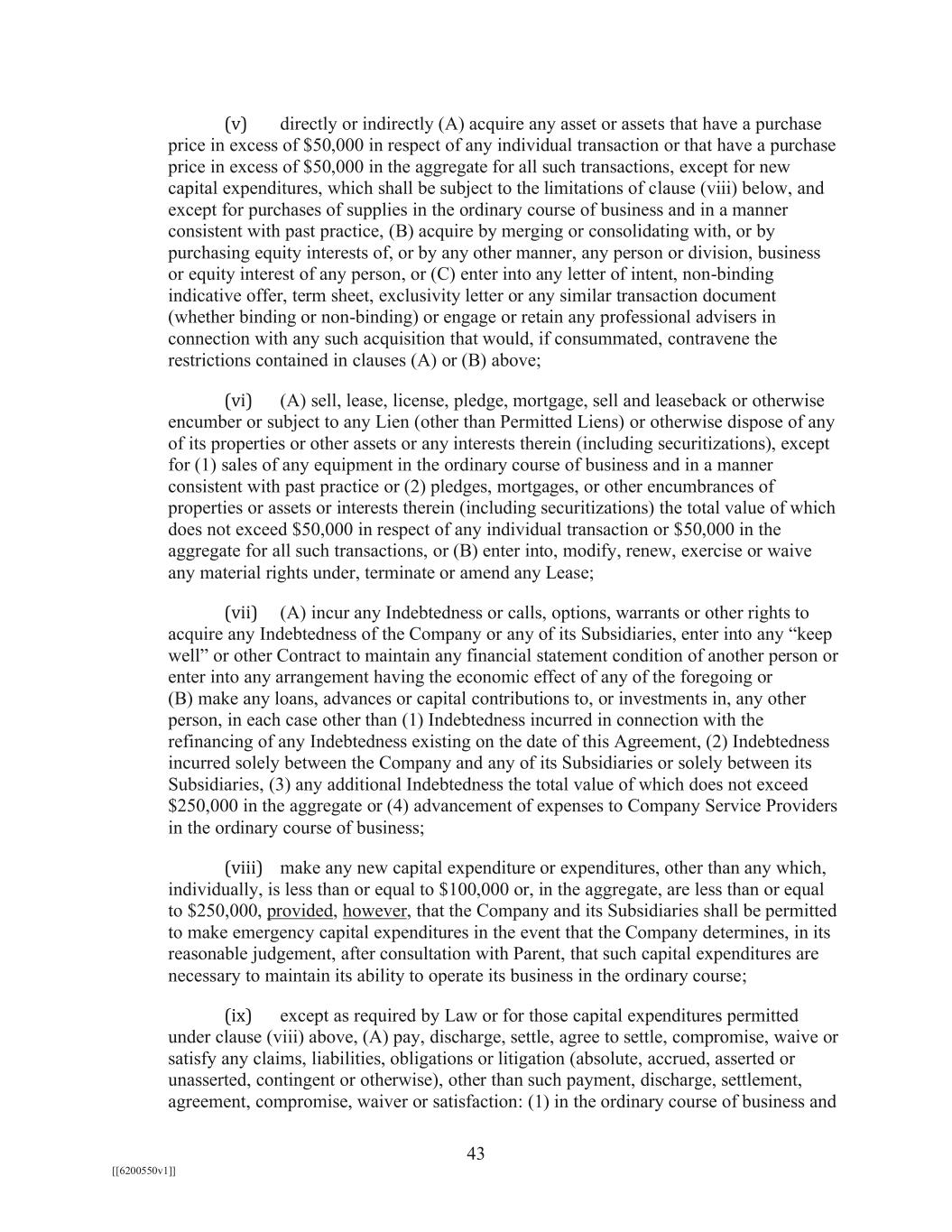 43 [[6200550v1]] directly or indirectly (A) acquire any asset or assets that have a purchase price in excess of $50,000 in respect of any individual transaction or that have a purchase price in excess of $50,000 in the aggregate for all such transactions, except for new capital expenditures, which shall be subject to the limitations of clause (viii) below, and except for purchases of supplies in the ordinary course of business and in a manner consistent with past practice, (B) acquire by merging or consolidating with, or by purchasing equity interests of, or by any other manner, any person or division, business or equity interest of any person, or (C) enter into any letter of intent, non-binding indicative offer, term sheet, exclusivity letter or any similar transaction document (whether binding or non-binding) or engage or retain any professional advisers in connection with any such acquisition that would, if consummated, contravene the restrictions contained in clauses (A) or (B) above; (A) sell, lease, license, pledge, mortgage, sell and leaseback or otherwise encumber or subject to any Lien (other than Permitted Liens) or otherwise dispose of any of its properties or other assets or any interests therein (including securitizations), except for (1) sales of any equipment in the ordinary course of business and in a manner consistent with past practice or (2) pledges, mortgages, or other encumbrances of properties or assets or interests therein (including securitizations) the total value of which does not exceed $50,000 in respect of any individual transaction or $50,000 in the aggregate for all such transactions, or (B) enter into, modify, renew, exercise or waive any material rights under, terminate or amend any Lease; (A) incur any Indebtedness or calls, options, warrants or other rights to acquire any Indebtedness of the Company or any of its Subsidiaries, enter into any “keep well” or other Contract to maintain any financial statement condition of another person or enter into any arrangement having the economic effect of any of the foregoing or (B) make any loans, advances or capital contributions to, or investments in, any other person, in each case other than (1) Indebtedness incurred in connection with the refinancing of any Indebtedness existing on the date of this Agreement, (2) Indebtedness incurred solely between the Company and any of its Subsidiaries or solely between its Subsidiaries, (3) any additional Indebtedness the total value of which does not exceed $250,000 in the aggregate or (4) advancement of expenses to Company Service Providers in the ordinary course of business; make any new capital expenditure or expenditures, other than any which, individually, is less than or equal to $100,000 or, in the aggregate, are less than or equal to $250,000, provided, however, that the Company and its Subsidiaries shall be permitted to make emergency capital expenditures in the event that the Company determines, in its reasonable judgement, after consultation with Parent, that such capital expenditures are necessary to maintain its ability to operate its business in the ordinary course; except as required by Law or for those capital expenditures permitted under clause (viii) above, (A) pay, discharge, settle, agree to settle, compromise, waive or satisfy any claims, liabilities, obligations or litigation (absolute, accrued, asserted or unasserted, contingent or otherwise), other than such payment, discharge, settlement, agreement, compromise, waiver or satisfaction: (1) in the ordinary course of business and