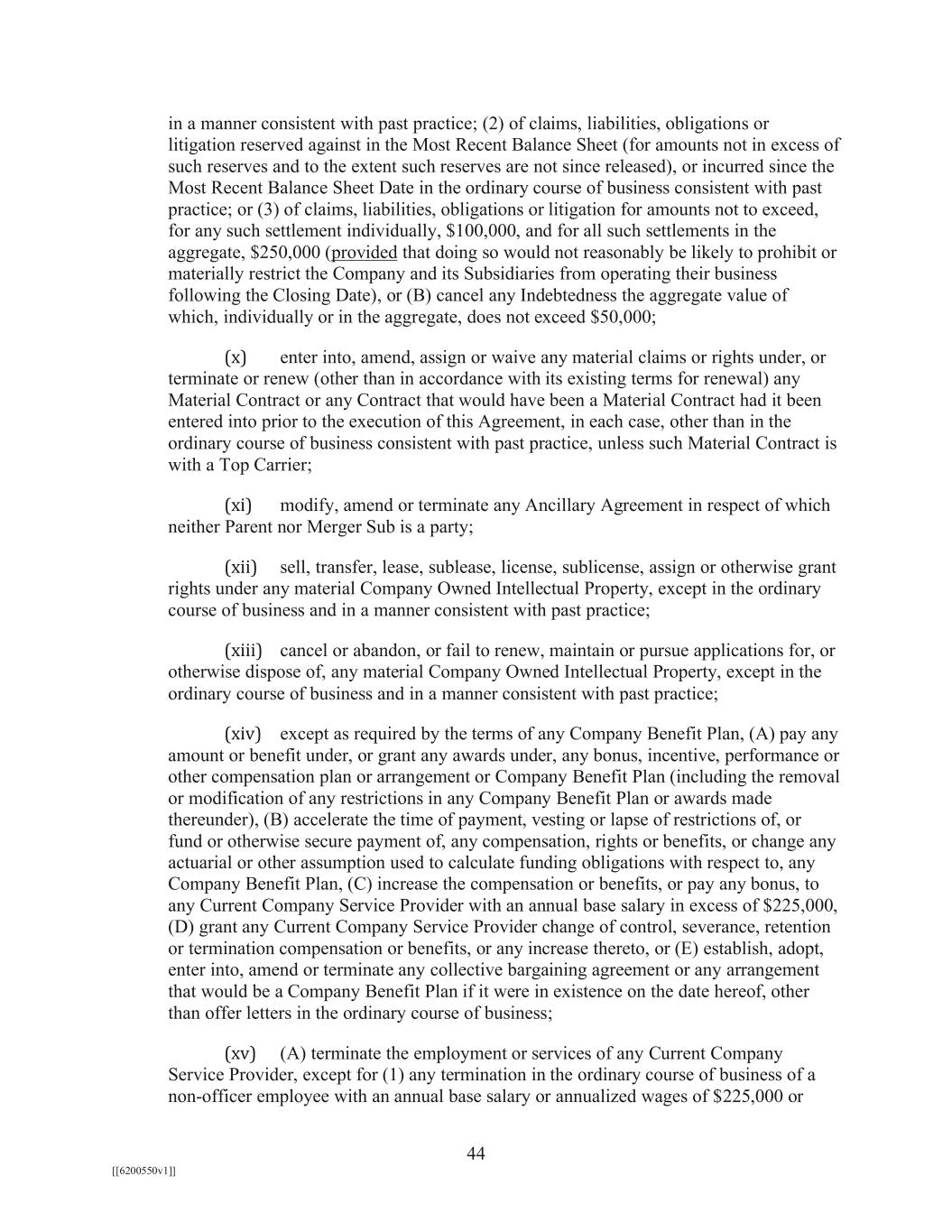 44 [[6200550v1]] in a manner consistent with past practice; (2) of claims, liabilities, obligations or litigation reserved against in the Most Recent Balance Sheet (for amounts not in excess of such reserves and to the extent such reserves are not since released), or incurred since the Most Recent Balance Sheet Date in the ordinary course of business consistent with past practice; or (3) of claims, liabilities, obligations or litigation for amounts not to exceed, for any such settlement individually, $100,000, and for all such settlements in the aggregate, $250,000 (provided that doing so would not reasonably be likely to prohibit or materially restrict the Company and its Subsidiaries from operating their business following the Closing Date), or (B) cancel any Indebtedness the aggregate value of which, individually or in the aggregate, does not exceed $50,000; enter into, amend, assign or waive any material claims or rights under, or terminate or renew (other than in accordance with its existing terms for renewal) any Material Contract or any Contract that would have been a Material Contract had it been entered into prior to the execution of this Agreement, in each case, other than in the ordinary course of business consistent with past practice, unless such Material Contract is with a Top Carrier; modify, amend or terminate any Ancillary Agreement in respect of which neither Parent nor Merger Sub is a party; sell, transfer, lease, sublease, license, sublicense, assign or otherwise grant rights under any material Company Owned Intellectual Property, except in the ordinary course of business and in a manner consistent with past practice; cancel or abandon, or fail to renew, maintain or pursue applications for, or otherwise dispose of, any material Company Owned Intellectual Property, except in the ordinary course of business and in a manner consistent with past practice; except as required by the terms of any Company Benefit Plan, (A) pay any amount or benefit under, or grant any awards under, any bonus, incentive, performance or other compensation plan or arrangement or Company Benefit Plan (including the removal or modification of any restrictions in any Company Benefit Plan or awards made thereunder), (B) accelerate the time of payment, vesting or lapse of restrictions of, or fund or otherwise secure payment of, any compensation, rights or benefits, or change any actuarial or other assumption used to calculate funding obligations with respect to, any Company Benefit Plan, (C) increase the compensation or benefits, or pay any bonus, to any Current Company Service Provider with an annual base salary in excess of $225,000, (D) grant any Current Company Service Provider change of control, severance, retention or termination compensation or benefits, or any increase thereto, or (E) establish, adopt, enter into, amend or terminate any collective bargaining agreement or any arrangement that would be a Company Benefit Plan if it were in existence on the date hereof, other than offer letters in the ordinary course of business; (A) terminate the employment or services of any Current Company Service Provider, except for (1) any termination in the ordinary course of business of a non-officer employee with an annual base salary or annualized wages of $225,000 or
