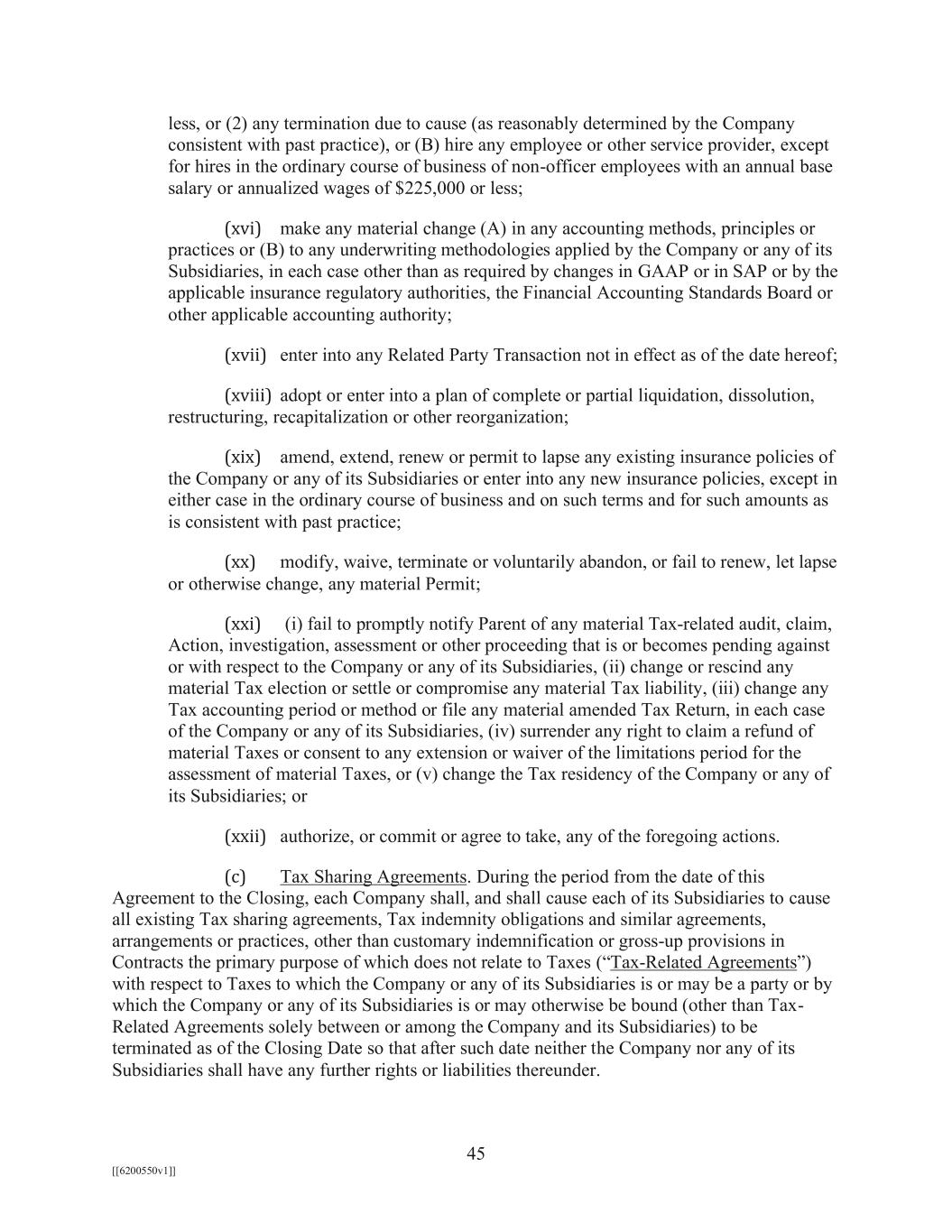 45 [[6200550v1]] less, or (2) any termination due to cause (as reasonably determined by the Company consistent with past practice), or (B) hire any employee or other service provider, except for hires in the ordinary course of business of non-officer employees with an annual base salary or annualized wages of $225,000 or less; make any material change (A) in any accounting methods, principles or practices or (B) to any underwriting methodologies applied by the Company or any of its Subsidiaries, in each case other than as required by changes in GAAP or in SAP or by the applicable insurance regulatory authorities, the Financial Accounting Standards Board or other applicable accounting authority; enter into any Related Party Transaction not in effect as of the date hereof; adopt or enter into a plan of complete or partial liquidation, dissolution, restructuring, recapitalization or other reorganization; amend, extend, renew or permit to lapse any existing insurance policies of the Company or any of its Subsidiaries or enter into any new insurance policies, except in either case in the ordinary course of business and on such terms and for such amounts as is consistent with past practice; modify, waive, terminate or voluntarily abandon, or fail to renew, let lapse or otherwise change, any material Permit; (i) fail to promptly notify Parent of any material Tax-related audit, claim, Action, investigation, assessment or other proceeding that is or becomes pending against or with respect to the Company or any of its Subsidiaries, (ii) change or rescind any material Tax election or settle or compromise any material Tax liability, (iii) change any Tax accounting period or method or file any material amended Tax Return, in each case of the Company or any of its Subsidiaries, (iv) surrender any right to claim a refund of material Taxes or consent to any extension or waiver of the limitations period for the assessment of material Taxes, or (v) change the Tax residency of the Company or any of its Subsidiaries; or authorize, or commit or agree to take, any of the foregoing actions. Tax Sharing Agreements. During the period from the date of this Agreement to the Closing, each Company shall, and shall cause each of its Subsidiaries to cause all existing Tax sharing agreements, Tax indemnity obligations and similar agreements, arrangements or practices, other than customary indemnification or gross-up provisions in Contracts the primary purpose of which does not relate to Taxes (“Tax-Related Agreements”) with respect to Taxes to which the Company or any of its Subsidiaries is or may be a party or by which the Company or any of its Subsidiaries is or may otherwise be bound (other than Tax- Related Agreements solely between or among the Company and its Subsidiaries) to be terminated as of the Closing Date so that after such date neither the Company nor any of its Subsidiaries shall have any further rights or liabilities thereunder.