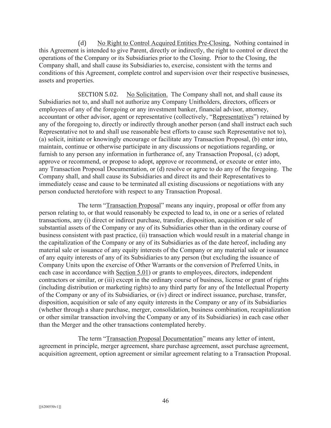 46 [[6200550v1]] No Right to Control Acquired Entities Pre-Closing. Nothing contained in this Agreement is intended to give Parent, directly or indirectly, the right to control or direct the operations of the Company or its Subsidiaries prior to the Closing. Prior to the Closing, the Company shall, and shall cause its Subsidiaries to, exercise, consistent with the terms and conditions of this Agreement, complete control and supervision over their respective businesses, assets and properties. No Solicitation. The Company shall not, and shall cause its Subsidiaries not to, and shall not authorize any Company Unitholders, directors, officers or employees of any of the foregoing or any investment banker, financial advisor, attorney, accountant or other advisor, agent or representative (collectively, “Representatives”) retained by any of the foregoing to, directly or indirectly through another person (and shall instruct each such Representative not to and shall use reasonable best efforts to cause such Representative not to), (a) solicit, initiate or knowingly encourage or facilitate any Transaction Proposal, (b) enter into, maintain, continue or otherwise participate in any discussions or negotiations regarding, or furnish to any person any information in furtherance of, any Transaction Proposal, (c) adopt, approve or recommend, or propose to adopt, approve or recommend, or execute or enter into, any Transaction Proposal Documentation, or (d) resolve or agree to do any of the foregoing. The Company shall, and shall cause its Subsidiaries and direct its and their Representatives to immediately cease and cause to be terminated all existing discussions or negotiations with any person conducted heretofore with respect to any Transaction Proposal. The term “Transaction Proposal” means any inquiry, proposal or offer from any person relating to, or that would reasonably be expected to lead to, in one or a series of related transactions, any (i) direct or indirect purchase, transfer, disposition, acquisition or sale of substantial assets of the Company or any of its Subsidiaries other than in the ordinary course of business consistent with past practice, (ii) transaction which would result in a material change in the capitalization of the Company or any of its Subsidiaries as of the date hereof, including any material sale or issuance of any equity interests of the Company or any material sale or issuance of any equity interests of any of its Subsidiaries to any person (but excluding the issuance of Company Units upon the exercise of Other Warrants or the conversion of Preferred Units, in each case in accordance with Section 5.01) or grants to employees, directors, independent contractors or similar, or (iii) except in the ordinary course of business, license or grant of rights (including distribution or marketing rights) to any third party for any of the Intellectual Property of the Company or any of its Subsidiaries, or (iv) direct or indirect issuance, purchase, transfer, disposition, acquisition or sale of any equity interests in the Company or any of its Subsidiaries (whether through a share purchase, merger, consolidation, business combination, recapitalization or other similar transaction involving the Company or any of its Subsidiaries) in each case other than the Merger and the other transactions contemplated hereby. The term “Transaction Proposal Documentation” means any letter of intent, agreement in principle, merger agreement, share purchase agreement, asset purchase agreement, acquisition agreement, option agreement or similar agreement relating to a Transaction Proposal.