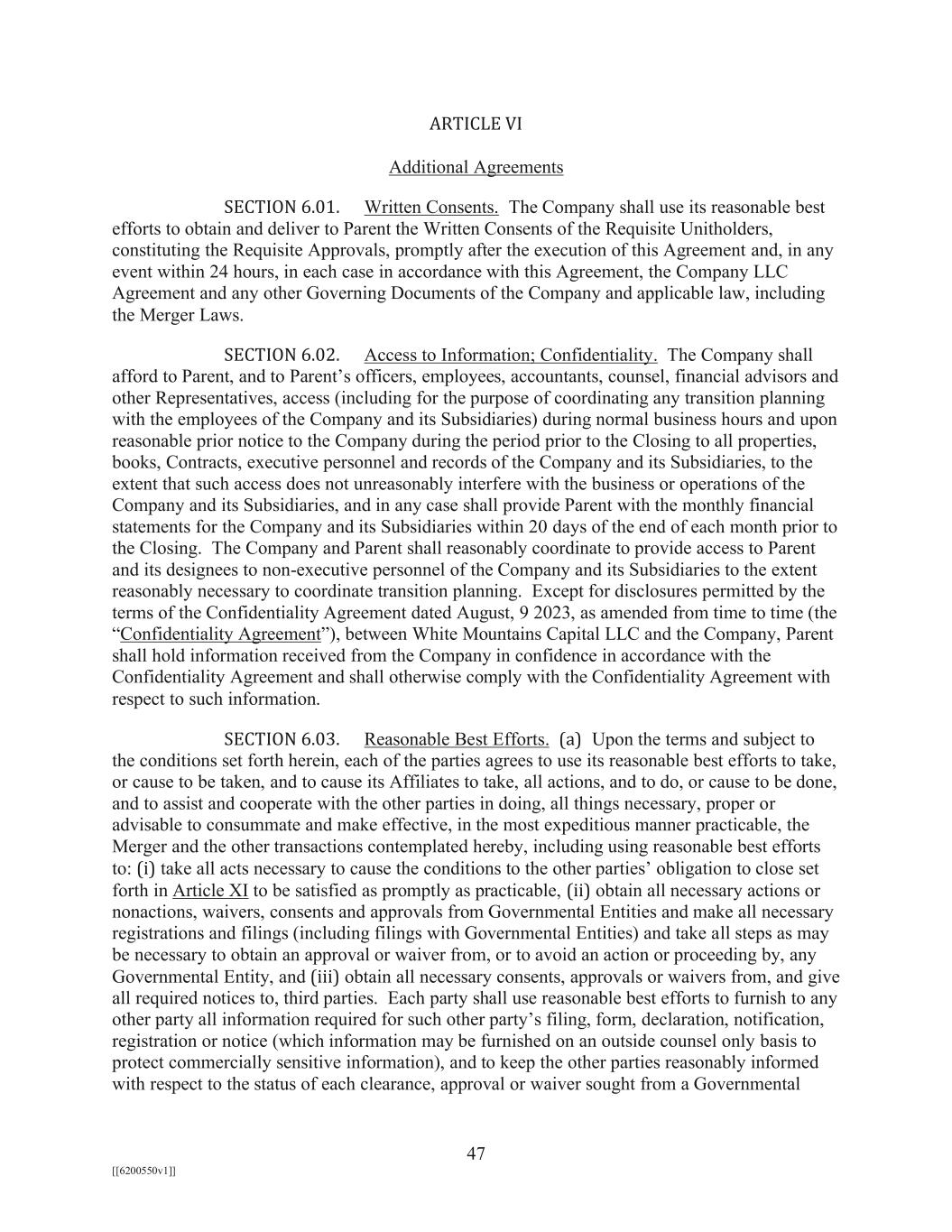 47 [[6200550v1]] Additional Agreements Written Consents. The Company shall use its reasonable best efforts to obtain and deliver to Parent the Written Consents of the Requisite Unitholders, constituting the Requisite Approvals, promptly after the execution of this Agreement and, in any event within 24 hours, in each case in accordance with this Agreement, the Company LLC Agreement and any other Governing Documents of the Company and applicable law, including the Merger Laws. Access to Information; Confidentiality. The Company shall afford to Parent, and to Parent’s officers, employees, accountants, counsel, financial advisors and other Representatives, access (including for the purpose of coordinating any transition planning with the employees of the Company and its Subsidiaries) during normal business hours and upon reasonable prior notice to the Company during the period prior to the Closing to all properties, books, Contracts, executive personnel and records of the Company and its Subsidiaries, to the extent that such access does not unreasonably interfere with the business or operations of the Company and its Subsidiaries, and in any case shall provide Parent with the monthly financial statements for the Company and its Subsidiaries within 20 days of the end of each month prior to the Closing. The Company and Parent shall reasonably coordinate to provide access to Parent and its designees to non-executive personnel of the Company and its Subsidiaries to the extent reasonably necessary to coordinate transition planning. Except for disclosures permitted by the terms of the Confidentiality Agreement dated August, 9 2023, as amended from time to time (the “Confidentiality Agreement”), between White Mountains Capital LLC and the Company, Parent shall hold information received from the Company in confidence in accordance with the Confidentiality Agreement and shall otherwise comply with the Confidentiality Agreement with respect to such information. Reasonable Best Efforts. Upon the terms and subject to the conditions set forth herein, each of the parties agrees to use its reasonable best efforts to take, or cause to be taken, and to cause its Affiliates to take, all actions, and to do, or cause to be done, and to assist and cooperate with the other parties in doing, all things necessary, proper or advisable to consummate and make effective, in the most expeditious manner practicable, the Merger and the other transactions contemplated hereby, including using reasonable best efforts to: take all acts necessary to cause the conditions to the other parties’ obligation to close set forth in Article XI to be satisfied as promptly as practicable, obtain all necessary actions or nonactions, waivers, consents and approvals from Governmental Entities and make all necessary registrations and filings (including filings with Governmental Entities) and take all steps as may be necessary to obtain an approval or waiver from, or to avoid an action or proceeding by, any Governmental Entity, and obtain all necessary consents, approvals or waivers from, and give all required notices to, third parties. Each party shall use reasonable best efforts to furnish to any other party all information required for such other party’s filing, form, declaration, notification, registration or notice (which information may be furnished on an outside counsel only basis to protect commercially sensitive information), and to keep the other parties reasonably informed with respect to the status of each clearance, approval or waiver sought from a Governmental