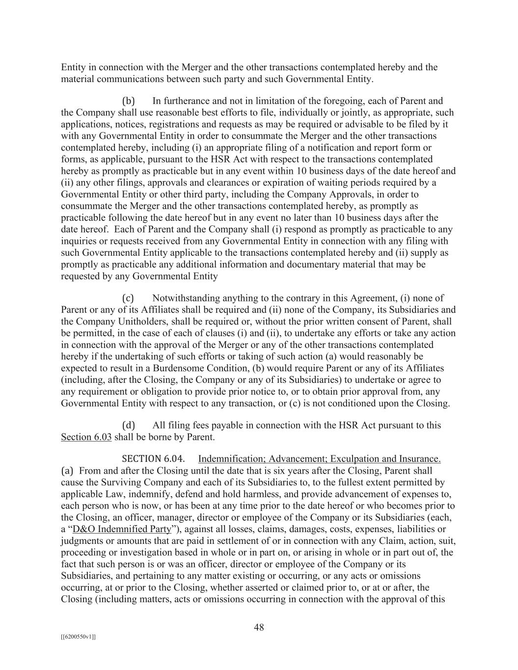 48 [[6200550v1]] Entity in connection with the Merger and the other transactions contemplated hereby and the material communications between such party and such Governmental Entity. In furtherance and not in limitation of the foregoing, each of Parent and the Company shall use reasonable best efforts to file, individually or jointly, as appropriate, such applications, notices, registrations and requests as may be required or advisable to be filed by it with any Governmental Entity in order to consummate the Merger and the other transactions contemplated hereby, including (i) an appropriate filing of a notification and report form or forms, as applicable, pursuant to the HSR Act with respect to the transactions contemplated hereby as promptly as practicable but in any event within 10 business days of the date hereof and (ii) any other filings, approvals and clearances or expiration of waiting periods required by a Governmental Entity or other third party, including the Company Approvals, in order to consummate the Merger and the other transactions contemplated hereby, as promptly as practicable following the date hereof but in any event no later than 10 business days after the date hereof. Each of Parent and the Company shall (i) respond as promptly as practicable to any inquiries or requests received from any Governmental Entity in connection with any filing with such Governmental Entity applicable to the transactions contemplated hereby and (ii) supply as promptly as practicable any additional information and documentary material that may be requested by any Governmental Entity Notwithstanding anything to the contrary in this Agreement, (i) none of Parent or any of its Affiliates shall be required and (ii) none of the Company, its Subsidiaries and the Company Unitholders, shall be required or, without the prior written consent of Parent, shall be permitted, in the case of each of clauses (i) and (ii), to undertake any efforts or take any action in connection with the approval of the Merger or any of the other transactions contemplated hereby if the undertaking of such efforts or taking of such action (a) would reasonably be expected to result in a Burdensome Condition, (b) would require Parent or any of its Affiliates (including, after the Closing, the Company or any of its Subsidiaries) to undertake or agree to any requirement or obligation to provide prior notice to, or to obtain prior approval from, any Governmental Entity with respect to any transaction, or (c) is not conditioned upon the Closing. All filing fees payable in connection with the HSR Act pursuant to this Section 6.03 shall be borne by Parent. Indemnification; Advancement; Exculpation and Insurance. From and after the Closing until the date that is six years after the Closing, Parent shall cause the Surviving Company and each of its Subsidiaries to, to the fullest extent permitted by applicable Law, indemnify, defend and hold harmless, and provide advancement of expenses to, each person who is now, or has been at any time prior to the date hereof or who becomes prior to the Closing, an officer, manager, director or employee of the Company or its Subsidiaries (each, a “D&O Indemnified Party”), against all losses, claims, damages, costs, expenses, liabilities or judgments or amounts that are paid in settlement of or in connection with any Claim, action, suit, proceeding or investigation based in whole or in part on, or arising in whole or in part out of, the fact that such person is or was an officer, director or employee of the Company or its Subsidiaries, and pertaining to any matter existing or occurring, or any acts or omissions occurring, at or prior to the Closing, whether asserted or claimed prior to, or at or after, the Closing (including matters, acts or omissions occurring in connection with the approval of this