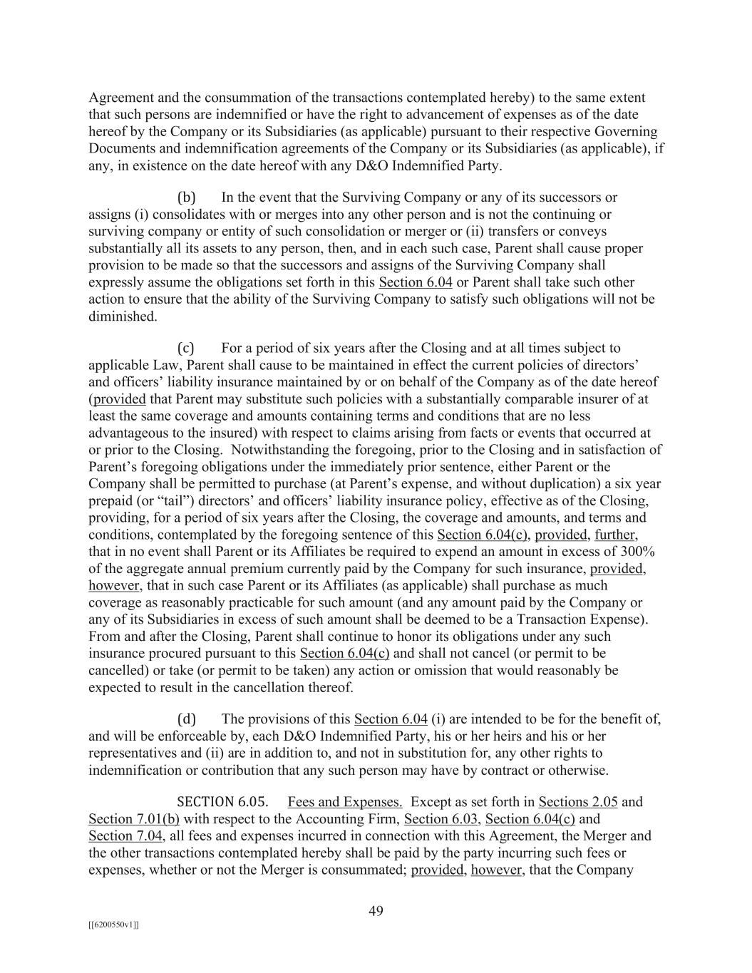 49 [[6200550v1]] Agreement and the consummation of the transactions contemplated hereby) to the same extent that such persons are indemnified or have the right to advancement of expenses as of the date hereof by the Company or its Subsidiaries (as applicable) pursuant to their respective Governing Documents and indemnification agreements of the Company or its Subsidiaries (as applicable), if any, in existence on the date hereof with any D&O Indemnified Party. In the event that the Surviving Company or any of its successors or assigns (i) consolidates with or merges into any other person and is not the continuing or surviving company or entity of such consolidation or merger or (ii) transfers or conveys substantially all its assets to any person, then, and in each such case, Parent shall cause proper provision to be made so that the successors and assigns of the Surviving Company shall expressly assume the obligations set forth in this Section 6.04 or Parent shall take such other action to ensure that the ability of the Surviving Company to satisfy such obligations will not be diminished. For a period of six years after the Closing and at all times subject to applicable Law, Parent shall cause to be maintained in effect the current policies of directors’ and officers’ liability insurance maintained by or on behalf of the Company as of the date hereof (provided that Parent may substitute such policies with a substantially comparable insurer of at least the same coverage and amounts containing terms and conditions that are no less advantageous to the insured) with respect to claims arising from facts or events that occurred at or prior to the Closing. Notwithstanding the foregoing, prior to the Closing and in satisfaction of Parent’s foregoing obligations under the immediately prior sentence, either Parent or the Company shall be permitted to purchase (at Parent’s expense, and without duplication) a six year prepaid (or “tail”) directors’ and officers’ liability insurance policy, effective as of the Closing, providing, for a period of six years after the Closing, the coverage and amounts, and terms and conditions, contemplated by the foregoing sentence of this Section 6.04(c), provided, further, that in no event shall Parent or its Affiliates be required to expend an amount in excess of 300% of the aggregate annual premium currently paid by the Company for such insurance, provided, however, that in such case Parent or its Affiliates (as applicable) shall purchase as much coverage as reasonably practicable for such amount (and any amount paid by the Company or any of its Subsidiaries in excess of such amount shall be deemed to be a Transaction Expense). From and after the Closing, Parent shall continue to honor its obligations under any such insurance procured pursuant to this Section 6.04(c) and shall not cancel (or permit to be cancelled) or take (or permit to be taken) any action or omission that would reasonably be expected to result in the cancellation thereof. The provisions of this Section 6.04 (i) are intended to be for the benefit of, and will be enforceable by, each D&O Indemnified Party, his or her heirs and his or her representatives and (ii) are in addition to, and not in substitution for, any other rights to indemnification or contribution that any such person may have by contract or otherwise. Fees and Expenses. Except as set forth in Sections 2.05 and Section 7.01(b) with respect to the Accounting Firm, Section 6.03, Section 6.04(c) and Section 7.04, all fees and expenses incurred in connection with this Agreement, the Merger and the other transactions contemplated hereby shall be paid by the party incurring such fees or expenses, whether or not the Merger is consummated; provided, however, that the Company