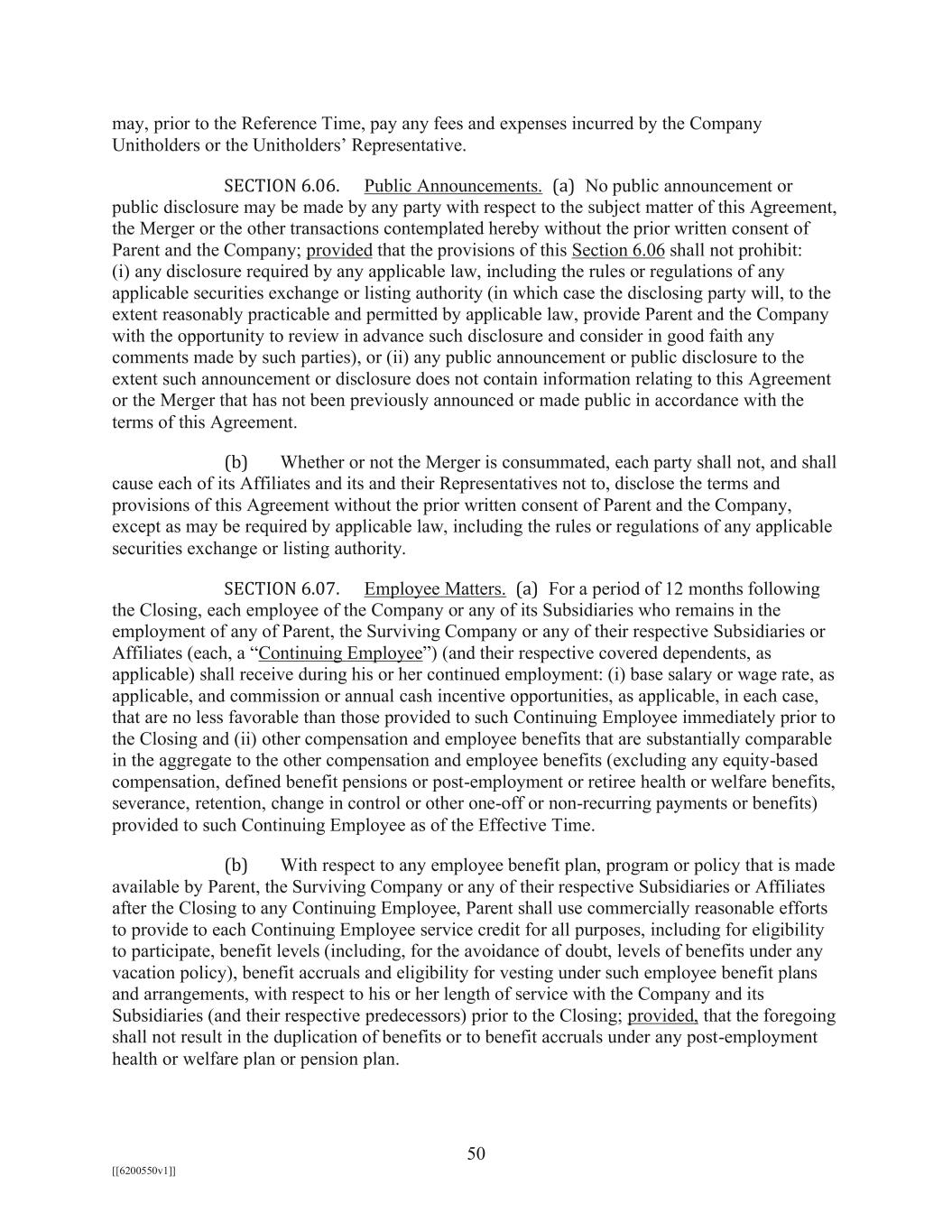 50 [[6200550v1]] may, prior to the Reference Time, pay any fees and expenses incurred by the Company Unitholders or the Unitholders’ Representative. Public Announcements. No public announcement or public disclosure may be made by any party with respect to the subject matter of this Agreement, the Merger or the other transactions contemplated hereby without the prior written consent of Parent and the Company; provided that the provisions of this Section 6.06 shall not prohibit: (i) any disclosure required by any applicable law, including the rules or regulations of any applicable securities exchange or listing authority (in which case the disclosing party will, to the extent reasonably practicable and permitted by applicable law, provide Parent and the Company with the opportunity to review in advance such disclosure and consider in good faith any comments made by such parties), or (ii) any public announcement or public disclosure to the extent such announcement or disclosure does not contain information relating to this Agreement or the Merger that has not been previously announced or made public in accordance with the terms of this Agreement. Whether or not the Merger is consummated, each party shall not, and shall cause each of its Affiliates and its and their Representatives not to, disclose the terms and provisions of this Agreement without the prior written consent of Parent and the Company, except as may be required by applicable law, including the rules or regulations of any applicable securities exchange or listing authority. Employee Matters. For a period of 12 months following the Closing, each employee of the Company or any of its Subsidiaries who remains in the employment of any of Parent, the Surviving Company or any of their respective Subsidiaries or Affiliates (each, a “Continuing Employee”) (and their respective covered dependents, as applicable) shall receive during his or her continued employment: (i) base salary or wage rate, as applicable, and commission or annual cash incentive opportunities, as applicable, in each case, that are no less favorable than those provided to such Continuing Employee immediately prior to the Closing and (ii) other compensation and employee benefits that are substantially comparable in the aggregate to the other compensation and employee benefits (excluding any equity-based compensation, defined benefit pensions or post-employment or retiree health or welfare benefits, severance, retention, change in control or other one-off or non-recurring payments or benefits) provided to such Continuing Employee as of the Effective Time. With respect to any employee benefit plan, program or policy that is made available by Parent, the Surviving Company or any of their respective Subsidiaries or Affiliates after the Closing to any Continuing Employee, Parent shall use commercially reasonable efforts to provide to each Continuing Employee service credit for all purposes, including for eligibility to participate, benefit levels (including, for the avoidance of doubt, levels of benefits under any vacation policy), benefit accruals and eligibility for vesting under such employee benefit plans and arrangements, with respect to his or her length of service with the Company and its Subsidiaries (and their respective predecessors) prior to the Closing; provided, that the foregoing shall not result in the duplication of benefits or to benefit accruals under any post-employment health or welfare plan or pension plan.