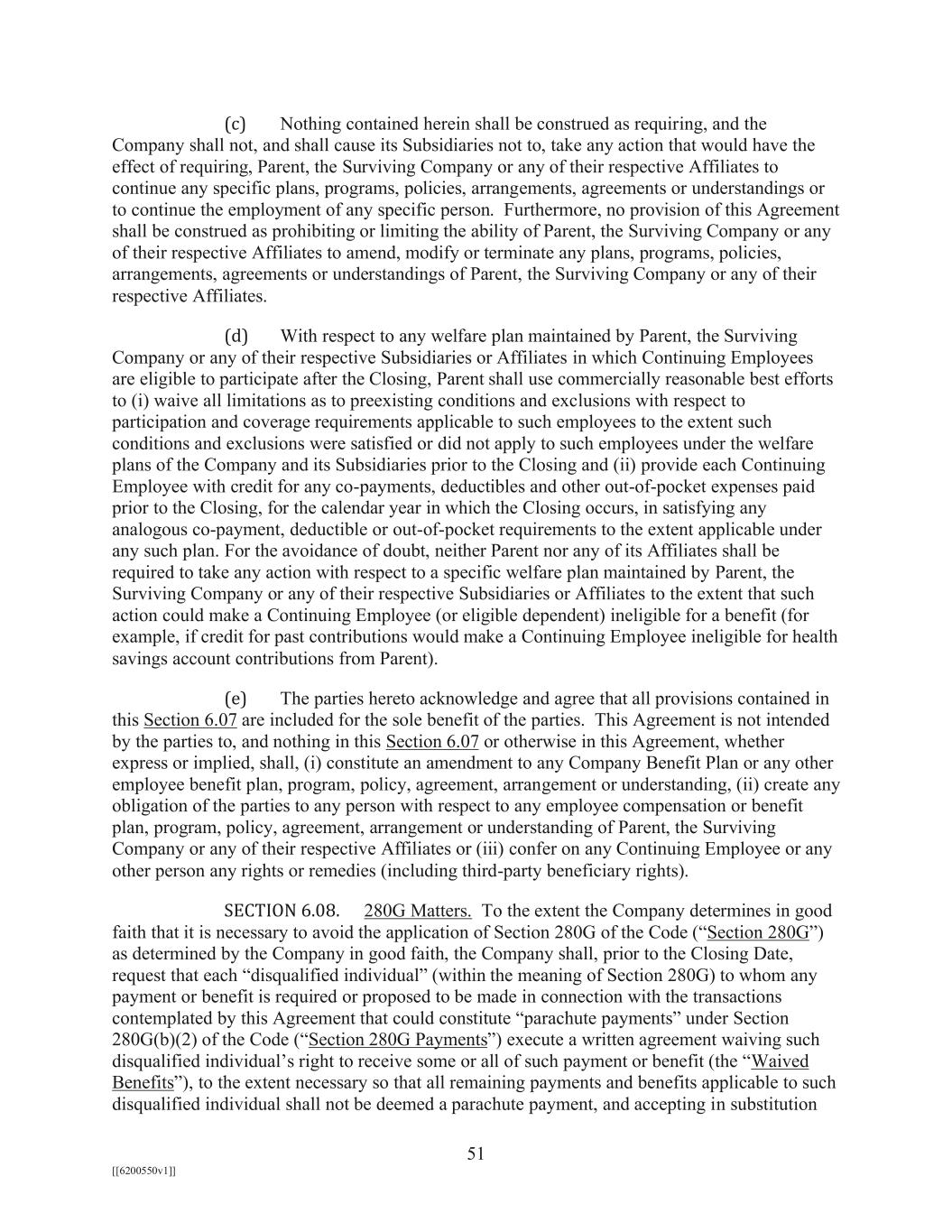 51 [[6200550v1]] Nothing contained herein shall be construed as requiring, and the Company shall not, and shall cause its Subsidiaries not to, take any action that would have the effect of requiring, Parent, the Surviving Company or any of their respective Affiliates to continue any specific plans, programs, policies, arrangements, agreements or understandings or to continue the employment of any specific person. Furthermore, no provision of this Agreement shall be construed as prohibiting or limiting the ability of Parent, the Surviving Company or any of their respective Affiliates to amend, modify or terminate any plans, programs, policies, arrangements, agreements or understandings of Parent, the Surviving Company or any of their respective Affiliates. With respect to any welfare plan maintained by Parent, the Surviving Company or any of their respective Subsidiaries or Affiliates in which Continuing Employees are eligible to participate after the Closing, Parent shall use commercially reasonable best efforts to (i) waive all limitations as to preexisting conditions and exclusions with respect to participation and coverage requirements applicable to such employees to the extent such conditions and exclusions were satisfied or did not apply to such employees under the welfare plans of the Company and its Subsidiaries prior to the Closing and (ii) provide each Continuing Employee with credit for any co‑payments, deductibles and other out-of-pocket expenses paid prior to the Closing, for the calendar year in which the Closing occurs, in satisfying any analogous co-payment, deductible or out‑of‑pocket requirements to the extent applicable under any such plan. For the avoidance of doubt, neither Parent nor any of its Affiliates shall be required to take any action with respect to a specific welfare plan maintained by Parent, the Surviving Company or any of their respective Subsidiaries or Affiliates to the extent that such action could make a Continuing Employee (or eligible dependent) ineligible for a benefit (for example, if credit for past contributions would make a Continuing Employee ineligible for health savings account contributions from Parent). The parties hereto acknowledge and agree that all provisions contained in this Section 6.07 are included for the sole benefit of the parties. This Agreement is not intended by the parties to, and nothing in this Section 6.07 or otherwise in this Agreement, whether express or implied, shall, (i) constitute an amendment to any Company Benefit Plan or any other employee benefit plan, program, policy, agreement, arrangement or understanding, (ii) create any obligation of the parties to any person with respect to any employee compensation or benefit plan, program, policy, agreement, arrangement or understanding of Parent, the Surviving Company or any of their respective Affiliates or (iii) confer on any Continuing Employee or any other person any rights or remedies (including third-party beneficiary rights). 280G Matters. To the extent the Company determines in good faith that it is necessary to avoid the application of Section 280G of the Code (“Section 280G”) as determined by the Company in good faith, the Company shall, prior to the Closing Date, request that each “disqualified individual” (within the meaning of Section 280G) to whom any payment or benefit is required or proposed to be made in connection with the transactions contemplated by this Agreement that could constitute “parachute payments” under Section 280G(b)(2) of the Code (“Section 280G Payments”) execute a written agreement waiving such disqualified individual’s right to receive some or all of such payment or benefit (the “Waived Benefits”), to the extent necessary so that all remaining payments and benefits applicable to such disqualified individual shall not be deemed a parachute payment, and accepting in substitution