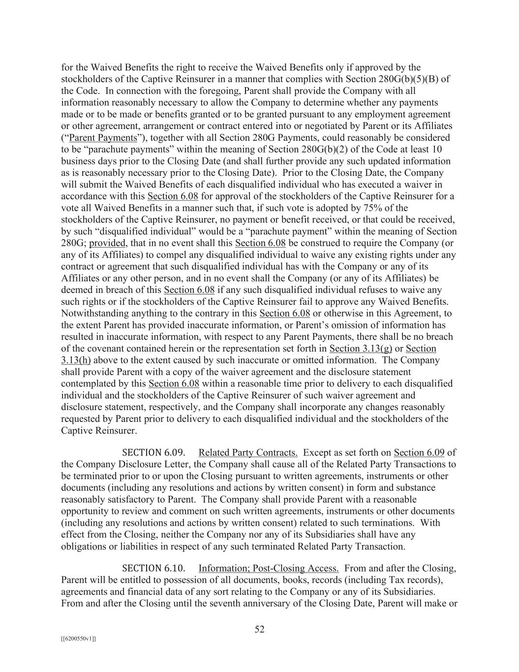 52 [[6200550v1]] for the Waived Benefits the right to receive the Waived Benefits only if approved by the stockholders of the Captive Reinsurer in a manner that complies with Section 280G(b)(5)(B) of the Code. In connection with the foregoing, Parent shall provide the Company with all information reasonably necessary to allow the Company to determine whether any payments made or to be made or benefits granted or to be granted pursuant to any employment agreement or other agreement, arrangement or contract entered into or negotiated by Parent or its Affiliates (“Parent Payments”), together with all Section 280G Payments, could reasonably be considered to be “parachute payments” within the meaning of Section 280G(b)(2) of the Code at least 10 business days prior to the Closing Date (and shall further provide any such updated information as is reasonably necessary prior to the Closing Date). Prior to the Closing Date, the Company will submit the Waived Benefits of each disqualified individual who has executed a waiver in accordance with this Section 6.08 for approval of the stockholders of the Captive Reinsurer for a vote all Waived Benefits in a manner such that, if such vote is adopted by 75% of the stockholders of the Captive Reinsurer, no payment or benefit received, or that could be received, by such “disqualified individual” would be a “parachute payment” within the meaning of Section 280G; provided, that in no event shall this Section 6.08 be construed to require the Company (or any of its Affiliates) to compel any disqualified individual to waive any existing rights under any contract or agreement that such disqualified individual has with the Company or any of its Affiliates or any other person, and in no event shall the Company (or any of its Affiliates) be deemed in breach of this Section 6.08 if any such disqualified individual refuses to waive any such rights or if the stockholders of the Captive Reinsurer fail to approve any Waived Benefits. Notwithstanding anything to the contrary in this Section 6.08 or otherwise in this Agreement, to the extent Parent has provided inaccurate information, or Parent’s omission of information has resulted in inaccurate information, with respect to any Parent Payments, there shall be no breach of the covenant contained herein or the representation set forth in Section 3.13(g) or Section 3.13(h) above to the extent caused by such inaccurate or omitted information. The Company shall provide Parent with a copy of the waiver agreement and the disclosure statement contemplated by this Section 6.08 within a reasonable time prior to delivery to each disqualified individual and the stockholders of the Captive Reinsurer of such waiver agreement and disclosure statement, respectively, and the Company shall incorporate any changes reasonably requested by Parent prior to delivery to each disqualified individual and the stockholders of the Captive Reinsurer. Related Party Contracts. Except as set forth on Section 6.09 of the Company Disclosure Letter, the Company shall cause all of the Related Party Transactions to be terminated prior to or upon the Closing pursuant to written agreements, instruments or other documents (including any resolutions and actions by written consent) in form and substance reasonably satisfactory to Parent. The Company shall provide Parent with a reasonable opportunity to review and comment on such written agreements, instruments or other documents (including any resolutions and actions by written consent) related to such terminations. With effect from the Closing, neither the Company nor any of its Subsidiaries shall have any obligations or liabilities in respect of any such terminated Related Party Transaction. Information; Post-Closing Access. From and after the Closing, Parent will be entitled to possession of all documents, books, records (including Tax records), agreements and financial data of any sort relating to the Company or any of its Subsidiaries. From and after the Closing until the seventh anniversary of the Closing Date, Parent will make or