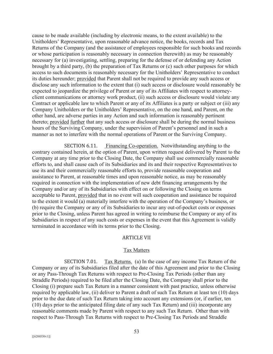 53 [[6200550v1]] cause to be made available (including by electronic means, to the extent available) to the Unitholders’ Representative, upon reasonable advance notice, the books, records and Tax Returns of the Company (and the assistance of employees responsible for such books and records or whose participation is reasonably necessary in connection therewith) as may be reasonably necessary for (a) investigating, settling, preparing for the defense of or defending any Action brought by a third party, (b) the preparation of Tax Returns or (c) such other purposes for which access to such documents is reasonably necessary for the Unitholders’ Representative to conduct its duties hereunder; provided that Parent shall not be required to provide any such access or disclose any such information to the extent that (i) such access or disclosure would reasonably be expected to jeopardize the privilege of Parent or any of its Affiliates with respect to attorney- client communications or attorney work product, (ii) such access or disclosure would violate any Contract or applicable law to which Parent or any of its Affiliates is a party or subject or (iii) any Company Unitholders or the Unitholders’ Representative, on the one hand, and Parent, on the other hand, are adverse parties in any Action and such information is reasonably pertinent thereto; provided further that any such access or disclosure shall be during the normal business hours of the Surviving Company, under the supervision of Parent’s personnel and in such a manner as not to interfere with the normal operations of Parent or the Surviving Company. Financing Co-operation. Notwithstanding anything to the contrary contained herein, at the option of Parent, upon written request delivered by Parent to the Company at any time prior to the Closing Date, the Company shall use commercially reasonable efforts to, and shall cause each of its Subsidiaries and its and their respective Representatives to use its and their commercially reasonable efforts to, provide reasonable cooperation and assistance to Parent, at reasonable times and upon reasonable notice, as may be reasonably required in connection with the implementation of new debt financing arrangements by the Company and/or any of its Subsidiaries with effect on or following the Closing on terms acceptable to Parent, provided that in no event will such cooperation and assistance be required to the extent it would (a) materially interfere with the operation of the Company’s business, or (b) require the Company or any of its Subsidiaries to incur any out-of-pocket costs or expenses prior to the Closing, unless Parent has agreed in writing to reimburse the Company or any of its Subsidiaries in respect of any such costs or expenses in the event that this Agreement is validly terminated in accordance with its terms prior to the Closing. Tax Matters Tax Returns. (a) In the case of any income Tax Return of the Company or any of its Subsidiaries filed after the date of this Agreement and prior to the Closing or any Pass-Through Tax Returns with respect to Pre-Closing Tax Periods (other than any Straddle Periods) required to be filed after the Closing Date, the Company shall prior to the Closing (i) prepare such Tax Return in a manner consistent with past practice, unless otherwise required by applicable law, (ii) deliver to Parent a draft of such Tax Return at least ten (10) days prior to the due date of such Tax Return taking into account any extensions (or, if earlier, ten (10) days prior to the anticipated filing date of any such Tax Return) and (iii) incorporate any reasonable comments made by Parent with respect to any such Tax Return. Other than with respect to Pass-Through Tax Returns with respect to Pre-Closing Tax Periods and Straddle
