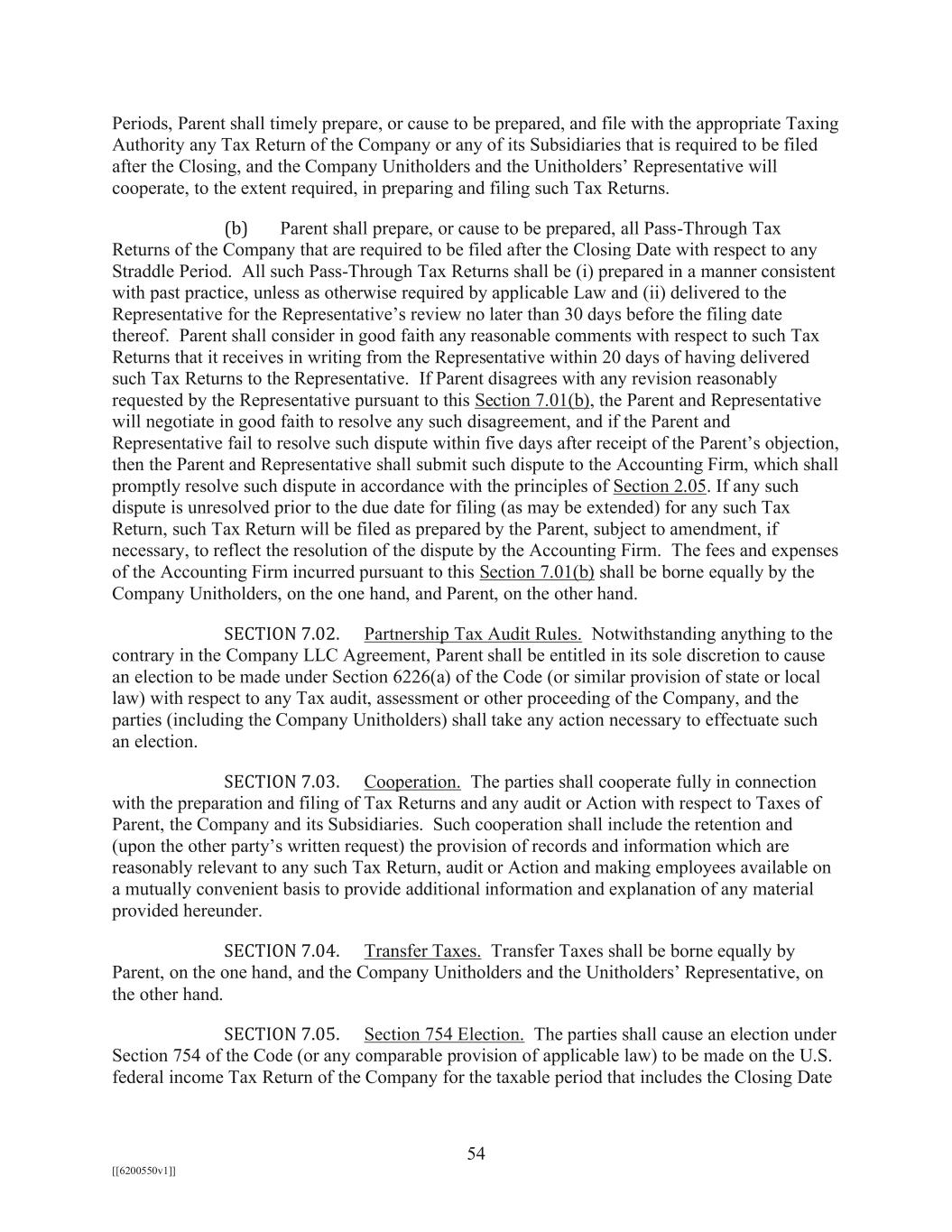 54 [[6200550v1]] Periods, Parent shall timely prepare, or cause to be prepared, and file with the appropriate Taxing Authority any Tax Return of the Company or any of its Subsidiaries that is required to be filed after the Closing, and the Company Unitholders and the Unitholders’ Representative will cooperate, to the extent required, in preparing and filing such Tax Returns. Parent shall prepare, or cause to be prepared, all Pass-Through Tax Returns of the Company that are required to be filed after the Closing Date with respect to any Straddle Period. All such Pass-Through Tax Returns shall be (i) prepared in a manner consistent with past practice, unless as otherwise required by applicable Law and (ii) delivered to the Representative for the Representative’s review no later than 30 days before the filing date thereof. Parent shall consider in good faith any reasonable comments with respect to such Tax Returns that it receives in writing from the Representative within 20 days of having delivered such Tax Returns to the Representative. If Parent disagrees with any revision reasonably requested by the Representative pursuant to this Section 7.01(b), the Parent and Representative will negotiate in good faith to resolve any such disagreement, and if the Parent and Representative fail to resolve such dispute within five days after receipt of the Parent’s objection, then the Parent and Representative shall submit such dispute to the Accounting Firm, which shall promptly resolve such dispute in accordance with the principles of Section 2.05. If any such dispute is unresolved prior to the due date for filing (as may be extended) for any such Tax Return, such Tax Return will be filed as prepared by the Parent, subject to amendment, if necessary, to reflect the resolution of the dispute by the Accounting Firm. The fees and expenses of the Accounting Firm incurred pursuant to this Section 7.01(b) shall be borne equally by the Company Unitholders, on the one hand, and Parent, on the other hand. Partnership Tax Audit Rules. Notwithstanding anything to the contrary in the Company LLC Agreement, Parent shall be entitled in its sole discretion to cause an election to be made under Section 6226(a) of the Code (or similar provision of state or local law) with respect to any Tax audit, assessment or other proceeding of the Company, and the parties (including the Company Unitholders) shall take any action necessary to effectuate such an election. Cooperation. The parties shall cooperate fully in connection with the preparation and filing of Tax Returns and any audit or Action with respect to Taxes of Parent, the Company and its Subsidiaries. Such cooperation shall include the retention and (upon the other party’s written request) the provision of records and information which are reasonably relevant to any such Tax Return, audit or Action and making employees available on a mutually convenient basis to provide additional information and explanation of any material provided hereunder. Transfer Taxes. Transfer Taxes shall be borne equally by Parent, on the one hand, and the Company Unitholders and the Unitholders’ Representative, on the other hand. Section 754 Election. The parties shall cause an election under Section 754 of the Code (or any comparable provision of applicable law) to be made on the U.S. federal income Tax Return of the Company for the taxable period that includes the Closing Date
