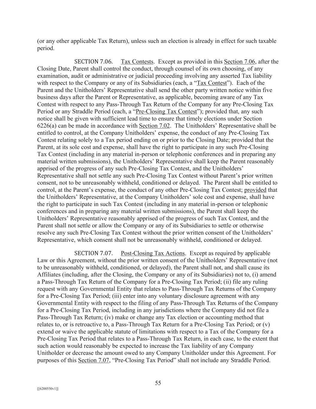 55 [[6200550v1]] (or any other applicable Tax Return), unless such an election is already in effect for such taxable period. Tax Contests. Except as provided in this Section 7.06, after the Closing Date, Parent shall control the conduct, through counsel of its own choosing, of any examination, audit or administrative or judicial proceeding involving any asserted Tax liability with respect to the Company or any of its Subsidiaries (each, a “Tax Contest”). Each of the Parent and the Unitholders’ Representative shall send the other party written notice within five business days after the Parent or Representative, as applicable, becoming aware of any Tax Contest with respect to any Pass-Through Tax Return of the Company for any Pre-Closing Tax Period or any Straddle Period (each, a “Pre-Closing Tax Contest”); provided that, any such notice shall be given with sufficient lead time to ensure that timely elections under Section 6226(a) can be made in accordance with Section 7.02. The Unitholders’ Representative shall be entitled to control, at the Company Unitholders’ expense, the conduct of any Pre-Closing Tax Contest relating solely to a Tax period ending on or prior to the Closing Date; provided that the Parent, at its sole cost and expense, shall have the right to participate in any such Pre-Closing Tax Contest (including in any material in-person or telephonic conferences and in preparing any material written submissions), the Unitholders’ Representative shall keep the Parent reasonably apprised of the progress of any such Pre-Closing Tax Contest, and the Unitholders’ Representative shall not settle any such Pre-Closing Tax Contest without Parent’s prior written consent, not to be unreasonably withheld, conditioned or delayed. The Parent shall be entitled to control, at the Parent’s expense, the conduct of any other Pre-Closing Tax Contest; provided that the Unitholders’ Representative, at the Company Unitholders’ sole cost and expense, shall have the right to participate in such Tax Contest (including in any material in-person or telephonic conferences and in preparing any material written submissions), the Parent shall keep the Unitholders’ Representative reasonably apprised of the progress of such Tax Contest, and the Parent shall not settle or allow the Company or any of its Subsidiaries to settle or otherwise resolve any such Pre-Closing Tax Contest without the prior written consent of the Unitholders’ Representative, which consent shall not be unreasonably withheld, conditioned or delayed. Post-Closing Tax Actions. Except as required by applicable Law or this Agreement, without the prior written consent of the Unitholders’ Representative (not to be unreasonably withheld, conditioned, or delayed), the Parent shall not, and shall cause its Affiliates (including, after the Closing, the Company or any of its Subsidiaries) not to, (i) amend a Pass-Through Tax Return of the Company for a Pre-Closing Tax Period; (ii) file any ruling request with any Governmental Entity that relates to Pass-Through Tax Returns of the Company for a Pre-Closing Tax Period; (iii) enter into any voluntary disclosure agreement with any Governmental Entity with respect to the filing of any Pass-Through Tax Returns of the Company for a Pre-Closing Tax Period, including in any jurisdictions where the Company did not file a Pass-Through Tax Return; (iv) make or change any Tax election or accounting method that relates to, or is retroactive to, a Pass-Through Tax Return for a Pre-Closing Tax Period; or (v) extend or waive the applicable statute of limitations with respect to a Tax of the Company for a Pre-Closing Tax Period that relates to a Pass-Through Tax Return, in each case, to the extent that such action would reasonably be expected to increase the Tax liability of any Company Unitholder or decrease the amount owed to any Company Unitholder under this Agreement. For purposes of this Section 7.07, “Pre-Closing Tax Period” shall not include any Straddle Period.