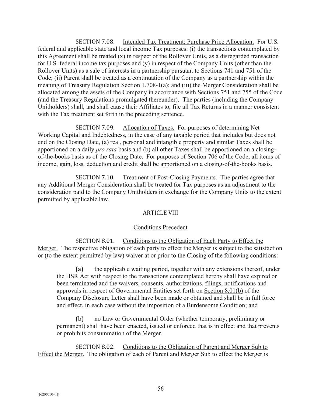 56 [[6200550v1]] Intended Tax Treatment; Purchase Price Allocation. For U.S. federal and applicable state and local income Tax purposes: (i) the transactions contemplated by this Agreement shall be treated (x) in respect of the Rollover Units, as a disregarded transaction for U.S. federal income tax purposes and (y) in respect of the Company Units (other than the Rollover Units) as a sale of interests in a partnership pursuant to Sections 741 and 751 of the Code; (ii) Parent shall be treated as a continuation of the Company as a partnership within the meaning of Treasury Regulation Section 1.708‑1(a); and (iii) the Merger Consideration shall be allocated among the assets of the Company in accordance with Sections 751 and 755 of the Code (and the Treasury Regulations promulgated thereunder). The parties (including the Company Unitholders) shall, and shall cause their Affiliates to, file all Tax Returns in a manner consistent with the Tax treatment set forth in the preceding sentence. Allocation of Taxes. For purposes of determining Net Working Capital and Indebtedness, in the case of any taxable period that includes but does not end on the Closing Date, (a) real, personal and intangible property and similar Taxes shall be apportioned on a daily pro rata basis and (b) all other Taxes shall be apportioned on a closing- of-the-books basis as of the Closing Date. For purposes of Section 706 of the Code, all items of income, gain, loss, deduction and credit shall be apportioned on a closing-of-the-books basis. Treatment of Post-Closing Payments. The parties agree that any Additional Merger Consideration shall be treated for Tax purposes as an adjustment to the consideration paid to the Company Unitholders in exchange for the Company Units to the extent permitted by applicable law. Conditions Precedent Conditions to the Obligation of Each Party to Effect the Merger. The respective obligation of each party to effect the Merger is subject to the satisfaction or (to the extent permitted by law) waiver at or prior to the Closing of the following conditions: the applicable waiting period, together with any extensions thereof, under the HSR Act with respect to the transactions contemplated hereby shall have expired or been terminated and the waivers, consents, authorizations, filings, notifications and approvals in respect of Governmental Entities set forth on Section 8.01(b) of the Company Disclosure Letter shall have been made or obtained and shall be in full force and effect, in each case without the imposition of a Burdensome Condition; and no Law or Governmental Order (whether temporary, preliminary or permanent) shall have been enacted, issued or enforced that is in effect and that prevents or prohibits consummation of the Merger. Conditions to the Obligation of Parent and Merger Sub to Effect the Merger. The obligation of each of Parent and Merger Sub to effect the Merger is