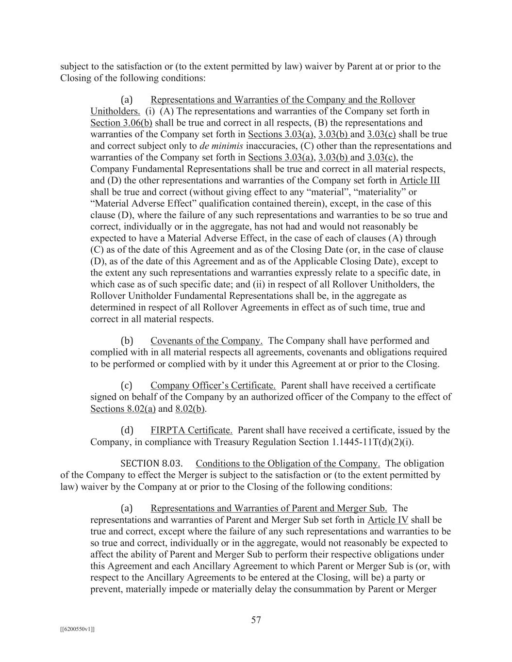57 [[6200550v1]] subject to the satisfaction or (to the extent permitted by law) waiver by Parent at or prior to the Closing of the following conditions: Representations and Warranties of the Company and the Rollover Unitholders. (i) (A) The representations and warranties of the Company set forth in Section 3.06(b) shall be true and correct in all respects, (B) the representations and warranties of the Company set forth in Sections 3.03(a), 3.03(b) and 3.03(c) shall be true and correct subject only to de minimis inaccuracies, (C) other than the representations and warranties of the Company set forth in Sections 3.03(a), 3.03(b) and 3.03(c), the Company Fundamental Representations shall be true and correct in all material respects, and (D) the other representations and warranties of the Company set forth in Article III shall be true and correct (without giving effect to any “material”, “materiality” or “Material Adverse Effect” qualification contained therein), except, in the case of this clause (D), where the failure of any such representations and warranties to be so true and correct, individually or in the aggregate, has not had and would not reasonably be expected to have a Material Adverse Effect, in the case of each of clauses (A) through (C) as of the date of this Agreement and as of the Closing Date (or, in the case of clause (D), as of the date of this Agreement and as of the Applicable Closing Date), except to the extent any such representations and warranties expressly relate to a specific date, in which case as of such specific date; and (ii) in respect of all Rollover Unitholders, the Rollover Unitholder Fundamental Representations shall be, in the aggregate as determined in respect of all Rollover Agreements in effect as of such time, true and correct in all material respects. Covenants of the Company. The Company shall have performed and complied with in all material respects all agreements, covenants and obligations required to be performed or complied with by it under this Agreement at or prior to the Closing. Company Officer’s Certificate. Parent shall have received a certificate signed on behalf of the Company by an authorized officer of the Company to the effect of Sections 8.02(a) and 8.02(b). FIRPTA Certificate. Parent shall have received a certificate, issued by the Company, in compliance with Treasury Regulation Section 1.1445‑11T(d)(2)(i). Conditions to the Obligation of the Company. The obligation of the Company to effect the Merger is subject to the satisfaction or (to the extent permitted by law) waiver by the Company at or prior to the Closing of the following conditions: Representations and Warranties of Parent and Merger Sub. The representations and warranties of Parent and Merger Sub set forth in Article IV shall be true and correct, except where the failure of any such representations and warranties to be so true and correct, individually or in the aggregate, would not reasonably be expected to affect the ability of Parent and Merger Sub to perform their respective obligations under this Agreement and each Ancillary Agreement to which Parent or Merger Sub is (or, with respect to the Ancillary Agreements to be entered at the Closing, will be) a party or prevent, materially impede or materially delay the consummation by Parent or Merger