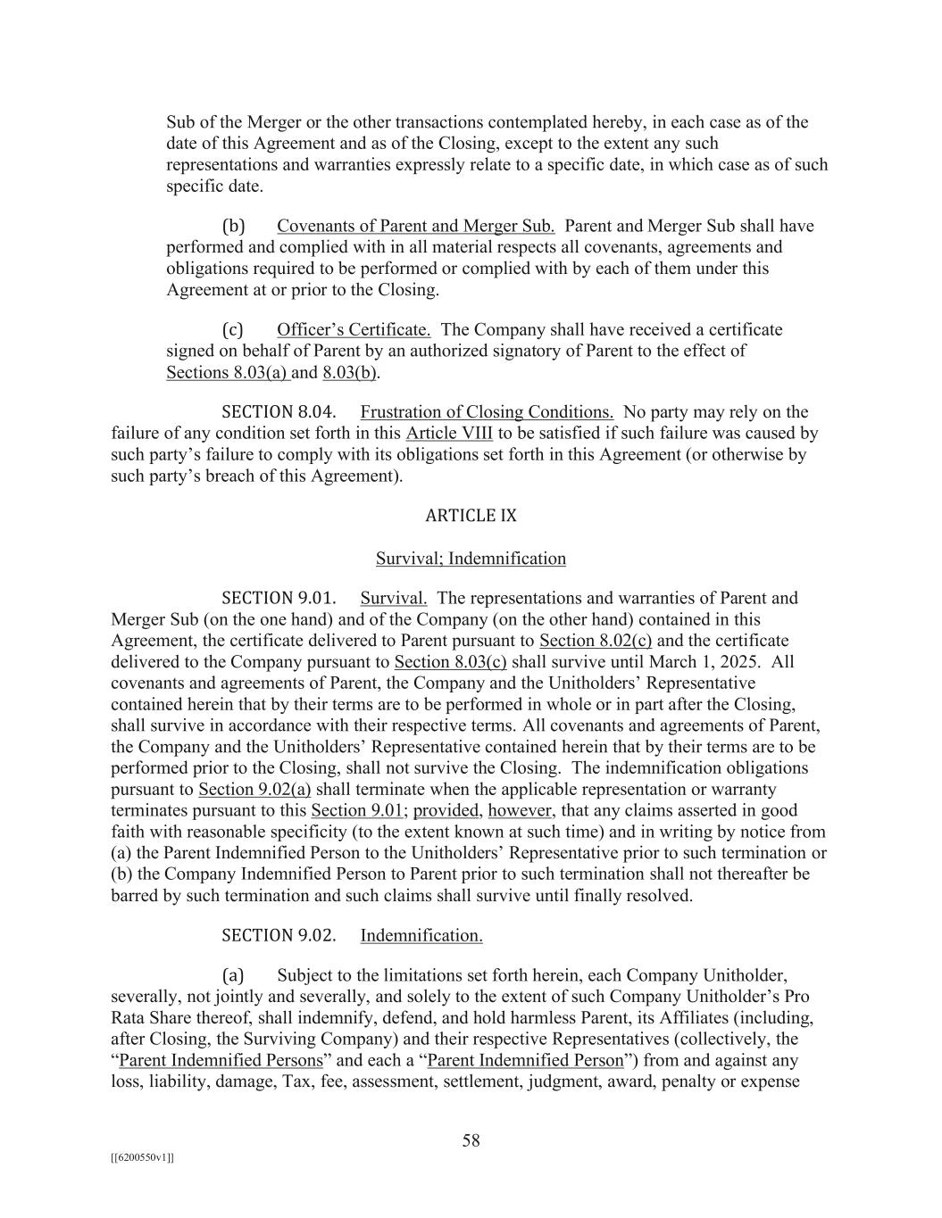 58 [[6200550v1]] Sub of the Merger or the other transactions contemplated hereby, in each case as of the date of this Agreement and as of the Closing, except to the extent any such representations and warranties expressly relate to a specific date, in which case as of such specific date. Covenants of Parent and Merger Sub. Parent and Merger Sub shall have performed and complied with in all material respects all covenants, agreements and obligations required to be performed or complied with by each of them under this Agreement at or prior to the Closing. Officer’s Certificate. The Company shall have received a certificate signed on behalf of Parent by an authorized signatory of Parent to the effect of Sections 8.03(a) and 8.03(b). Frustration of Closing Conditions. No party may rely on the failure of any condition set forth in this Article VIII to be satisfied if such failure was caused by such party’s failure to comply with its obligations set forth in this Agreement (or otherwise by such party’s breach of this Agreement). Survival; Indemnification Survival. The representations and warranties of Parent and Merger Sub (on the one hand) and of the Company (on the other hand) contained in this Agreement, the certificate delivered to Parent pursuant to Section 8.02(c) and the certificate delivered to the Company pursuant to Section 8.03(c) shall survive until March 1, 2025. All covenants and agreements of Parent, the Company and the Unitholders’ Representative contained herein that by their terms are to be performed in whole or in part after the Closing, shall survive in accordance with their respective terms. All covenants and agreements of Parent, the Company and the Unitholders’ Representative contained herein that by their terms are to be performed prior to the Closing, shall not survive the Closing. The indemnification obligations pursuant to Section 9.02(a) shall terminate when the applicable representation or warranty terminates pursuant to this Section 9.01; provided, however, that any claims asserted in good faith with reasonable specificity (to the extent known at such time) and in writing by notice from (a) the Parent Indemnified Person to the Unitholders’ Representative prior to such termination or (b) the Company Indemnified Person to Parent prior to such termination shall not thereafter be barred by such termination and such claims shall survive until finally resolved. Indemnification. Subject to the limitations set forth herein, each Company Unitholder, severally, not jointly and severally, and solely to the extent of such Company Unitholder’s Pro Rata Share thereof, shall indemnify, defend, and hold harmless Parent, its Affiliates (including, after Closing, the Surviving Company) and their respective Representatives (collectively, the “Parent Indemnified Persons” and each a “Parent Indemnified Person”) from and against any loss, liability, damage, Tax, fee, assessment, settlement, judgment, award, penalty or expense
