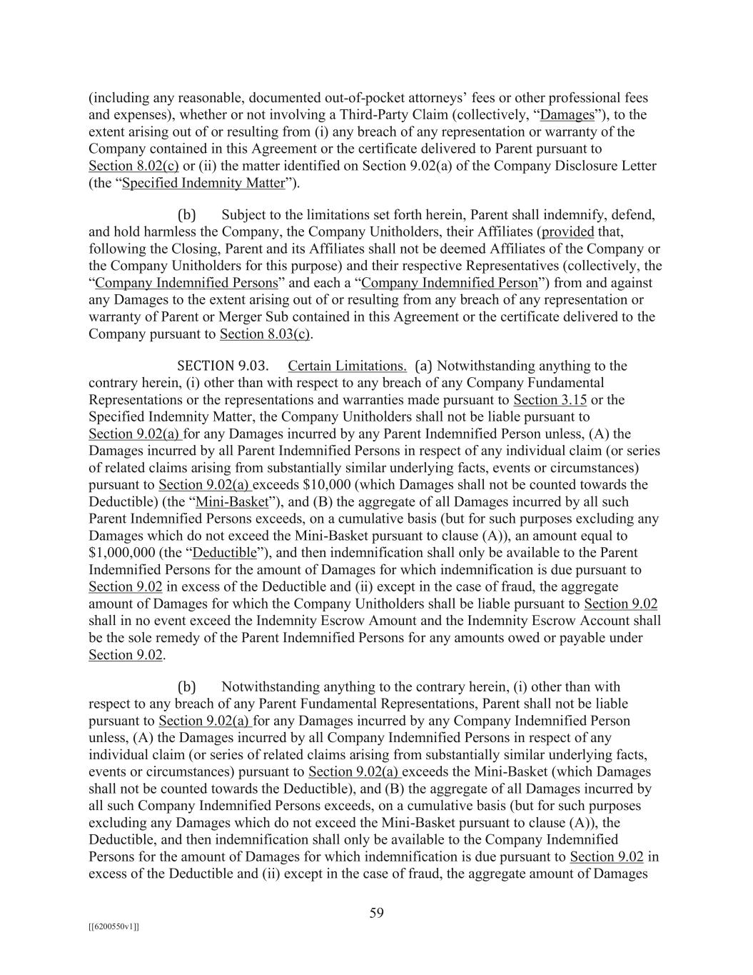 59 [[6200550v1]] (including any reasonable, documented out-of-pocket attorneys’ fees or other professional fees and expenses), whether or not involving a Third-Party Claim (collectively, “Damages”), to the extent arising out of or resulting from (i) any breach of any representation or warranty of the Company contained in this Agreement or the certificate delivered to Parent pursuant to Section 8.02(c) or (ii) the matter identified on Section 9.02(a) of the Company Disclosure Letter (the “Specified Indemnity Matter”). Subject to the limitations set forth herein, Parent shall indemnify, defend, and hold harmless the Company, the Company Unitholders, their Affiliates (provided that, following the Closing, Parent and its Affiliates shall not be deemed Affiliates of the Company or the Company Unitholders for this purpose) and their respective Representatives (collectively, the “Company Indemnified Persons” and each a “Company Indemnified Person”) from and against any Damages to the extent arising out of or resulting from any breach of any representation or warranty of Parent or Merger Sub contained in this Agreement or the certificate delivered to the Company pursuant to Section 8.03(c). Certain Limitations. Notwithstanding anything to the contrary herein, (i) other than with respect to any breach of any Company Fundamental Representations or the representations and warranties made pursuant to Section 3.15 or the Specified Indemnity Matter, the Company Unitholders shall not be liable pursuant to Section 9.02(a) for any Damages incurred by any Parent Indemnified Person unless, (A) the Damages incurred by all Parent Indemnified Persons in respect of any individual claim (or series of related claims arising from substantially similar underlying facts, events or circumstances) pursuant to Section 9.02(a) exceeds $10,000 (which Damages shall not be counted towards the Deductible) (the “Mini-Basket”), and (B) the aggregate of all Damages incurred by all such Parent Indemnified Persons exceeds, on a cumulative basis (but for such purposes excluding any Damages which do not exceed the Mini-Basket pursuant to clause (A)), an amount equal to $1,000,000 (the “Deductible”), and then indemnification shall only be available to the Parent Indemnified Persons for the amount of Damages for which indemnification is due pursuant to Section 9.02 in excess of the Deductible and (ii) except in the case of fraud, the aggregate amount of Damages for which the Company Unitholders shall be liable pursuant to Section 9.02 shall in no event exceed the Indemnity Escrow Amount and the Indemnity Escrow Account shall be the sole remedy of the Parent Indemnified Persons for any amounts owed or payable under Section 9.02. Notwithstanding anything to the contrary herein, (i) other than with respect to any breach of any Parent Fundamental Representations, Parent shall not be liable pursuant to Section 9.02(a) for any Damages incurred by any Company Indemnified Person unless, (A) the Damages incurred by all Company Indemnified Persons in respect of any individual claim (or series of related claims arising from substantially similar underlying facts, events or circumstances) pursuant to Section 9.02(a) exceeds the Mini-Basket (which Damages shall not be counted towards the Deductible), and (B) the aggregate of all Damages incurred by all such Company Indemnified Persons exceeds, on a cumulative basis (but for such purposes excluding any Damages which do not exceed the Mini-Basket pursuant to clause (A)), the Deductible, and then indemnification shall only be available to the Company Indemnified Persons for the amount of Damages for which indemnification is due pursuant to Section 9.02 in excess of the Deductible and (ii) except in the case of fraud, the aggregate amount of Damages
