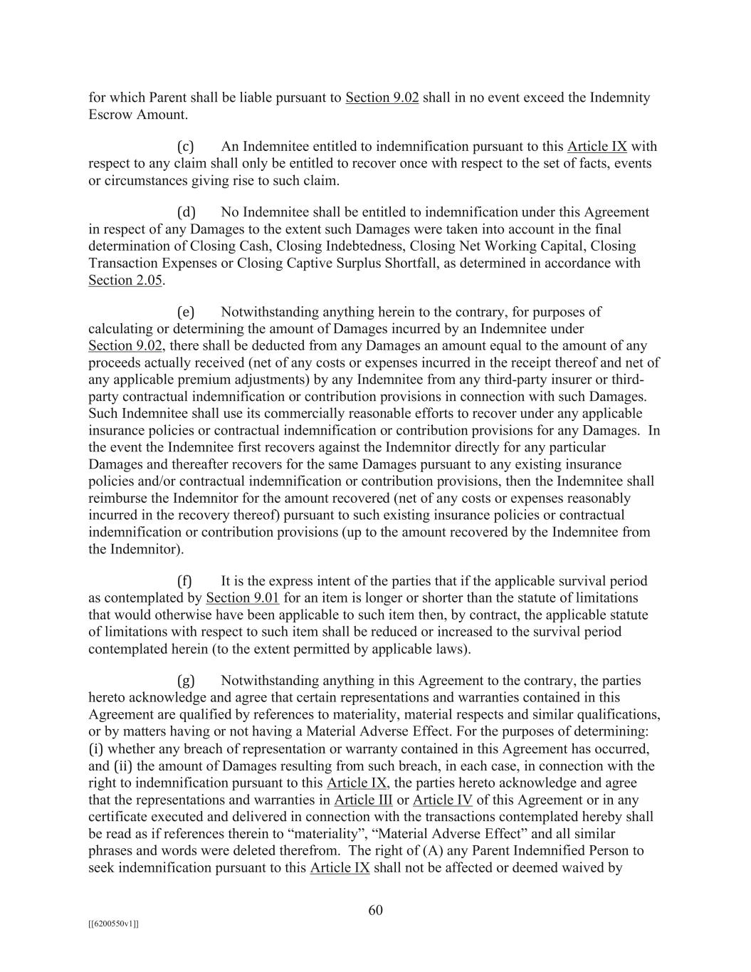 60 [[6200550v1]] for which Parent shall be liable pursuant to Section 9.02 shall in no event exceed the Indemnity Escrow Amount. An Indemnitee entitled to indemnification pursuant to this Article IX with respect to any claim shall only be entitled to recover once with respect to the set of facts, events or circumstances giving rise to such claim. No Indemnitee shall be entitled to indemnification under this Agreement in respect of any Damages to the extent such Damages were taken into account in the final determination of Closing Cash, Closing Indebtedness, Closing Net Working Capital, Closing Transaction Expenses or Closing Captive Surplus Shortfall, as determined in accordance with Section 2.05. Notwithstanding anything herein to the contrary, for purposes of calculating or determining the amount of Damages incurred by an Indemnitee under Section 9.02, there shall be deducted from any Damages an amount equal to the amount of any proceeds actually received (net of any costs or expenses incurred in the receipt thereof and net of any applicable premium adjustments) by any Indemnitee from any third-party insurer or third- party contractual indemnification or contribution provisions in connection with such Damages. Such Indemnitee shall use its commercially reasonable efforts to recover under any applicable insurance policies or contractual indemnification or contribution provisions for any Damages. In the event the Indemnitee first recovers against the Indemnitor directly for any particular Damages and thereafter recovers for the same Damages pursuant to any existing insurance policies and/or contractual indemnification or contribution provisions, then the Indemnitee shall reimburse the Indemnitor for the amount recovered (net of any costs or expenses reasonably incurred in the recovery thereof) pursuant to such existing insurance policies or contractual indemnification or contribution provisions (up to the amount recovered by the Indemnitee from the Indemnitor). It is the express intent of the parties that if the applicable survival period as contemplated by Section 9.01 for an item is longer or shorter than the statute of limitations that would otherwise have been applicable to such item then, by contract, the applicable statute of limitations with respect to such item shall be reduced or increased to the survival period contemplated herein (to the extent permitted by applicable laws). Notwithstanding anything in this Agreement to the contrary, the parties hereto acknowledge and agree that certain representations and warranties contained in this Agreement are qualified by references to materiality, material respects and similar qualifications, or by matters having or not having a Material Adverse Effect. For the purposes of determining: whether any breach of representation or warranty contained in this Agreement has occurred, and the amount of Damages resulting from such breach, in each case, in connection with the right to indemnification pursuant to this Article IX, the parties hereto acknowledge and agree that the representations and warranties in Article III or Article IV of this Agreement or in any certificate executed and delivered in connection with the transactions contemplated hereby shall be read as if references therein to “materiality”, “Material Adverse Effect” and all similar phrases and words were deleted therefrom. The right of (A) any Parent Indemnified Person to seek indemnification pursuant to this Article IX shall not be affected or deemed waived by