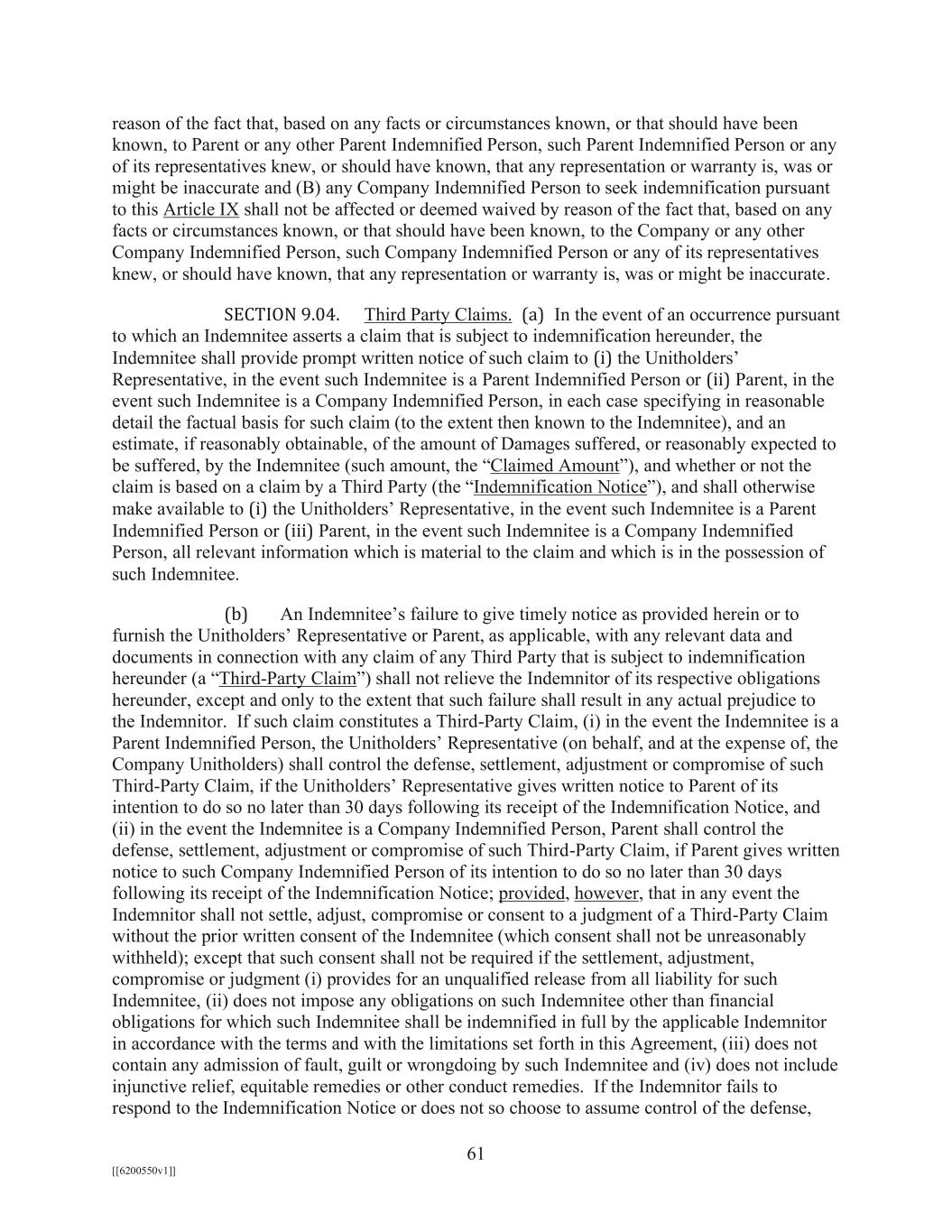 61 [[6200550v1]] reason of the fact that, based on any facts or circumstances known, or that should have been known, to Parent or any other Parent Indemnified Person, such Parent Indemnified Person or any of its representatives knew, or should have known, that any representation or warranty is, was or might be inaccurate and (B) any Company Indemnified Person to seek indemnification pursuant to this Article IX shall not be affected or deemed waived by reason of the fact that, based on any facts or circumstances known, or that should have been known, to the Company or any other Company Indemnified Person, such Company Indemnified Person or any of its representatives knew, or should have known, that any representation or warranty is, was or might be inaccurate. Third Party Claims. In the event of an occurrence pursuant to which an Indemnitee asserts a claim that is subject to indemnification hereunder, the Indemnitee shall provide prompt written notice of such claim to the Unitholders’ Representative, in the event such Indemnitee is a Parent Indemnified Person or Parent, in the event such Indemnitee is a Company Indemnified Person, in each case specifying in reasonable detail the factual basis for such claim (to the extent then known to the Indemnitee), and an estimate, if reasonably obtainable, of the amount of Damages suffered, or reasonably expected to be suffered, by the Indemnitee (such amount, the “Claimed Amount”), and whether or not the claim is based on a claim by a Third Party (the “Indemnification Notice”), and shall otherwise make available to the Unitholders’ Representative, in the event such Indemnitee is a Parent Indemnified Person or Parent, in the event such Indemnitee is a Company Indemnified Person, all relevant information which is material to the claim and which is in the possession of such Indemnitee. An Indemnitee’s failure to give timely notice as provided herein or to furnish the Unitholders’ Representative or Parent, as applicable, with any relevant data and documents in connection with any claim of any Third Party that is subject to indemnification hereunder (a “Third-Party Claim”) shall not relieve the Indemnitor of its respective obligations hereunder, except and only to the extent that such failure shall result in any actual prejudice to the Indemnitor. If such claim constitutes a Third-Party Claim, (i) in the event the Indemnitee is a Parent Indemnified Person, the Unitholders’ Representative (on behalf, and at the expense of, the Company Unitholders) shall control the defense, settlement, adjustment or compromise of such Third-Party Claim, if the Unitholders’ Representative gives written notice to Parent of its intention to do so no later than 30 days following its receipt of the Indemnification Notice, and (ii) in the event the Indemnitee is a Company Indemnified Person, Parent shall control the defense, settlement, adjustment or compromise of such Third-Party Claim, if Parent gives written notice to such Company Indemnified Person of its intention to do so no later than 30 days following its receipt of the Indemnification Notice; provided, however, that in any event the Indemnitor shall not settle, adjust, compromise or consent to a judgment of a Third-Party Claim without the prior written consent of the Indemnitee (which consent shall not be unreasonably withheld); except that such consent shall not be required if the settlement, adjustment, compromise or judgment (i) provides for an unqualified release from all liability for such Indemnitee, (ii) does not impose any obligations on such Indemnitee other than financial obligations for which such Indemnitee shall be indemnified in full by the applicable Indemnitor in accordance with the terms and with the limitations set forth in this Agreement, (iii) does not contain any admission of fault, guilt or wrongdoing by such Indemnitee and (iv) does not include injunctive relief, equitable remedies or other conduct remedies. If the Indemnitor fails to respond to the Indemnification Notice or does not so choose to assume control of the defense,