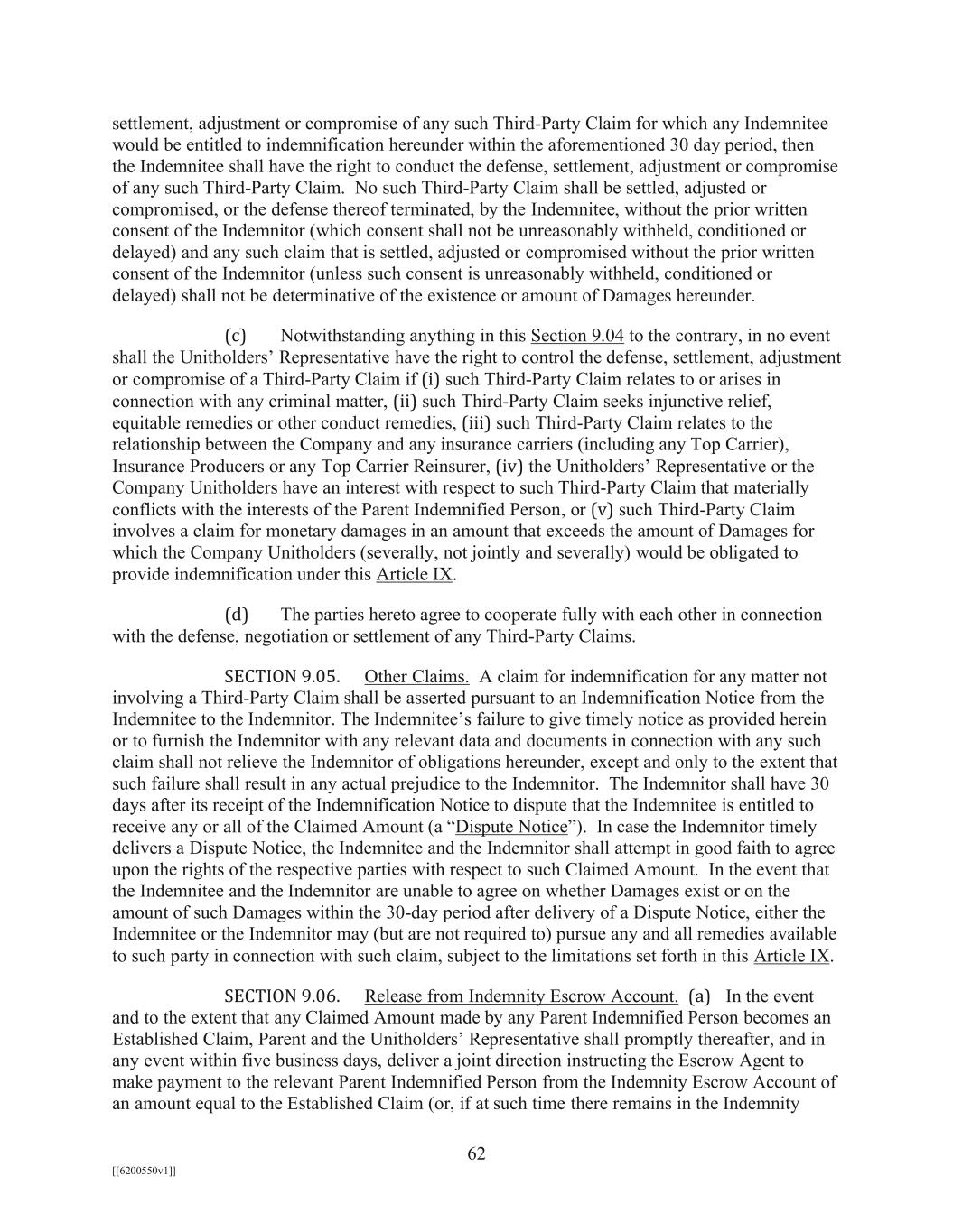 62 [[6200550v1]] settlement, adjustment or compromise of any such Third-Party Claim for which any Indemnitee would be entitled to indemnification hereunder within the aforementioned 30 day period, then the Indemnitee shall have the right to conduct the defense, settlement, adjustment or compromise of any such Third-Party Claim. No such Third-Party Claim shall be settled, adjusted or compromised, or the defense thereof terminated, by the Indemnitee, without the prior written consent of the Indemnitor (which consent shall not be unreasonably withheld, conditioned or delayed) and any such claim that is settled, adjusted or compromised without the prior written consent of the Indemnitor (unless such consent is unreasonably withheld, conditioned or delayed) shall not be determinative of the existence or amount of Damages hereunder. Notwithstanding anything in this Section 9.04 to the contrary, in no event shall the Unitholders’ Representative have the right to control the defense, settlement, adjustment or compromise of a Third-Party Claim if such Third-Party Claim relates to or arises in connection with any criminal matter, such Third-Party Claim seeks injunctive relief, equitable remedies or other conduct remedies, such Third-Party Claim relates to the relationship between the Company and any insurance carriers (including any Top Carrier), Insurance Producers or any Top Carrier Reinsurer, the Unitholders’ Representative or the Company Unitholders have an interest with respect to such Third-Party Claim that materially conflicts with the interests of the Parent Indemnified Person, or such Third-Party Claim involves a claim for monetary damages in an amount that exceeds the amount of Damages for which the Company Unitholders (severally, not jointly and severally) would be obligated to provide indemnification under this Article IX. The parties hereto agree to cooperate fully with each other in connection with the defense, negotiation or settlement of any Third-Party Claims. Other Claims. A claim for indemnification for any matter not involving a Third-Party Claim shall be asserted pursuant to an Indemnification Notice from the Indemnitee to the Indemnitor. The Indemnitee’s failure to give timely notice as provided herein or to furnish the Indemnitor with any relevant data and documents in connection with any such claim shall not relieve the Indemnitor of obligations hereunder, except and only to the extent that such failure shall result in any actual prejudice to the Indemnitor. The Indemnitor shall have 30 days after its receipt of the Indemnification Notice to dispute that the Indemnitee is entitled to receive any or all of the Claimed Amount (a “Dispute Notice”). In case the Indemnitor timely delivers a Dispute Notice, the Indemnitee and the Indemnitor shall attempt in good faith to agree upon the rights of the respective parties with respect to such Claimed Amount. In the event that the Indemnitee and the Indemnitor are unable to agree on whether Damages exist or on the amount of such Damages within the 30-day period after delivery of a Dispute Notice, either the Indemnitee or the Indemnitor may (but are not required to) pursue any and all remedies available to such party in connection with such claim, subject to the limitations set forth in this Article IX. Release from Indemnity Escrow Account. In the event and to the extent that any Claimed Amount made by any Parent Indemnified Person becomes an Established Claim, Parent and the Unitholders’ Representative shall promptly thereafter, and in any event within five business days, deliver a joint direction instructing the Escrow Agent to make payment to the relevant Parent Indemnified Person from the Indemnity Escrow Account of an amount equal to the Established Claim (or, if at such time there remains in the Indemnity