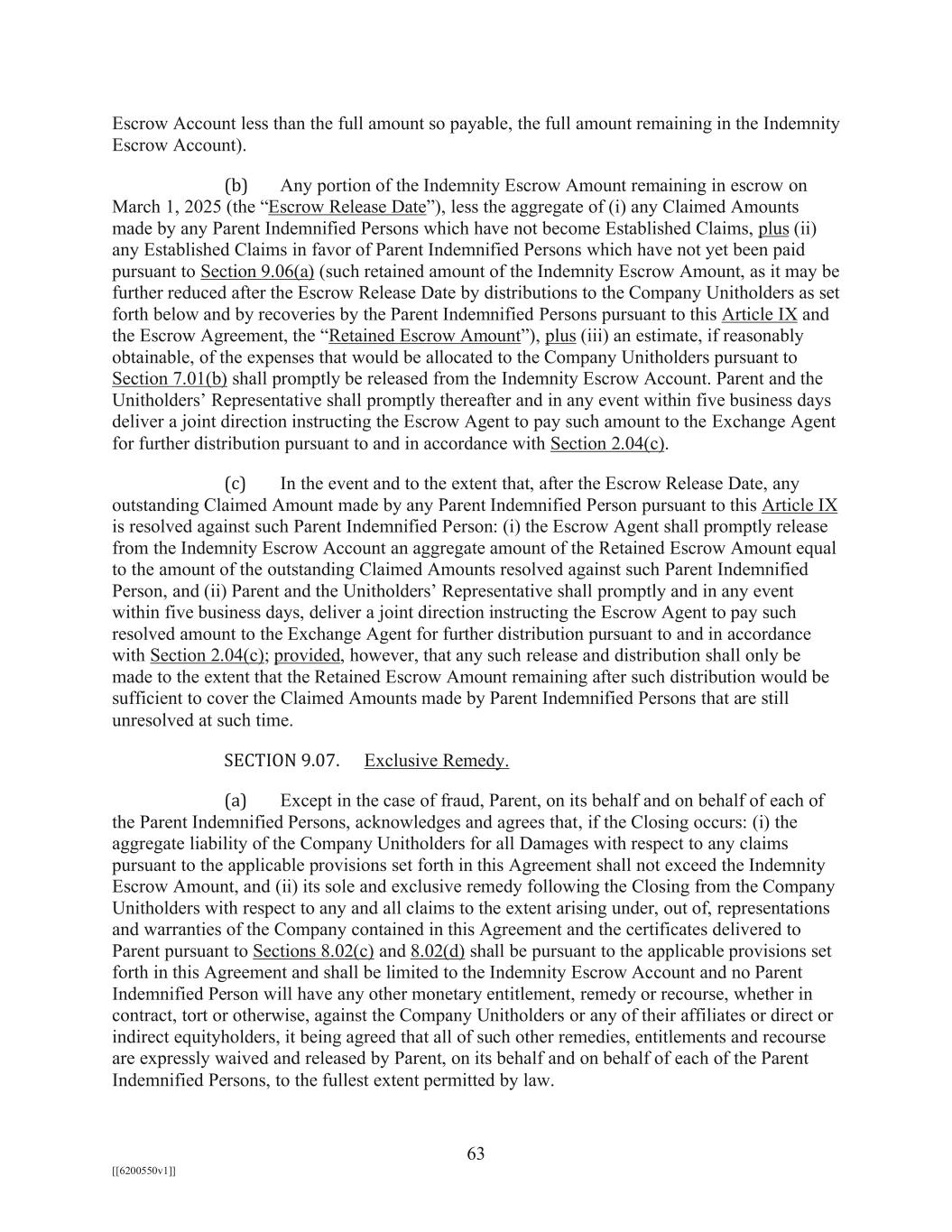 63 [[6200550v1]] Escrow Account less than the full amount so payable, the full amount remaining in the Indemnity Escrow Account). Any portion of the Indemnity Escrow Amount remaining in escrow on March 1, 2025 (the “Escrow Release Date”), less the aggregate of (i) any Claimed Amounts made by any Parent Indemnified Persons which have not become Established Claims, plus (ii) any Established Claims in favor of Parent Indemnified Persons which have not yet been paid pursuant to Section 9.06(a) (such retained amount of the Indemnity Escrow Amount, as it may be further reduced after the Escrow Release Date by distributions to the Company Unitholders as set forth below and by recoveries by the Parent Indemnified Persons pursuant to this Article IX and the Escrow Agreement, the “Retained Escrow Amount”), plus (iii) an estimate, if reasonably obtainable, of the expenses that would be allocated to the Company Unitholders pursuant to Section 7.01(b) shall promptly be released from the Indemnity Escrow Account. Parent and the Unitholders’ Representative shall promptly thereafter and in any event within five business days deliver a joint direction instructing the Escrow Agent to pay such amount to the Exchange Agent for further distribution pursuant to and in accordance with Section 2.04(c). In the event and to the extent that, after the Escrow Release Date, any outstanding Claimed Amount made by any Parent Indemnified Person pursuant to this Article IX is resolved against such Parent Indemnified Person: (i) the Escrow Agent shall promptly release from the Indemnity Escrow Account an aggregate amount of the Retained Escrow Amount equal to the amount of the outstanding Claimed Amounts resolved against such Parent Indemnified Person, and (ii) Parent and the Unitholders’ Representative shall promptly and in any event within five business days, deliver a joint direction instructing the Escrow Agent to pay such resolved amount to the Exchange Agent for further distribution pursuant to and in accordance with Section 2.04(c); provided, however, that any such release and distribution shall only be made to the extent that the Retained Escrow Amount remaining after such distribution would be sufficient to cover the Claimed Amounts made by Parent Indemnified Persons that are still unresolved at such time. Exclusive Remedy. Except in the case of fraud, Parent, on its behalf and on behalf of each of the Parent Indemnified Persons, acknowledges and agrees that, if the Closing occurs: (i) the aggregate liability of the Company Unitholders for all Damages with respect to any claims pursuant to the applicable provisions set forth in this Agreement shall not exceed the Indemnity Escrow Amount, and (ii) its sole and exclusive remedy following the Closing from the Company Unitholders with respect to any and all claims to the extent arising under, out of, representations and warranties of the Company contained in this Agreement and the certificates delivered to Parent pursuant to Sections 8.02(c) and 8.02(d) shall be pursuant to the applicable provisions set forth in this Agreement and shall be limited to the Indemnity Escrow Account and no Parent Indemnified Person will have any other monetary entitlement, remedy or recourse, whether in contract, tort or otherwise, against the Company Unitholders or any of their affiliates or direct or indirect equityholders, it being agreed that all of such other remedies, entitlements and recourse are expressly waived and released by Parent, on its behalf and on behalf of each of the Parent Indemnified Persons, to the fullest extent permitted by law.