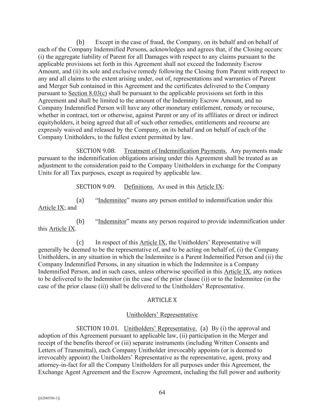64 [[6200550v1]] Except in the case of fraud, the Company, on its behalf and on behalf of each of the Company Indemnified Persons, acknowledges and agrees that, if the Closing occurs: (i) the aggregate liability of Parent for all Damages with respect to any claims pursuant to the applicable provisions set forth in this Agreement shall not exceed the Indemnity Escrow Amount, and (ii) its sole and exclusive remedy following the Closing from Parent with respect to any and all claims to the extent arising under, out of, representations and warranties of Parent and Merger Sub contained in this Agreement and the certificates delivered to the Company pursuant to Section 8.03(c) shall be pursuant to the applicable provisions set forth in this Agreement and shall be limited to the amount of the Indemnity Escrow Amount, and no Company Indemnified Person will have any other monetary entitlement, remedy or recourse, whether in contract, tort or otherwise, against Parent or any of its affiliates or direct or indirect equityholders, it being agreed that all of such other remedies, entitlements and recourse are expressly waived and released by the Company, on its behalf and on behalf of each of the Company Unitholders, to the fullest extent permitted by law. Treatment of Indemnification Payments. Any payments made pursuant to the indemnification obligations arising under this Agreement shall be treated as an adjustment to the consideration paid to the Company Unitholders in exchange for the Company Units for all Tax purposes, except as required by applicable law. Definitions. As used in this Article IX: “Indemnitee” means any person entitled to indemnification under this Article IX; and “Indemnitor” means any person required to provide indemnification under this Article IX. In respect of this Article IX, the Unitholders’ Representative will generally be deemed to be the representative of, and to be acting on behalf of, (i) the Company Unitholders, in any situation in which the Indemnitee is a Parent Indemnified Person and (ii) the Company Indemnified Persons, in any situation in which the Indemnitee is a Company Indemnified Person, and in such cases, unless otherwise specified in this Article IX, any notices to be delivered to the Indemnitor (in the case of the prior clause (i)) or to the Indemnitee (in the case of the prior clause (ii)) shall be delivered to the Unitholders’ Representative. Unitholders’ Representative Unitholders’ Representative. By (i) the approval and adoption of this Agreement pursuant to applicable law, (ii) participation in the Merger and receipt of the benefits thereof or (iii) separate instruments (including Written Consents and Letters of Transmittal), each Company Unitholder irrevocably appoints (or is deemed to irrevocably appoint) the Unitholders’ Representative as the representative, agent, proxy and attorney-in-fact for all the Company Unitholders for all purposes under this Agreement, the Exchange Agent Agreement and the Escrow Agreement, including the full power and authority