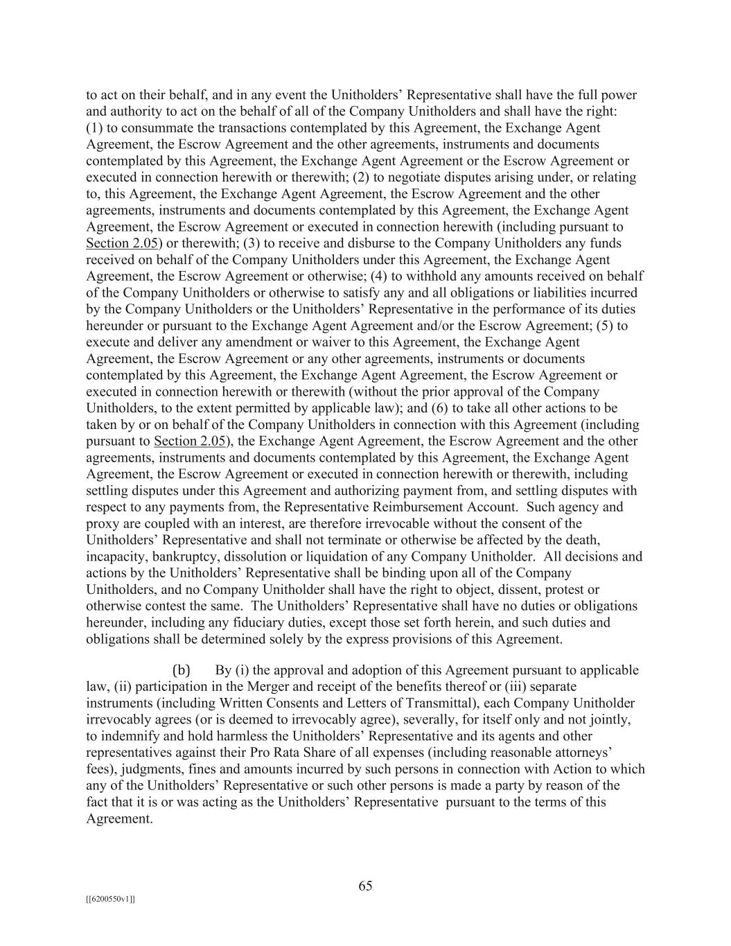65 [[6200550v1]] to act on their behalf, and in any event the Unitholders’ Representative shall have the full power and authority to act on the behalf of all of the Company Unitholders and shall have the right: (1) to consummate the transactions contemplated by this Agreement, the Exchange Agent Agreement, the Escrow Agreement and the other agreements, instruments and documents contemplated by this Agreement, the Exchange Agent Agreement or the Escrow Agreement or executed in connection herewith or therewith; (2) to negotiate disputes arising under, or relating to, this Agreement, the Exchange Agent Agreement, the Escrow Agreement and the other agreements, instruments and documents contemplated by this Agreement, the Exchange Agent Agreement, the Escrow Agreement or executed in connection herewith (including pursuant to Section 2.05) or therewith; (3) to receive and disburse to the Company Unitholders any funds received on behalf of the Company Unitholders under this Agreement, the Exchange Agent Agreement, the Escrow Agreement or otherwise; (4) to withhold any amounts received on behalf of the Company Unitholders or otherwise to satisfy any and all obligations or liabilities incurred by the Company Unitholders or the Unitholders’ Representative in the performance of its duties hereunder or pursuant to the Exchange Agent Agreement and/or the Escrow Agreement; (5) to execute and deliver any amendment or waiver to this Agreement, the Exchange Agent Agreement, the Escrow Agreement or any other agreements, instruments or documents contemplated by this Agreement, the Exchange Agent Agreement, the Escrow Agreement or executed in connection herewith or therewith (without the prior approval of the Company Unitholders, to the extent permitted by applicable law); and (6) to take all other actions to be taken by or on behalf of the Company Unitholders in connection with this Agreement (including pursuant to Section 2.05), the Exchange Agent Agreement, the Escrow Agreement and the other agreements, instruments and documents contemplated by this Agreement, the Exchange Agent Agreement, the Escrow Agreement or executed in connection herewith or therewith, including settling disputes under this Agreement and authorizing payment from, and settling disputes with respect to any payments from, the Representative Reimbursement Account. Such agency and proxy are coupled with an interest, are therefore irrevocable without the consent of the Unitholders’ Representative and shall not terminate or otherwise be affected by the death, incapacity, bankruptcy, dissolution or liquidation of any Company Unitholder. All decisions and actions by the Unitholders’ Representative shall be binding upon all of the Company Unitholders, and no Company Unitholder shall have the right to object, dissent, protest or otherwise contest the same. The Unitholders’ Representative shall have no duties or obligations hereunder, including any fiduciary duties, except those set forth herein, and such duties and obligations shall be determined solely by the express provisions of this Agreement. By (i) the approval and adoption of this Agreement pursuant to applicable law, (ii) participation in the Merger and receipt of the benefits thereof or (iii) separate instruments (including Written Consents and Letters of Transmittal), each Company Unitholder irrevocably agrees (or is deemed to irrevocably agree), severally, for itself only and not jointly, to indemnify and hold harmless the Unitholders’ Representative and its agents and other representatives against their Pro Rata Share of all expenses (including reasonable attorneys’ fees), judgments, fines and amounts incurred by such persons in connection with Action to which any of the Unitholders’ Representative or such other persons is made a party by reason of the fact that it is or was acting as the Unitholders’ Representative pursuant to the terms of this Agreement.