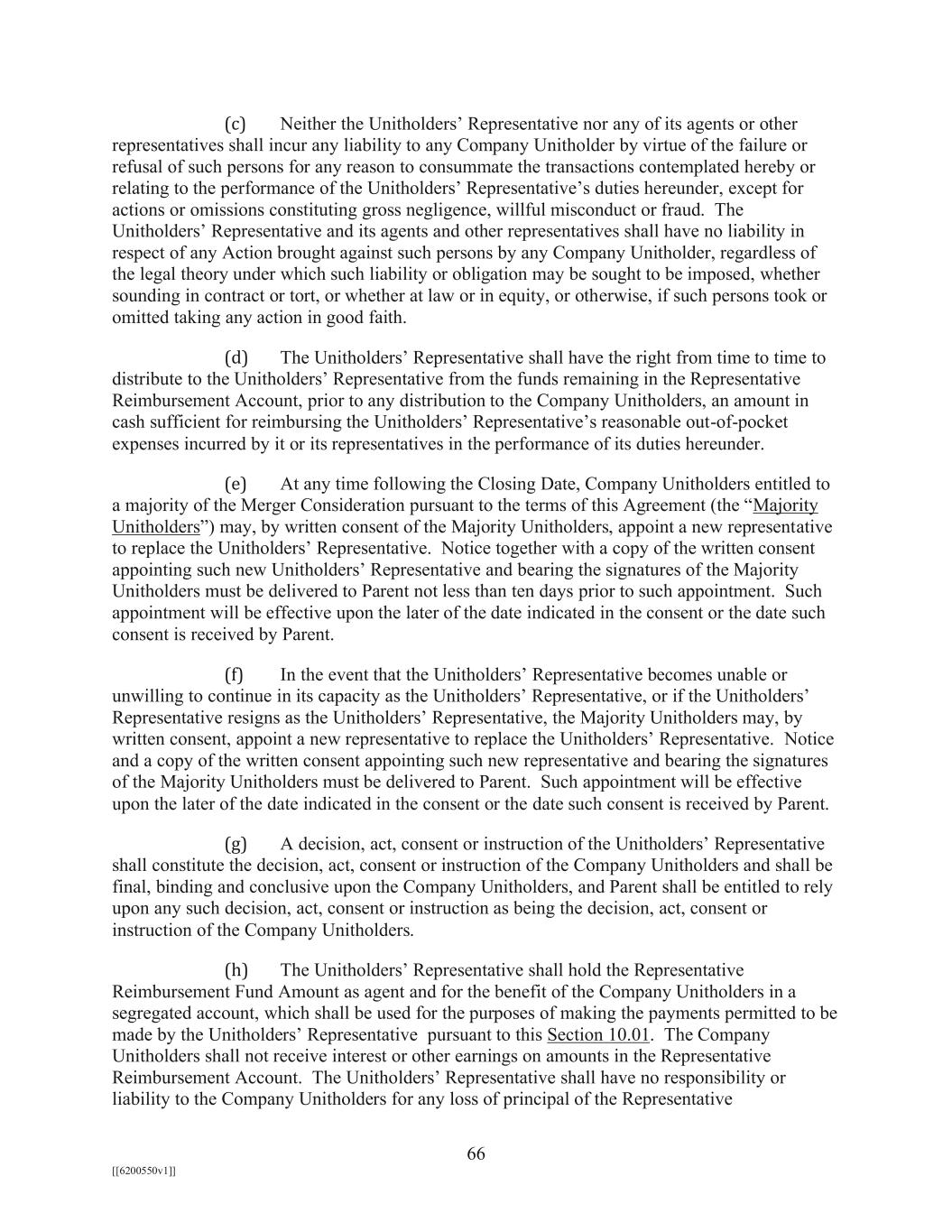 66 [[6200550v1]] Neither the Unitholders’ Representative nor any of its agents or other representatives shall incur any liability to any Company Unitholder by virtue of the failure or refusal of such persons for any reason to consummate the transactions contemplated hereby or relating to the performance of the Unitholders’ Representative’s duties hereunder, except for actions or omissions constituting gross negligence, willful misconduct or fraud. The Unitholders’ Representative and its agents and other representatives shall have no liability in respect of any Action brought against such persons by any Company Unitholder, regardless of the legal theory under which such liability or obligation may be sought to be imposed, whether sounding in contract or tort, or whether at law or in equity, or otherwise, if such persons took or omitted taking any action in good faith. The Unitholders’ Representative shall have the right from time to time to distribute to the Unitholders’ Representative from the funds remaining in the Representative Reimbursement Account, prior to any distribution to the Company Unitholders, an amount in cash sufficient for reimbursing the Unitholders’ Representative’s reasonable out-of-pocket expenses incurred by it or its representatives in the performance of its duties hereunder. At any time following the Closing Date, Company Unitholders entitled to a majority of the Merger Consideration pursuant to the terms of this Agreement (the “Majority Unitholders”) may, by written consent of the Majority Unitholders, appoint a new representative to replace the Unitholders’ Representative. Notice together with a copy of the written consent appointing such new Unitholders’ Representative and bearing the signatures of the Majority Unitholders must be delivered to Parent not less than ten days prior to such appointment. Such appointment will be effective upon the later of the date indicated in the consent or the date such consent is received by Parent. In the event that the Unitholders’ Representative becomes unable or unwilling to continue in its capacity as the Unitholders’ Representative, or if the Unitholders’ Representative resigns as the Unitholders’ Representative, the Majority Unitholders may, by written consent, appoint a new representative to replace the Unitholders’ Representative. Notice and a copy of the written consent appointing such new representative and bearing the signatures of the Majority Unitholders must be delivered to Parent. Such appointment will be effective upon the later of the date indicated in the consent or the date such consent is received by Parent. A decision, act, consent or instruction of the Unitholders’ Representative shall constitute the decision, act, consent or instruction of the Company Unitholders and shall be final, binding and conclusive upon the Company Unitholders, and Parent shall be entitled to rely upon any such decision, act, consent or instruction as being the decision, act, consent or instruction of the Company Unitholders. The Unitholders’ Representative shall hold the Representative Reimbursement Fund Amount as agent and for the benefit of the Company Unitholders in a segregated account, which shall be used for the purposes of making the payments permitted to be made by the Unitholders’ Representative pursuant to this Section 10.01. The Company Unitholders shall not receive interest or other earnings on amounts in the Representative Reimbursement Account. The Unitholders’ Representative shall have no responsibility or liability to the Company Unitholders for any loss of principal of the Representative