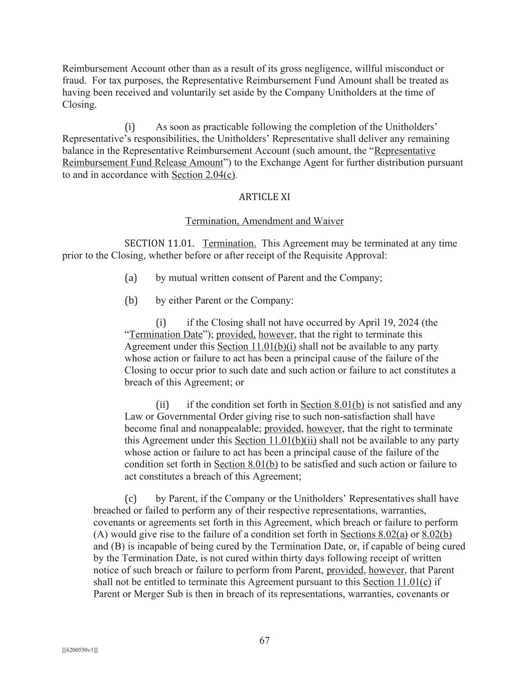 67 [[6200550v1]] Reimbursement Account other than as a result of its gross negligence, willful misconduct or fraud. For tax purposes, the Representative Reimbursement Fund Amount shall be treated as having been received and voluntarily set aside by the Company Unitholders at the time of Closing. As soon as practicable following the completion of the Unitholders’ Representative’s responsibilities, the Unitholders’ Representative shall deliver any remaining balance in the Representative Reimbursement Account (such amount, the “Representative Reimbursement Fund Release Amount”) to the Exchange Agent for further distribution pursuant to and in accordance with Section 2.04(c). Termination, Amendment and Waiver Termination. This Agreement may be terminated at any time prior to the Closing, whether before or after receipt of the Requisite Approval: by mutual written consent of Parent and the Company; by either Parent or the Company: if the Closing shall not have occurred by April 19, 2024 (the “Termination Date”); provided, however, that the right to terminate this Agreement under this Section 11.01(b)(i) shall not be available to any party whose action or failure to act has been a principal cause of the failure of the Closing to occur prior to such date and such action or failure to act constitutes a breach of this Agreement; or if the condition set forth in Section 8.01(b) is not satisfied and any Law or Governmental Order giving rise to such non-satisfaction shall have become final and nonappealable; provided, however, that the right to terminate this Agreement under this Section 11.01(b)(ii) shall not be available to any party whose action or failure to act has been a principal cause of the failure of the condition set forth in Section 8.01(b) to be satisfied and such action or failure to act constitutes a breach of this Agreement; by Parent, if the Company or the Unitholders’ Representatives shall have breached or failed to perform any of their respective representations, warranties, covenants or agreements set forth in this Agreement, which breach or failure to perform (A) would give rise to the failure of a condition set forth in Sections 8.02(a) or 8.02(b) and (B) is incapable of being cured by the Termination Date, or, if capable of being cured by the Termination Date, is not cured within thirty days following receipt of written notice of such breach or failure to perform from Parent, provided, however, that Parent shall not be entitled to terminate this Agreement pursuant to this Section 11.01(c) if Parent or Merger Sub is then in breach of its representations, warranties, covenants or