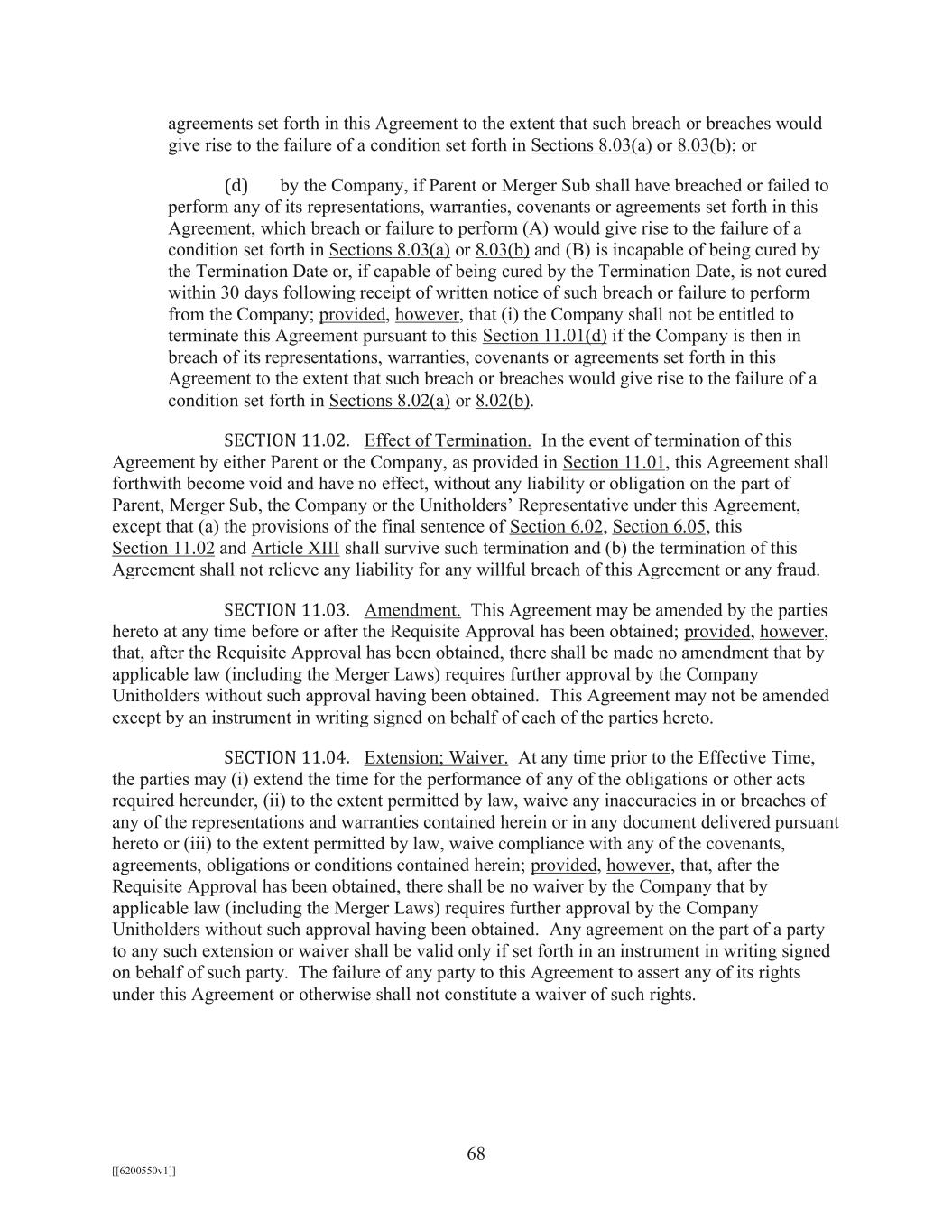 68 [[6200550v1]] agreements set forth in this Agreement to the extent that such breach or breaches would give rise to the failure of a condition set forth in Sections 8.03(a) or 8.03(b); or by the Company, if Parent or Merger Sub shall have breached or failed to perform any of its representations, warranties, covenants or agreements set forth in this Agreement, which breach or failure to perform (A) would give rise to the failure of a condition set forth in Sections 8.03(a) or 8.03(b) and (B) is incapable of being cured by the Termination Date or, if capable of being cured by the Termination Date, is not cured within 30 days following receipt of written notice of such breach or failure to perform from the Company; provided, however, that (i) the Company shall not be entitled to terminate this Agreement pursuant to this Section 11.01(d) if the Company is then in breach of its representations, warranties, covenants or agreements set forth in this Agreement to the extent that such breach or breaches would give rise to the failure of a condition set forth in Sections 8.02(a) or 8.02(b). Effect of Termination. In the event of termination of this Agreement by either Parent or the Company, as provided in Section 11.01, this Agreement shall forthwith become void and have no effect, without any liability or obligation on the part of Parent, Merger Sub, the Company or the Unitholders’ Representative under this Agreement, except that (a) the provisions of the final sentence of Section 6.02, Section 6.05, this Section 11.02 and Article XIII shall survive such termination and (b) the termination of this Agreement shall not relieve any liability for any willful breach of this Agreement or any fraud. Amendment. This Agreement may be amended by the parties hereto at any time before or after the Requisite Approval has been obtained; provided, however, that, after the Requisite Approval has been obtained, there shall be made no amendment that by applicable law (including the Merger Laws) requires further approval by the Company Unitholders without such approval having been obtained. This Agreement may not be amended except by an instrument in writing signed on behalf of each of the parties hereto. Extension; Waiver. At any time prior to the Effective Time, the parties may (i) extend the time for the performance of any of the obligations or other acts required hereunder, (ii) to the extent permitted by law, waive any inaccuracies in or breaches of any of the representations and warranties contained herein or in any document delivered pursuant hereto or (iii) to the extent permitted by law, waive compliance with any of the covenants, agreements, obligations or conditions contained herein; provided, however, that, after the Requisite Approval has been obtained, there shall be no waiver by the Company that by applicable law (including the Merger Laws) requires further approval by the Company Unitholders without such approval having been obtained. Any agreement on the part of a party to any such extension or waiver shall be valid only if set forth in an instrument in writing signed on behalf of such party. The failure of any party to this Agreement to assert any of its rights under this Agreement or otherwise shall not constitute a waiver of such rights.