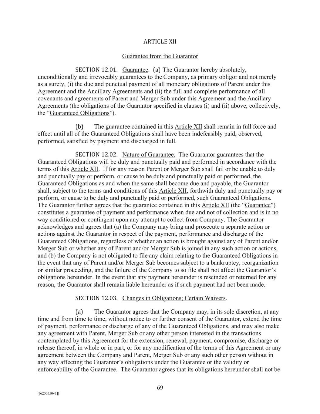 69 [[6200550v1]] Guarantee from the Guarantor Guarantee. The Guarantor hereby absolutely, unconditionally and irrevocably guarantees to the Company, as primary obligor and not merely as a surety, (i) the due and punctual payment of all monetary obligations of Parent under this Agreement and the Ancillary Agreements and (ii) the full and complete performance of all covenants and agreements of Parent and Merger Sub under this Agreement and the Ancillary Agreements (the obligations of the Guarantor specified in clauses (i) and (ii) above, collectively, the “Guaranteed Obligations”). The guarantee contained in this Article XII shall remain in full force and effect until all of the Guaranteed Obligations shall have been indefeasibly paid, observed, performed, satisfied by payment and discharged in full. Nature of Guarantee. The Guarantor guarantees that the Guaranteed Obligations will be duly and punctually paid and performed in accordance with the terms of this Article XII. If for any reason Parent or Merger Sub shall fail or be unable to duly and punctually pay or perform, or cause to be duly and punctually paid or performed, the Guaranteed Obligations as and when the same shall become due and payable, the Guarantor shall, subject to the terms and conditions of this Article XII, forthwith duly and punctually pay or perform, or cause to be duly and punctually paid or performed, such Guaranteed Obligations. The Guarantor further agrees that the guarantee contained in this Article XII (the “Guarantee”) constitutes a guarantee of payment and performance when due and not of collection and is in no way conditioned or contingent upon any attempt to collect from Company. The Guarantor acknowledges and agrees that (a) the Company may bring and prosecute a separate action or actions against the Guarantor in respect of the payment, performance and discharge of the Guaranteed Obligations, regardless of whether an action is brought against any of Parent and/or Merger Sub or whether any of Parent and/or Merger Sub is joined in any such action or actions, and (b) the Company is not obligated to file any claim relating to the Guaranteed Obligations in the event that any of Parent and/or Merger Sub becomes subject to a bankruptcy, reorganization or similar proceeding, and the failure of the Company to so file shall not affect the Guarantor’s obligations hereunder. In the event that any payment hereunder is rescinded or returned for any reason, the Guarantor shall remain liable hereunder as if such payment had not been made. Changes in Obligations; Certain Waivers. The Guarantor agrees that the Company may, in its sole discretion, at any time and from time to time, without notice to or further consent of the Guarantor, extend the time of payment, performance or discharge of any of the Guaranteed Obligations, and may also make any agreement with Parent, Merger Sub or any other person interested in the transactions contemplated by this Agreement for the extension, renewal, payment, compromise, discharge or release thereof, in whole or in part, or for any modification of the terms of this Agreement or any agreement between the Company and Parent, Merger Sub or any such other person without in any way affecting the Guarantor’s obligations under the Guarantee or the validity or enforceability of the Guarantee. The Guarantor agrees that its obligations hereunder shall not be