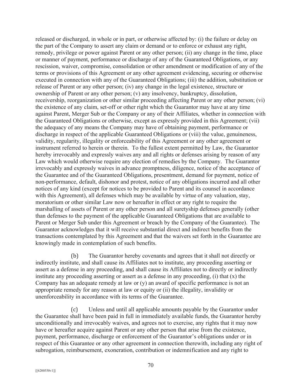 70 [[6200550v1]] released or discharged, in whole or in part, or otherwise affected by: (i) the failure or delay on the part of the Company to assert any claim or demand or to enforce or exhaust any right, remedy, privilege or power against Parent or any other person; (ii) any change in the time, place or manner of payment, performance or discharge of any of the Guaranteed Obligations, or any rescission, waiver, compromise, consolidation or other amendment or modification of any of the terms or provisions of this Agreement or any other agreement evidencing, securing or otherwise executed in connection with any of the Guaranteed Obligations; (iii) the addition, substitution or release of Parent or any other person; (iv) any change in the legal existence, structure or ownership of Parent or any other person; (v) any insolvency, bankruptcy, dissolution, receivership, reorganization or other similar proceeding affecting Parent or any other person; (vi) the existence of any claim, set-off or other right which the Guarantor may have at any time against Parent, Merger Sub or the Company or any of their Affiliates, whether in connection with the Guaranteed Obligations or otherwise, except as expressly provided in this Agreement; (vii) the adequacy of any means the Company may have of obtaining payment, performance or discharge in respect of the applicable Guaranteed Obligations or (viii) the value, genuineness, validity, regularity, illegality or enforceability of this Agreement or any other agreement or instrument referred to herein or therein. To the fullest extent permitted by Law, the Guarantor hereby irrevocably and expressly waives any and all rights or defenses arising by reason of any Law which would otherwise require any election of remedies by the Company. The Guarantor irrevocably and expressly waives in advance promptness, diligence, notice of the acceptance of the Guarantee and of the Guaranteed Obligations, presentment, demand for payment, notice of non-performance, default, dishonor and protest, notice of any obligations incurred and all other notices of any kind (except for notices to be provided to Parent and its counsel in accordance with this Agreement), all defenses which may be available by virtue of any valuation, stay, moratorium or other similar Law now or hereafter in effect or any right to require the marshalling of assets of Parent or any other person and all suretyship defenses generally (other than defenses to the payment of the applicable Guaranteed Obligations that are available to Parent or Merger Sub under this Agreement or breach by the Company of the Guarantee). The Guarantor acknowledges that it will receive substantial direct and indirect benefits from the transactions contemplated by this Agreement and that the waivers set forth in the Guarantee are knowingly made in contemplation of such benefits. The Guarantor hereby covenants and agrees that it shall not directly or indirectly institute, and shall cause its Affiliates not to institute, any proceeding asserting or assert as a defense in any proceeding, and shall cause its Affiliates not to directly or indirectly institute any proceeding asserting or assert as a defense in any proceeding, (i) that (x) the Company has an adequate remedy at law or (y) an award of specific performance is not an appropriate remedy for any reason at law or equity or (ii) the illegality, invalidity or unenforceability in accordance with its terms of the Guarantee. Unless and until all applicable amounts payable by the Guarantor under the Guarantee shall have been paid in full in immediately available funds, the Guarantor hereby unconditionally and irrevocably waives, and agrees not to exercise, any rights that it may now have or hereafter acquire against Parent or any other person that arise from the existence, payment, performance, discharge or enforcement of the Guarantor’s obligations under or in respect of this Guarantee or any other agreement in connection therewith, including any right of subrogation, reimbursement, exoneration, contribution or indemnification and any right to