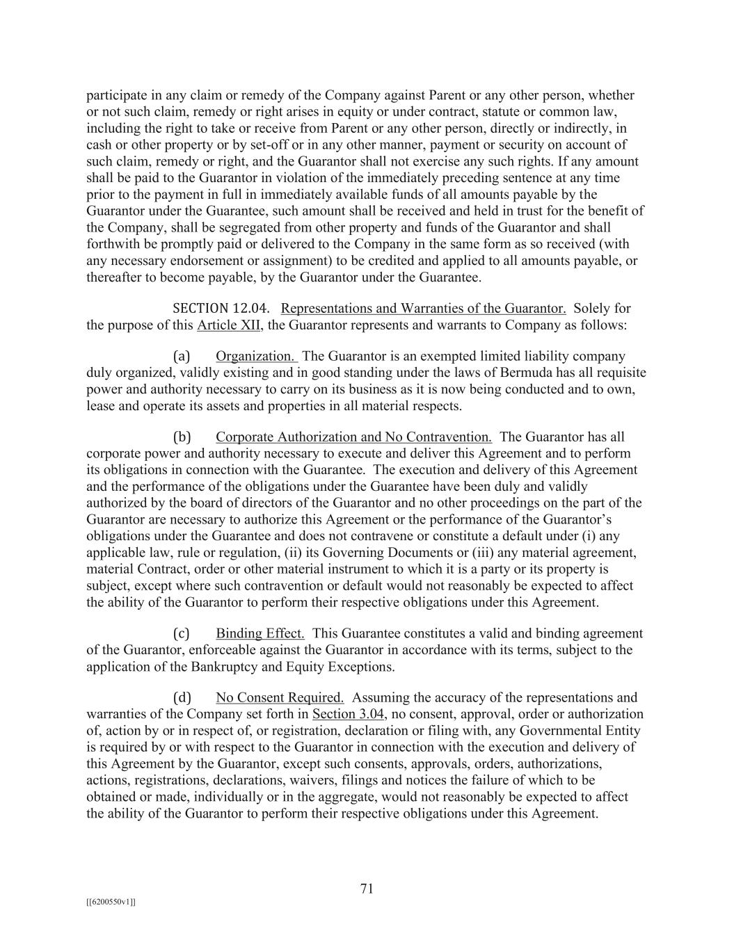 71 [[6200550v1]] participate in any claim or remedy of the Company against Parent or any other person, whether or not such claim, remedy or right arises in equity or under contract, statute or common law, including the right to take or receive from Parent or any other person, directly or indirectly, in cash or other property or by set-off or in any other manner, payment or security on account of such claim, remedy or right, and the Guarantor shall not exercise any such rights. If any amount shall be paid to the Guarantor in violation of the immediately preceding sentence at any time prior to the payment in full in immediately available funds of all amounts payable by the Guarantor under the Guarantee, such amount shall be received and held in trust for the benefit of the Company, shall be segregated from other property and funds of the Guarantor and shall forthwith be promptly paid or delivered to the Company in the same form as so received (with any necessary endorsement or assignment) to be credited and applied to all amounts payable, or thereafter to become payable, by the Guarantor under the Guarantee. Representations and Warranties of the Guarantor. Solely for the purpose of this Article XII, the Guarantor represents and warrants to Company as follows: Organization. The Guarantor is an exempted limited liability company duly organized, validly existing and in good standing under the laws of Bermuda has all requisite power and authority necessary to carry on its business as it is now being conducted and to own, lease and operate its assets and properties in all material respects. Corporate Authorization and No Contravention. The Guarantor has all corporate power and authority necessary to execute and deliver this Agreement and to perform its obligations in connection with the Guarantee. The execution and delivery of this Agreement and the performance of the obligations under the Guarantee have been duly and validly authorized by the board of directors of the Guarantor and no other proceedings on the part of the Guarantor are necessary to authorize this Agreement or the performance of the Guarantor’s obligations under the Guarantee and does not contravene or constitute a default under (i) any applicable law, rule or regulation, (ii) its Governing Documents or (iii) any material agreement, material Contract, order or other material instrument to which it is a party or its property is subject, except where such contravention or default would not reasonably be expected to affect the ability of the Guarantor to perform their respective obligations under this Agreement. Binding Effect. This Guarantee constitutes a valid and binding agreement of the Guarantor, enforceable against the Guarantor in accordance with its terms, subject to the application of the Bankruptcy and Equity Exceptions. No Consent Required. Assuming the accuracy of the representations and warranties of the Company set forth in Section 3.04, no consent, approval, order or authorization of, action by or in respect of, or registration, declaration or filing with, any Governmental Entity is required by or with respect to the Guarantor in connection with the execution and delivery of this Agreement by the Guarantor, except such consents, approvals, orders, authorizations, actions, registrations, declarations, waivers, filings and notices the failure of which to be obtained or made, individually or in the aggregate, would not reasonably be expected to affect the ability of the Guarantor to perform their respective obligations under this Agreement.