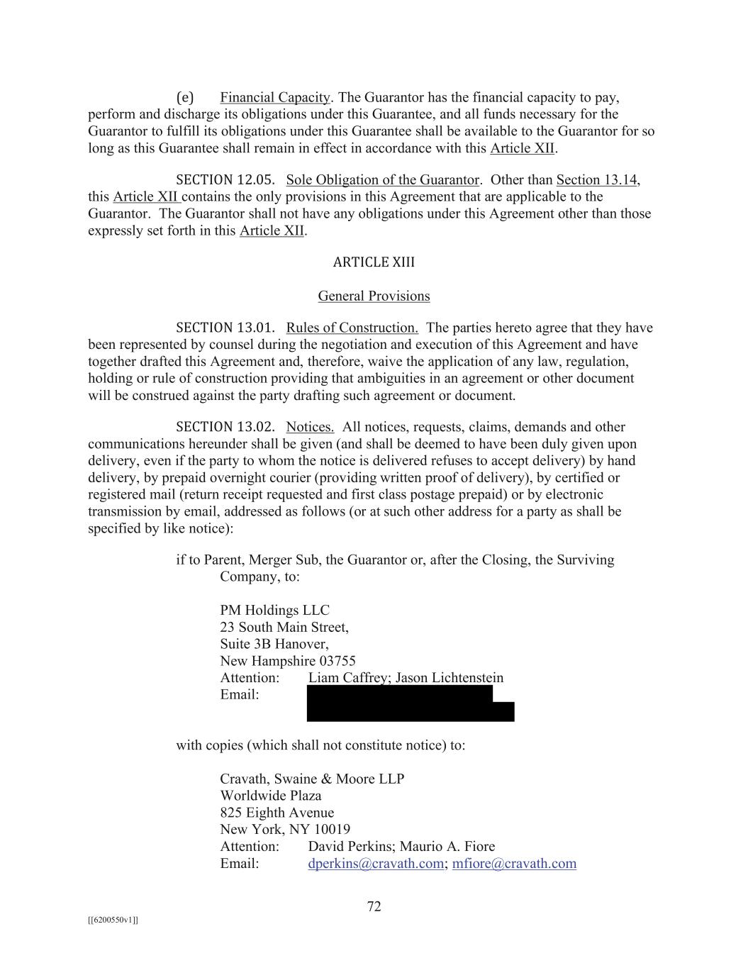 72 [[6200550v1]] Financial Capacity. The Guarantor has the financial capacity to pay, perform and discharge its obligations under this Guarantee, and all funds necessary for the Guarantor to fulfill its obligations under this Guarantee shall be available to the Guarantor for so long as this Guarantee shall remain in effect in accordance with this Article XII. Sole Obligation of the Guarantor. Other than Section 13.14, this Article XII contains the only provisions in this Agreement that are applicable to the Guarantor. The Guarantor shall not have any obligations under this Agreement other than those expressly set forth in this Article XII. General Provisions Rules of Construction. The parties hereto agree that they have been represented by counsel during the negotiation and execution of this Agreement and have together drafted this Agreement and, therefore, waive the application of any law, regulation, holding or rule of construction providing that ambiguities in an agreement or other document will be construed against the party drafting such agreement or document. Notices. All notices, requests, claims, demands and other communications hereunder shall be given (and shall be deemed to have been duly given upon delivery, even if the party to whom the notice is delivered refuses to accept delivery) by hand delivery, by prepaid overnight courier (providing written proof of delivery), by certified or registered mail (return receipt requested and first class postage prepaid) or by electronic transmission by email, addressed as follows (or at such other address for a party as shall be specified by like notice): if to Parent, Merger Sub, the Guarantor or, after the Closing, the Surviving Company, to: PM Holdings LLC 23 South Main Street, Suite 3B Hanover, New Hampshire 03755 Attention: Liam Caffrey; Jason Lichtenstein Email: with copies (which shall not constitute notice) to: Cravath, Swaine & Moore LLP Worldwide Plaza 825 Eighth Avenue New York, NY 10019 Attention: David Perkins; Maurio A. Fiore Email: dperkins@cravath.com; mfiore@cravath.com