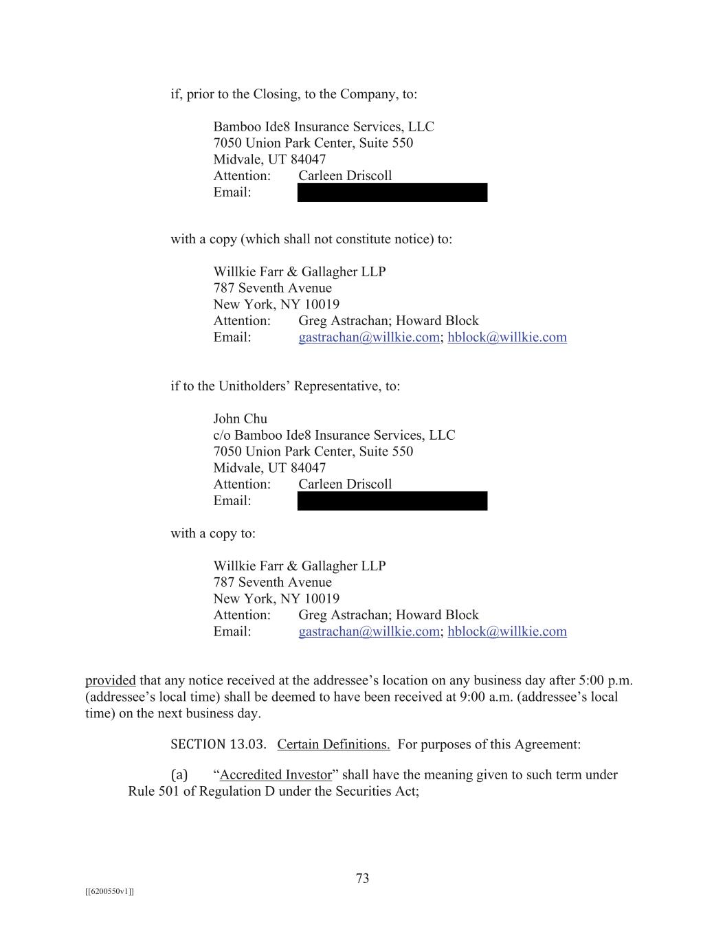 73 [[6200550v1]] if, prior to the Closing, to the Company, to: Bamboo Ide8 Insurance Services, LLC 7050 Union Park Center, Suite 550 Midvale, UT 84047 Attention: Carleen Driscoll Email: with a copy (which shall not constitute notice) to: Willkie Farr & Gallagher LLP 787 Seventh Avenue New York, NY 10019 Attention: Greg Astrachan; Howard Block Email: gastrachan@willkie.com; hblock@willkie.com if to the Unitholders’ Representative, to: John Chu c/o Bamboo Ide8 Insurance Services, LLC 7050 Union Park Center, Suite 550 Midvale, UT 84047 Attention: Carleen Driscoll Email: with a copy to: Willkie Farr & Gallagher LLP 787 Seventh Avenue New York, NY 10019 Attention: Greg Astrachan; Howard Block Email: gastrachan@willkie.com; hblock@willkie.com provided that any notice received at the addressee’s location on any business day after 5:00 p.m. (addressee’s local time) shall be deemed to have been received at 9:00 a.m. (addressee’s local time) on the next business day. Certain Definitions. For purposes of this Agreement: “Accredited Investor” shall have the meaning given to such term under Rule 501 of Regulation D under the Securities Act;