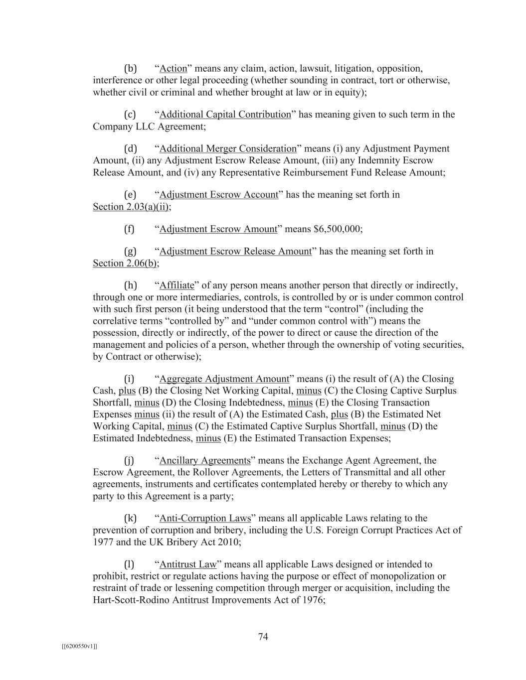 74 [[6200550v1]] “Action” means any claim, action, lawsuit, litigation, opposition, interference or other legal proceeding (whether sounding in contract, tort or otherwise, whether civil or criminal and whether brought at law or in equity); “Additional Capital Contribution” has meaning given to such term in the Company LLC Agreement; “Additional Merger Consideration” means (i) any Adjustment Payment Amount, (ii) any Adjustment Escrow Release Amount, (iii) any Indemnity Escrow Release Amount, and (iv) any Representative Reimbursement Fund Release Amount; “Adjustment Escrow Account” has the meaning set forth in Section 2.03(a)(ii); “Adjustment Escrow Amount” means $6,500,000; “Adjustment Escrow Release Amount” has the meaning set forth in Section 2.06(b); “Affiliate” of any person means another person that directly or indirectly, through one or more intermediaries, controls, is controlled by or is under common control with such first person (it being understood that the term “control” (including the correlative terms “controlled by” and “under common control with”) means the possession, directly or indirectly, of the power to direct or cause the direction of the management and policies of a person, whether through the ownership of voting securities, by Contract or otherwise); “Aggregate Adjustment Amount” means (i) the result of (A) the Closing Cash, plus (B) the Closing Net Working Capital, minus (C) the Closing Captive Surplus Shortfall, minus (D) the Closing Indebtedness, minus (E) the Closing Transaction Expenses minus (ii) the result of (A) the Estimated Cash, plus (B) the Estimated Net Working Capital, minus (C) the Estimated Captive Surplus Shortfall, minus (D) the Estimated Indebtedness, minus (E) the Estimated Transaction Expenses; “Ancillary Agreements” means the Exchange Agent Agreement, the Escrow Agreement, the Rollover Agreements, the Letters of Transmittal and all other agreements, instruments and certificates contemplated hereby or thereby to which any party to this Agreement is a party; “Anti-Corruption Laws” means all applicable Laws relating to the prevention of corruption and bribery, including the U.S. Foreign Corrupt Practices Act of 1977 and the UK Bribery Act 2010; “Antitrust Law” means all applicable Laws designed or intended to prohibit, restrict or regulate actions having the purpose or effect of monopolization or restraint of trade or lessening competition through merger or acquisition, including the Hart-Scott-Rodino Antitrust Improvements Act of 1976;