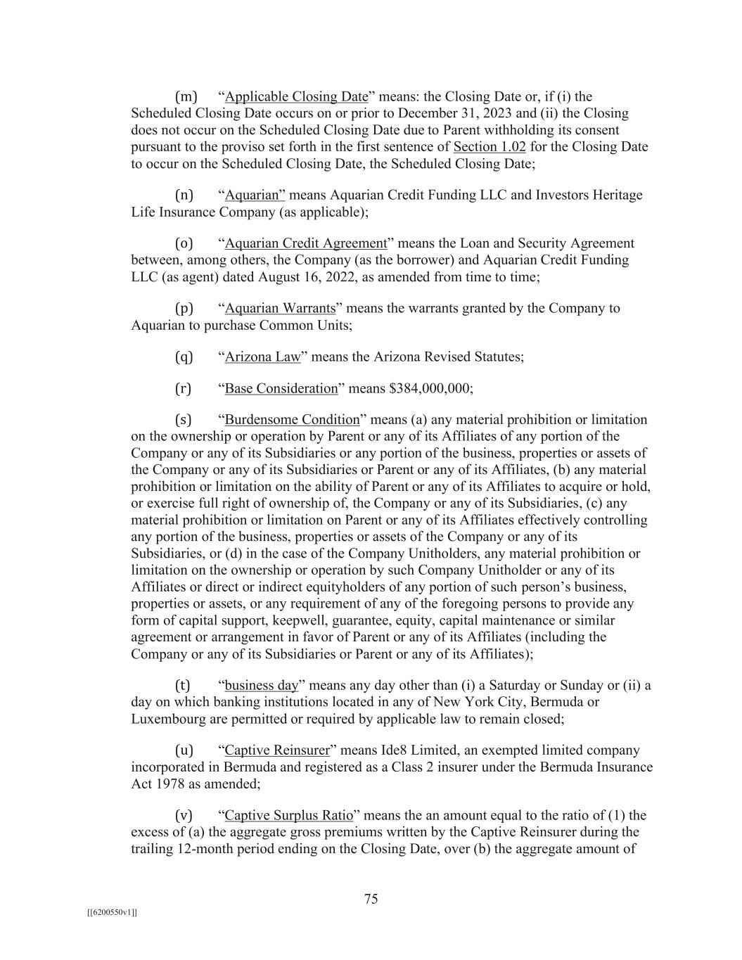 75 [[6200550v1]] “Applicable Closing Date” means: the Closing Date or, if (i) the Scheduled Closing Date occurs on or prior to December 31, 2023 and (ii) the Closing does not occur on the Scheduled Closing Date due to Parent withholding its consent pursuant to the proviso set forth in the first sentence of Section 1.02 for the Closing Date to occur on the Scheduled Closing Date, the Scheduled Closing Date; “Aquarian” means Aquarian Credit Funding LLC and Investors Heritage Life Insurance Company (as applicable); “Aquarian Credit Agreement” means the Loan and Security Agreement between, among others, the Company (as the borrower) and Aquarian Credit Funding LLC (as agent) dated August 16, 2022, as amended from time to time; “Aquarian Warrants” means the warrants granted by the Company to Aquarian to purchase Common Units; “Arizona Law” means the Arizona Revised Statutes; “Base Consideration” means $384,000,000; “Burdensome Condition” means (a) any material prohibition or limitation on the ownership or operation by Parent or any of its Affiliates of any portion of the Company or any of its Subsidiaries or any portion of the business, properties or assets of the Company or any of its Subsidiaries or Parent or any of its Affiliates, (b) any material prohibition or limitation on the ability of Parent or any of its Affiliates to acquire or hold, or exercise full right of ownership of, the Company or any of its Subsidiaries, (c) any material prohibition or limitation on Parent or any of its Affiliates effectively controlling any portion of the business, properties or assets of the Company or any of its Subsidiaries, or (d) in the case of the Company Unitholders, any material prohibition or limitation on the ownership or operation by such Company Unitholder or any of its Affiliates or direct or indirect equityholders of any portion of such person’s business, properties or assets, or any requirement of any of the foregoing persons to provide any form of capital support, keepwell, guarantee, equity, capital maintenance or similar agreement or arrangement in favor of Parent or any of its Affiliates (including the Company or any of its Subsidiaries or Parent or any of its Affiliates); “business day” means any day other than (i) a Saturday or Sunday or (ii) a day on which banking institutions located in any of New York City, Bermuda or Luxembourg are permitted or required by applicable law to remain closed; “Captive Reinsurer” means Ide8 Limited, an exempted limited company incorporated in Bermuda and registered as a Class 2 insurer under the Bermuda Insurance Act 1978 as amended; “Captive Surplus Ratio” means the an amount equal to the ratio of (1) the excess of (a) the aggregate gross premiums written by the Captive Reinsurer during the trailing 12-month period ending on the Closing Date, over (b) the aggregate amount of
