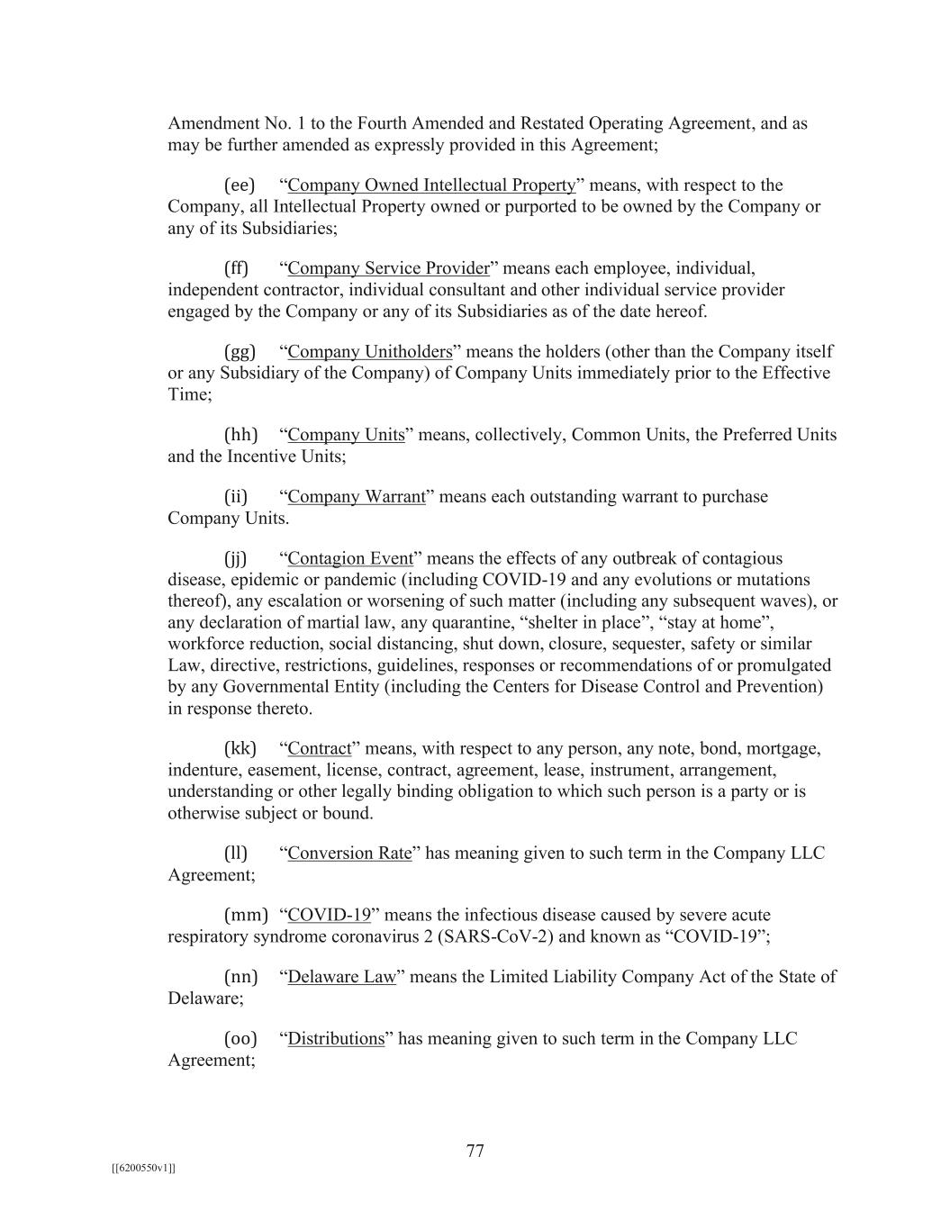 77 [[6200550v1]] Amendment No. 1 to the Fourth Amended and Restated Operating Agreement, and as may be further amended as expressly provided in this Agreement; “Company Owned Intellectual Property” means, with respect to the Company, all Intellectual Property owned or purported to be owned by the Company or any of its Subsidiaries; “Company Service Provider” means each employee, individual, independent contractor, individual consultant and other individual service provider engaged by the Company or any of its Subsidiaries as of the date hereof. “Company Unitholders” means the holders (other than the Company itself or any Subsidiary of the Company) of Company Units immediately prior to the Effective Time; “Company Units” means, collectively, Common Units, the Preferred Units and the Incentive Units; “Company Warrant” means each outstanding warrant to purchase Company Units. “Contagion Event” means the effects of any outbreak of contagious disease, epidemic or pandemic (including COVID-19 and any evolutions or mutations thereof), any escalation or worsening of such matter (including any subsequent waves), or any declaration of martial law, any quarantine, “shelter in place”, “stay at home”, workforce reduction, social distancing, shut down, closure, sequester, safety or similar Law, directive, restrictions, guidelines, responses or recommendations of or promulgated by any Governmental Entity (including the Centers for Disease Control and Prevention) in response thereto. “Contract” means, with respect to any person, any note, bond, mortgage, indenture, easement, license, contract, agreement, lease, instrument, arrangement, understanding or other legally binding obligation to which such person is a party or is otherwise subject or bound. “Conversion Rate” has meaning given to such term in the Company LLC Agreement; “COVID-19” means the infectious disease caused by severe acute respiratory syndrome coronavirus 2 (SARS-CoV-2) and known as “COVID-19”; “Delaware Law” means the Limited Liability Company Act of the State of Delaware; “Distributions” has meaning given to such term in the Company LLC Agreement;
