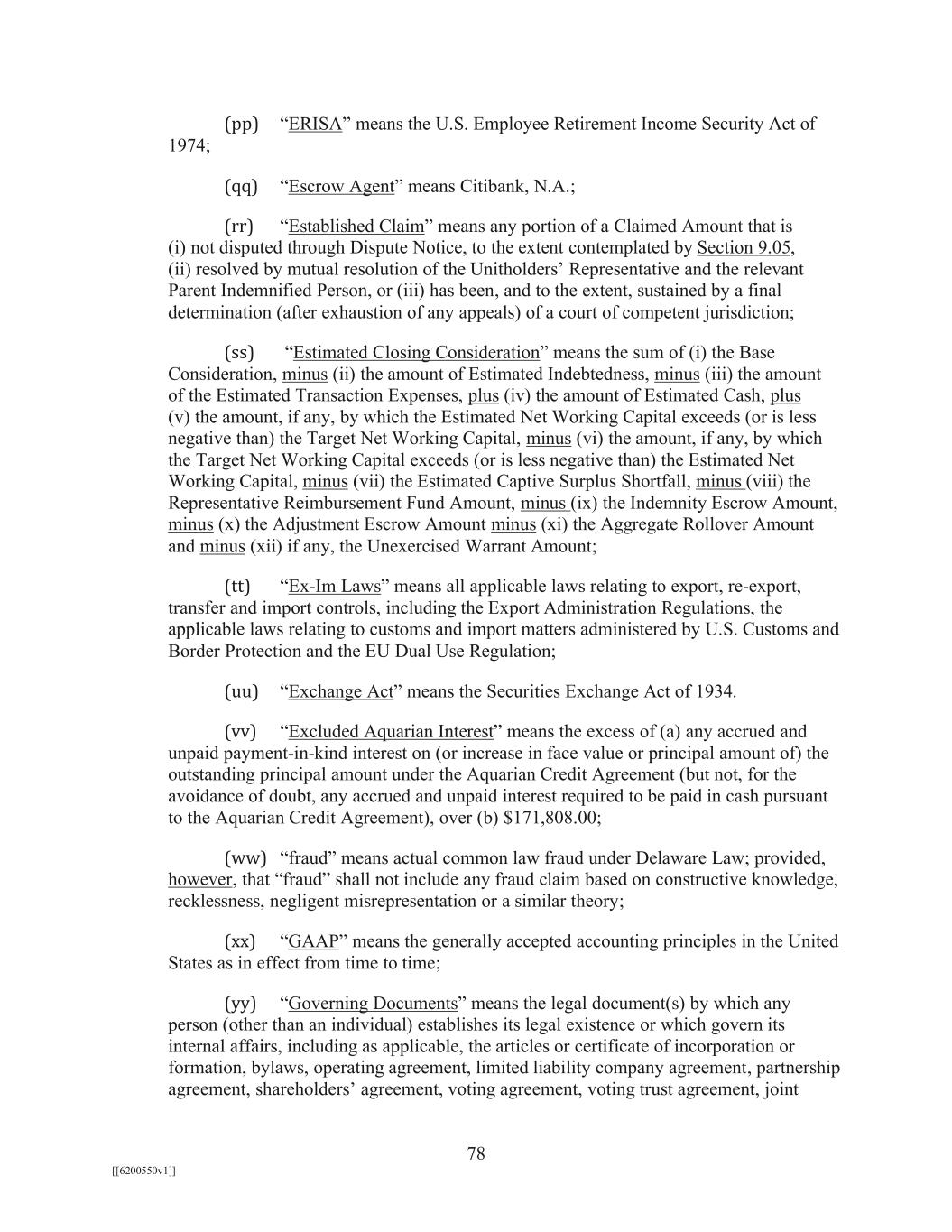 78 [[6200550v1]] “ERISA” means the U.S. Employee Retirement Income Security Act of 1974; “Escrow Agent” means Citibank, N.A.; “Established Claim” means any portion of a Claimed Amount that is (i) not disputed through Dispute Notice, to the extent contemplated by Section 9.05, (ii) resolved by mutual resolution of the Unitholders’ Representative and the relevant Parent Indemnified Person, or (iii) has been, and to the extent, sustained by a final determination (after exhaustion of any appeals) of a court of competent jurisdiction; “Estimated Closing Consideration” means the sum of (i) the Base Consideration, minus (ii) the amount of Estimated Indebtedness, minus (iii) the amount of the Estimated Transaction Expenses, plus (iv) the amount of Estimated Cash, plus (v) the amount, if any, by which the Estimated Net Working Capital exceeds (or is less negative than) the Target Net Working Capital, minus (vi) the amount, if any, by which the Target Net Working Capital exceeds (or is less negative than) the Estimated Net Working Capital, minus (vii) the Estimated Captive Surplus Shortfall, minus (viii) the Representative Reimbursement Fund Amount, minus (ix) the Indemnity Escrow Amount, minus (x) the Adjustment Escrow Amount minus (xi) the Aggregate Rollover Amount and minus (xii) if any, the Unexercised Warrant Amount; “Ex-Im Laws” means all applicable laws relating to export, re-export, transfer and import controls, including the Export Administration Regulations, the applicable laws relating to customs and import matters administered by U.S. Customs and Border Protection and the EU Dual Use Regulation; “Exchange Act” means the Securities Exchange Act of 1934. “Excluded Aquarian Interest” means the excess of (a) any accrued and unpaid payment-in-kind interest on (or increase in face value or principal amount of) the outstanding principal amount under the Aquarian Credit Agreement (but not, for the avoidance of doubt, any accrued and unpaid interest required to be paid in cash pursuant to the Aquarian Credit Agreement), over (b) $171,808.00; “fraud” means actual common law fraud under Delaware Law; provided, however, that “fraud” shall not include any fraud claim based on constructive knowledge, recklessness, negligent misrepresentation or a similar theory; “GAAP” means the generally accepted accounting principles in the United States as in effect from time to time; “Governing Documents” means the legal document(s) by which any person (other than an individual) establishes its legal existence or which govern its internal affairs, including as applicable, the articles or certificate of incorporation or formation, bylaws, operating agreement, limited liability company agreement, partnership agreement, shareholders’ agreement, voting agreement, voting trust agreement, joint