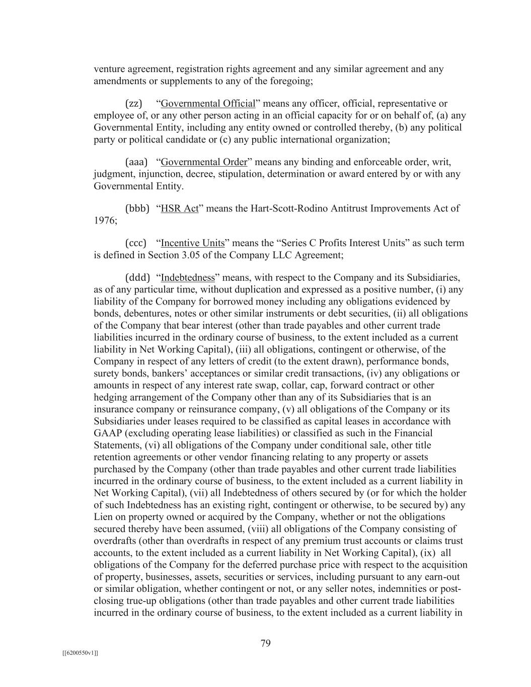 79 [[6200550v1]] venture agreement, registration rights agreement and any similar agreement and any amendments or supplements to any of the foregoing; “Governmental Official” means any officer, official, representative or employee of, or any other person acting in an official capacity for or on behalf of, (a) any Governmental Entity, including any entity owned or controlled thereby, (b) any political party or political candidate or (c) any public international organization; “Governmental Order” means any binding and enforceable order, writ, judgment, injunction, decree, stipulation, determination or award entered by or with any Governmental Entity. “HSR Act” means the Hart-Scott-Rodino Antitrust Improvements Act of 1976; “Incentive Units” means the “Series C Profits Interest Units” as such term is defined in Section 3.05 of the Company LLC Agreement; “Indebtedness” means, with respect to the Company and its Subsidiaries, as of any particular time, without duplication and expressed as a positive number, (i) any liability of the Company for borrowed money including any obligations evidenced by bonds, debentures, notes or other similar instruments or debt securities, (ii) all obligations of the Company that bear interest (other than trade payables and other current trade liabilities incurred in the ordinary course of business, to the extent included as a current liability in Net Working Capital), (iii) all obligations, contingent or otherwise, of the Company in respect of any letters of credit (to the extent drawn), performance bonds, surety bonds, bankers’ acceptances or similar credit transactions, (iv) any obligations or amounts in respect of any interest rate swap, collar, cap, forward contract or other hedging arrangement of the Company other than any of its Subsidiaries that is an insurance company or reinsurance company, (v) all obligations of the Company or its Subsidiaries under leases required to be classified as capital leases in accordance with GAAP (excluding operating lease liabilities) or classified as such in the Financial Statements, (vi) all obligations of the Company under conditional sale, other title retention agreements or other vendor financing relating to any property or assets purchased by the Company (other than trade payables and other current trade liabilities incurred in the ordinary course of business, to the extent included as a current liability in Net Working Capital), (vii) all Indebtedness of others secured by (or for which the holder of such Indebtedness has an existing right, contingent or otherwise, to be secured by) any Lien on property owned or acquired by the Company, whether or not the obligations secured thereby have been assumed, (viii) all obligations of the Company consisting of overdrafts (other than overdrafts in respect of any premium trust accounts or claims trust accounts, to the extent included as a current liability in Net Working Capital), (ix) all obligations of the Company for the deferred purchase price with respect to the acquisition of property, businesses, assets, securities or services, including pursuant to any earn-out or similar obligation, whether contingent or not, or any seller notes, indemnities or post- closing true-up obligations (other than trade payables and other current trade liabilities incurred in the ordinary course of business, to the extent included as a current liability in