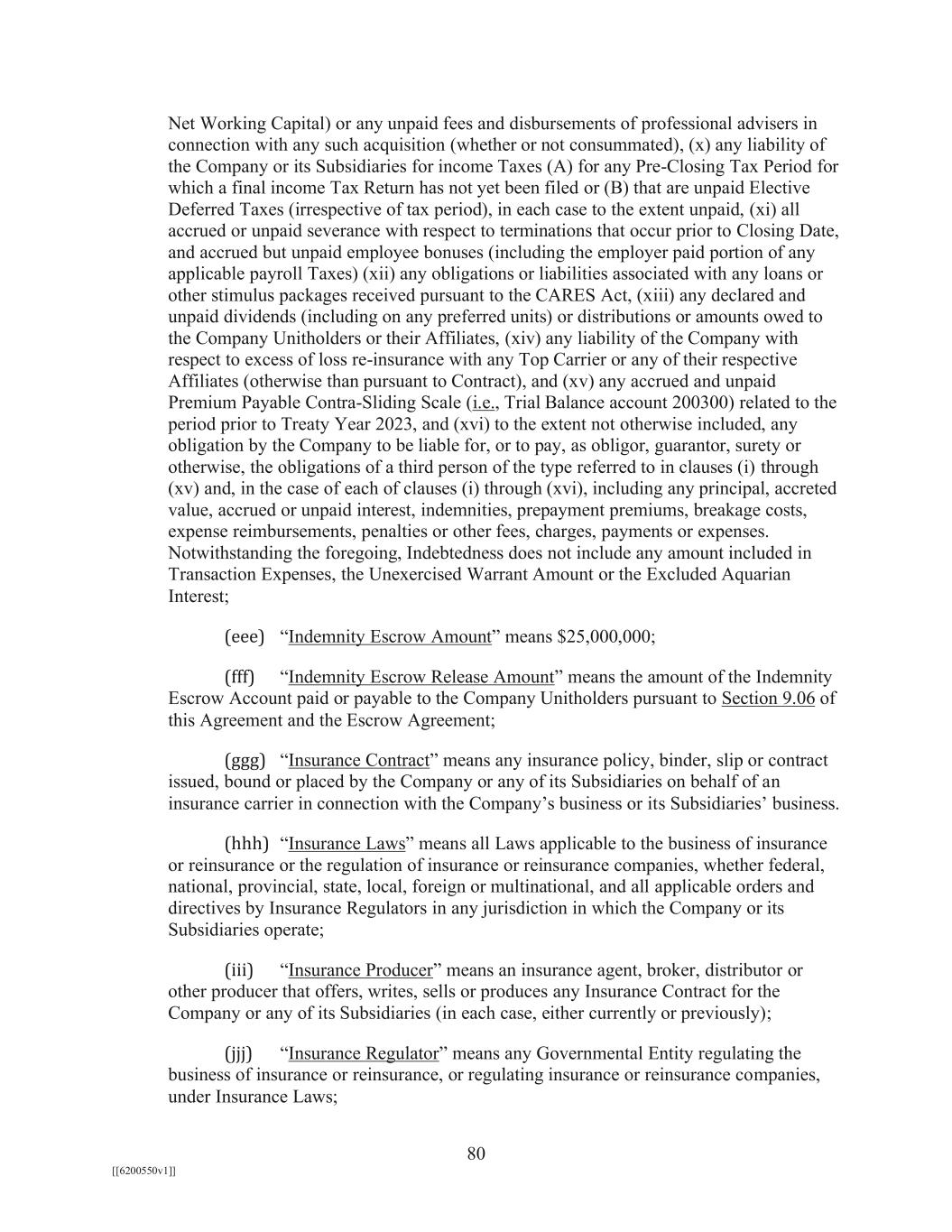 80 [[6200550v1]] Net Working Capital) or any unpaid fees and disbursements of professional advisers in connection with any such acquisition (whether or not consummated), (x) any liability of the Company or its Subsidiaries for income Taxes (A) for any Pre-Closing Tax Period for which a final income Tax Return has not yet been filed or (B) that are unpaid Elective Deferred Taxes (irrespective of tax period), in each case to the extent unpaid, (xi) all accrued or unpaid severance with respect to terminations that occur prior to Closing Date, and accrued but unpaid employee bonuses (including the employer paid portion of any applicable payroll Taxes) (xii) any obligations or liabilities associated with any loans or other stimulus packages received pursuant to the CARES Act, (xiii) any declared and unpaid dividends (including on any preferred units) or distributions or amounts owed to the Company Unitholders or their Affiliates, (xiv) any liability of the Company with respect to excess of loss re-insurance with any Top Carrier or any of their respective Affiliates (otherwise than pursuant to Contract), and (xv) any accrued and unpaid Premium Payable Contra-Sliding Scale (i.e., Trial Balance account 200300) related to the period prior to Treaty Year 2023, and (xvi) to the extent not otherwise included, any obligation by the Company to be liable for, or to pay, as obligor, guarantor, surety or otherwise, the obligations of a third person of the type referred to in clauses (i) through (xv) and, in the case of each of clauses (i) through (xvi), including any principal, accreted value, accrued or unpaid interest, indemnities, prepayment premiums, breakage costs, expense reimbursements, penalties or other fees, charges, payments or expenses. Notwithstanding the foregoing, Indebtedness does not include any amount included in Transaction Expenses, the Unexercised Warrant Amount or the Excluded Aquarian Interest; “Indemnity Escrow Amount” means $25,000,000; “Indemnity Escrow Release Amount” means the amount of the Indemnity Escrow Account paid or payable to the Company Unitholders pursuant to Section 9.06 of this Agreement and the Escrow Agreement; “Insurance Contract” means any insurance policy, binder, slip or contract issued, bound or placed by the Company or any of its Subsidiaries on behalf of an insurance carrier in connection with the Company’s business or its Subsidiaries’ business. “Insurance Laws” means all Laws applicable to the business of insurance or reinsurance or the regulation of insurance or reinsurance companies, whether federal, national, provincial, state, local, foreign or multinational, and all applicable orders and directives by Insurance Regulators in any jurisdiction in which the Company or its Subsidiaries operate; “Insurance Producer” means an insurance agent, broker, distributor or other producer that offers, writes, sells or produces any Insurance Contract for the Company or any of its Subsidiaries (in each case, either currently or previously); “Insurance Regulator” means any Governmental Entity regulating the business of insurance or reinsurance, or regulating insurance or reinsurance companies, under Insurance Laws;