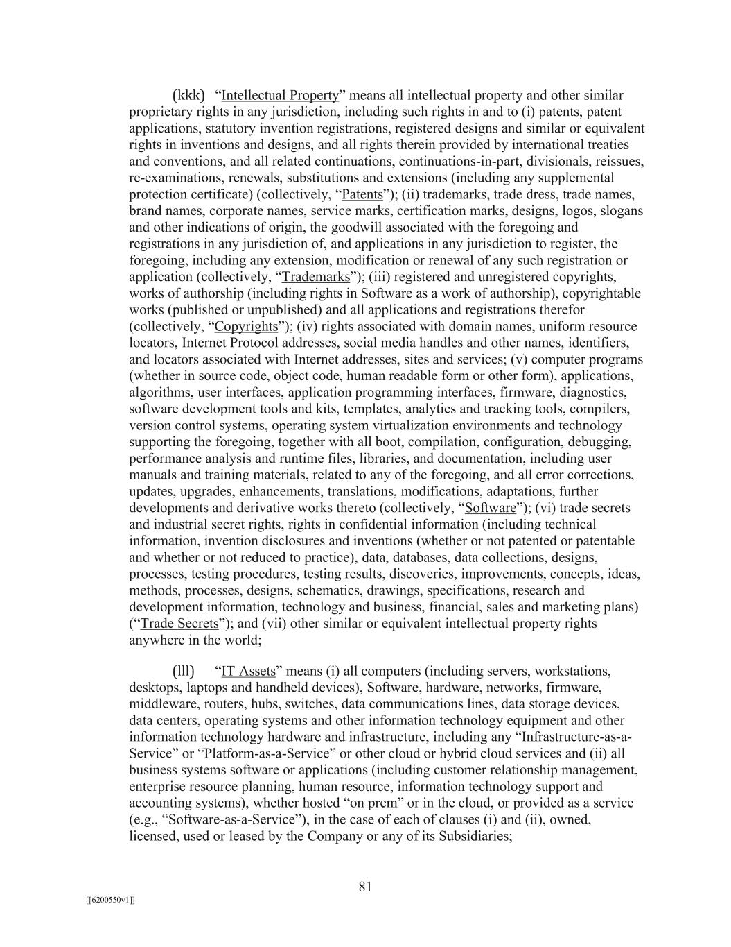 81 [[6200550v1]] “Intellectual Property” means all intellectual property and other similar proprietary rights in any jurisdiction, including such rights in and to (i) patents, patent applications, statutory invention registrations, registered designs and similar or equivalent rights in inventions and designs, and all rights therein provided by international treaties and conventions, and all related continuations, continuations-in-part, divisionals, reissues, re-examinations, renewals, substitutions and extensions (including any supplemental protection certificate) (collectively, “Patents”); (ii) trademarks, trade dress, trade names, brand names, corporate names, service marks, certification marks, designs, logos, slogans and other indications of origin, the goodwill associated with the foregoing and registrations in any jurisdiction of, and applications in any jurisdiction to register, the foregoing, including any extension, modification or renewal of any such registration or application (collectively, “Trademarks”); (iii) registered and unregistered copyrights, works of authorship (including rights in Software as a work of authorship), copyrightable works (published or unpublished) and all applications and registrations therefor (collectively, “Copyrights”); (iv) rights associated with domain names, uniform resource locators, Internet Protocol addresses, social media handles and other names, identifiers, and locators associated with Internet addresses, sites and services; (v) computer programs (whether in source code, object code, human readable form or other form), applications, algorithms, user interfaces, application programming interfaces, firmware, diagnostics, software development tools and kits, templates, analytics and tracking tools, compilers, version control systems, operating system virtualization environments and technology supporting the foregoing, together with all boot, compilation, configuration, debugging, performance analysis and runtime files, libraries, and documentation, including user manuals and training materials, related to any of the foregoing, and all error corrections, updates, upgrades, enhancements, translations, modifications, adaptations, further developments and derivative works thereto (collectively, “Software”); (vi) trade secrets and industrial secret rights, rights in confidential information (including technical information, invention disclosures and inventions (whether or not patented or patentable and whether or not reduced to practice), data, databases, data collections, designs, processes, testing procedures, testing results, discoveries, improvements, concepts, ideas, methods, processes, designs, schematics, drawings, specifications, research and development information, technology and business, financial, sales and marketing plans) (“Trade Secrets”); and (vii) other similar or equivalent intellectual property rights anywhere in the world; “IT Assets” means (i) all computers (including servers, workstations, desktops, laptops and handheld devices), Software, hardware, networks, firmware, middleware, routers, hubs, switches, data communications lines, data storage devices, data centers, operating systems and other information technology equipment and other information technology hardware and infrastructure, including any “Infrastructure-as-a- Service” or “Platform-as-a-Service” or other cloud or hybrid cloud services and (ii) all business systems software or applications (including customer relationship management, enterprise resource planning, human resource, information technology support and accounting systems), whether hosted “on prem” or in the cloud, or provided as a service (e.g., “Software-as-a-Service”), in the case of each of clauses (i) and (ii), owned, licensed, used or leased by the Company or any of its Subsidiaries;