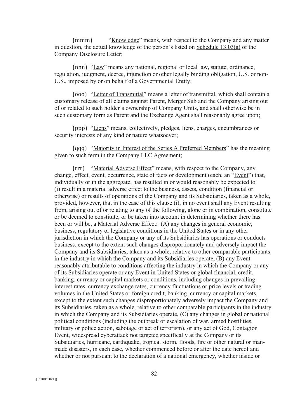 82 [[6200550v1]] “Knowledge” means, with respect to the Company and any matter in question, the actual knowledge of the person’s listed on Schedule 13.03(a) of the Company Disclosure Letter; “Law” means any national, regional or local law, statute, ordinance, regulation, judgment, decree, injunction or other legally binding obligation, U.S. or non- U.S., imposed by or on behalf of a Governmental Entity; “Letter of Transmittal” means a letter of transmittal, which shall contain a customary release of all claims against Parent, Merger Sub and the Company arising out of or related to such holder’s ownership of Company Units, and shall otherwise be in such customary form as Parent and the Exchange Agent shall reasonably agree upon; “Liens” means, collectively, pledges, liens, charges, encumbrances or security interests of any kind or nature whatsoever; “Majority in Interest of the Series A Preferred Members” has the meaning given to such term in the Company LLC Agreement; “Material Adverse Effect” means, with respect to the Company, any change, effect, event, occurrence, state of facts or development (each, an “Event”) that, individually or in the aggregate, has resulted in or would reasonably be expected to (i) result in a material adverse effect to the business, assets, condition (financial or otherwise) or results of operations of the Company and its Subsidiaries, taken as a whole, provided, however, that in the case of this clause (i), in no event shall any Event resulting from, arising out of or relating to any of the following, alone or in combination, constitute or be deemed to constitute, or be taken into account in determining whether there has been or will be, a Material Adverse Effect: (A) any changes in general economic, business, regulatory or legislative conditions in the United States or in any other jurisdiction in which the Company or any of its Subsidiaries has operations or conducts business, except to the extent such changes disproportionately and adversely impact the Company and its Subsidiaries, taken as a whole, relative to other comparable participants in the industry in which the Company and its Subsidiaries operate, (B) any Event reasonably attributable to conditions affecting the industry in which the Company or any of its Subsidiaries operate or any Event in United States or global financial, credit, banking, currency or capital markets or conditions, including changes in prevailing interest rates, currency exchange rates, currency fluctuations or price levels or trading volumes in the United States or foreign credit, banking, currency or capital markets, except to the extent such changes disproportionately adversely impact the Company and its Subsidiaries, taken as a whole, relative to other comparable participants in the industry in which the Company and its Subsidiaries operate, (C) any changes in global or national political conditions (including the outbreak or escalation of war, armed hostilities, military or police action, sabotage or act of terrorism), or any act of God, Contagion Event, widespread cyberattack not targeted specifically at the Company or its Subsidiaries, hurricane, earthquake, tropical storm, floods, fire or other natural or man- made disasters, in each case, whether commenced before or after the date hereof and whether or not pursuant to the declaration of a national emergency, whether inside or