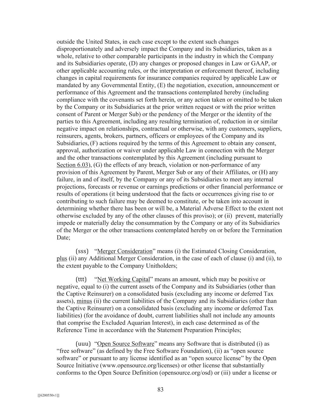 83 [[6200550v1]] outside the United States, in each case except to the extent such changes disproportionately and adversely impact the Company and its Subsidiaries, taken as a whole, relative to other comparable participants in the industry in which the Company and its Subsidiaries operate, (D) any changes or proposed changes in Law or GAAP, or other applicable accounting rules, or the interpretation or enforcement thereof, including changes in capital requirements for insurance companies required by applicable Law or mandated by any Governmental Entity, (E) the negotiation, execution, announcement or performance of this Agreement and the transactions contemplated hereby (including compliance with the covenants set forth herein, or any action taken or omitted to be taken by the Company or its Subsidiaries at the prior written request or with the prior written consent of Parent or Merger Sub) or the pendency of the Merger or the identity of the parties to this Agreement, including any resulting termination of, reduction in or similar negative impact on relationships, contractual or otherwise, with any customers, suppliers, reinsurers, agents, brokers, partners, officers or employees of the Company and its Subsidiaries, (F) actions required by the terms of this Agreement to obtain any consent, approval, authorization or waiver under applicable Law in connection with the Merger and the other transactions contemplated by this Agreement (including pursuant to Section 6.03), (G) the effects of any breach, violation or non-performance of any provision of this Agreement by Parent, Merger Sub or any of their Affiliates, or (H) any failure, in and of itself, by the Company or any of its Subsidiaries to meet any internal projections, forecasts or revenue or earnings predictions or other financial performance or results of operations (it being understood that the facts or occurrences giving rise to or contributing to such failure may be deemed to constitute, or be taken into account in determining whether there has been or will be, a Material Adverse Effect to the extent not otherwise excluded by any of the other clauses of this proviso); or (ii) prevent, materially impede or materially delay the consummation by the Company or any of its Subsidiaries of the Merger or the other transactions contemplated hereby on or before the Termination Date; “Merger Consideration” means (i) the Estimated Closing Consideration, plus (ii) any Additional Merger Consideration, in the case of each of clause (i) and (ii), to the extent payable to the Company Unitholders; “Net Working Capital” means an amount, which may be positive or negative, equal to (i) the current assets of the Company and its Subsidiaries (other than the Captive Reinsurer) on a consolidated basis (excluding any income or deferred Tax assets), minus (ii) the current liabilities of the Company and its Subsidiaries (other than the Captive Reinsurer) on a consolidated basis (excluding any income or deferred Tax liabilities) (for the avoidance of doubt, current liabilities shall not include any amounts that comprise the Excluded Aquarian Interest), in each case determined as of the Reference Time in accordance with the Statement Preparation Principles; “Open Source Software” means any Software that is distributed (i) as “free software” (as defined by the Free Software Foundation), (ii) as “open source software” or pursuant to any license identified as an “open source license” by the Open Source Initiative (www.opensource.org/licenses) or other license that substantially conforms to the Open Source Definition (opensource.org/osd) or (iii) under a license or