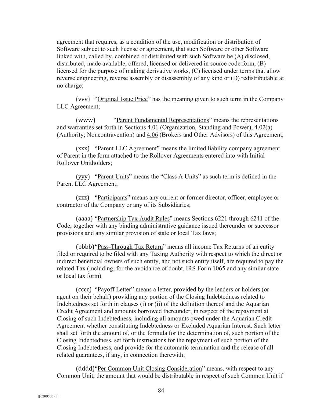 84 [[6200550v1]] agreement that requires, as a condition of the use, modification or distribution of Software subject to such license or agreement, that such Software or other Software linked with, called by, combined or distributed with such Software be (A) disclosed, distributed, made available, offered, licensed or delivered in source code form, (B) licensed for the purpose of making derivative works, (C) licensed under terms that allow reverse engineering, reverse assembly or disassembly of any kind or (D) redistributable at no charge; “Original Issue Price” has the meaning given to such term in the Company LLC Agreement; “Parent Fundamental Representations” means the representations and warranties set forth in Sections 4.01 (Organization, Standing and Power), 4.02(a) (Authority; Noncontravention) and 4.06 (Brokers and Other Advisors) of this Agreement; “Parent LLC Agreement” means the limited liability company agreement of Parent in the form attached to the Rollover Agreements entered into with Initial Rollover Unitholders; “Parent Units” means the “Class A Units” as such term is defined in the Parent LLC Agreement; “Participants” means any current or former director, officer, employee or contractor of the Company or any of its Subsidiaries; “Partnership Tax Audit Rules” means Sections 6221 through 6241 of the Code, together with any binding administrative guidance issued thereunder or successor provisions and any similar provision of state or local Tax laws; “Pass-Through Tax Return” means all income Tax Returns of an entity filed or required to be filed with any Taxing Authority with respect to which the direct or indirect beneficial owners of such entity, and not such entity itself, are required to pay the related Tax (including, for the avoidance of doubt, IRS Form 1065 and any similar state or local tax form) “Payoff Letter” means a letter, provided by the lenders or holders (or agent on their behalf) providing any portion of the Closing Indebtedness related to Indebtedness set forth in clauses (i) or (ii) of the definition thereof and the Aquarian Credit Agreement and amounts borrowed thereunder, in respect of the repayment at Closing of such Indebtedness, including all amounts owed under the Aquarian Credit Agreement whether constituting Indebtedness or Excluded Aquarian Interest. Such letter shall set forth the amount of, or the formula for the determination of, such portion of the Closing Indebtedness, set forth instructions for the repayment of such portion of the Closing Indebtedness, and provide for the automatic termination and the release of all related guarantees, if any, in connection therewith; “Per Common Unit Closing Consideration” means, with respect to any Common Unit, the amount that would be distributable in respect of such Common Unit if