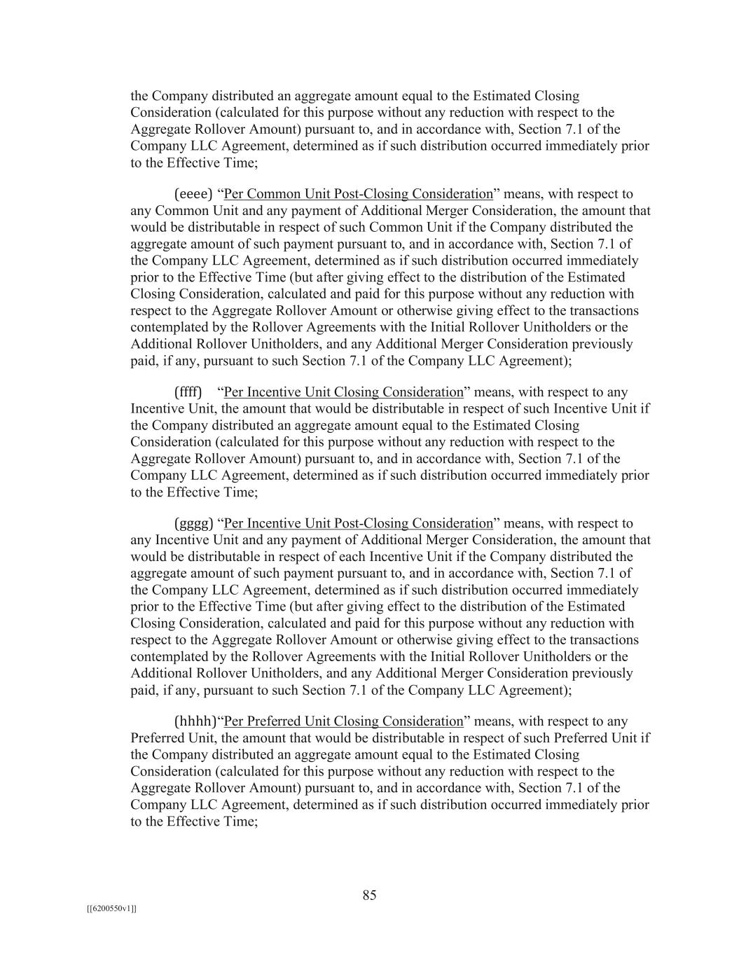 85 [[6200550v1]] the Company distributed an aggregate amount equal to the Estimated Closing Consideration (calculated for this purpose without any reduction with respect to the Aggregate Rollover Amount) pursuant to, and in accordance with, Section 7.1 of the Company LLC Agreement, determined as if such distribution occurred immediately prior to the Effective Time; “Per Common Unit Post-Closing Consideration” means, with respect to any Common Unit and any payment of Additional Merger Consideration, the amount that would be distributable in respect of such Common Unit if the Company distributed the aggregate amount of such payment pursuant to, and in accordance with, Section 7.1 of the Company LLC Agreement, determined as if such distribution occurred immediately prior to the Effective Time (but after giving effect to the distribution of the Estimated Closing Consideration, calculated and paid for this purpose without any reduction with respect to the Aggregate Rollover Amount or otherwise giving effect to the transactions contemplated by the Rollover Agreements with the Initial Rollover Unitholders or the Additional Rollover Unitholders, and any Additional Merger Consideration previously paid, if any, pursuant to such Section 7.1 of the Company LLC Agreement); “Per Incentive Unit Closing Consideration” means, with respect to any Incentive Unit, the amount that would be distributable in respect of such Incentive Unit if the Company distributed an aggregate amount equal to the Estimated Closing Consideration (calculated for this purpose without any reduction with respect to the Aggregate Rollover Amount) pursuant to, and in accordance with, Section 7.1 of the Company LLC Agreement, determined as if such distribution occurred immediately prior to the Effective Time; “Per Incentive Unit Post-Closing Consideration” means, with respect to any Incentive Unit and any payment of Additional Merger Consideration, the amount that would be distributable in respect of each Incentive Unit if the Company distributed the aggregate amount of such payment pursuant to, and in accordance with, Section 7.1 of the Company LLC Agreement, determined as if such distribution occurred immediately prior to the Effective Time (but after giving effect to the distribution of the Estimated Closing Consideration, calculated and paid for this purpose without any reduction with respect to the Aggregate Rollover Amount or otherwise giving effect to the transactions contemplated by the Rollover Agreements with the Initial Rollover Unitholders or the Additional Rollover Unitholders, and any Additional Merger Consideration previously paid, if any, pursuant to such Section 7.1 of the Company LLC Agreement); “Per Preferred Unit Closing Consideration” means, with respect to any Preferred Unit, the amount that would be distributable in respect of such Preferred Unit if the Company distributed an aggregate amount equal to the Estimated Closing Consideration (calculated for this purpose without any reduction with respect to the Aggregate Rollover Amount) pursuant to, and in accordance with, Section 7.1 of the Company LLC Agreement, determined as if such distribution occurred immediately prior to the Effective Time;