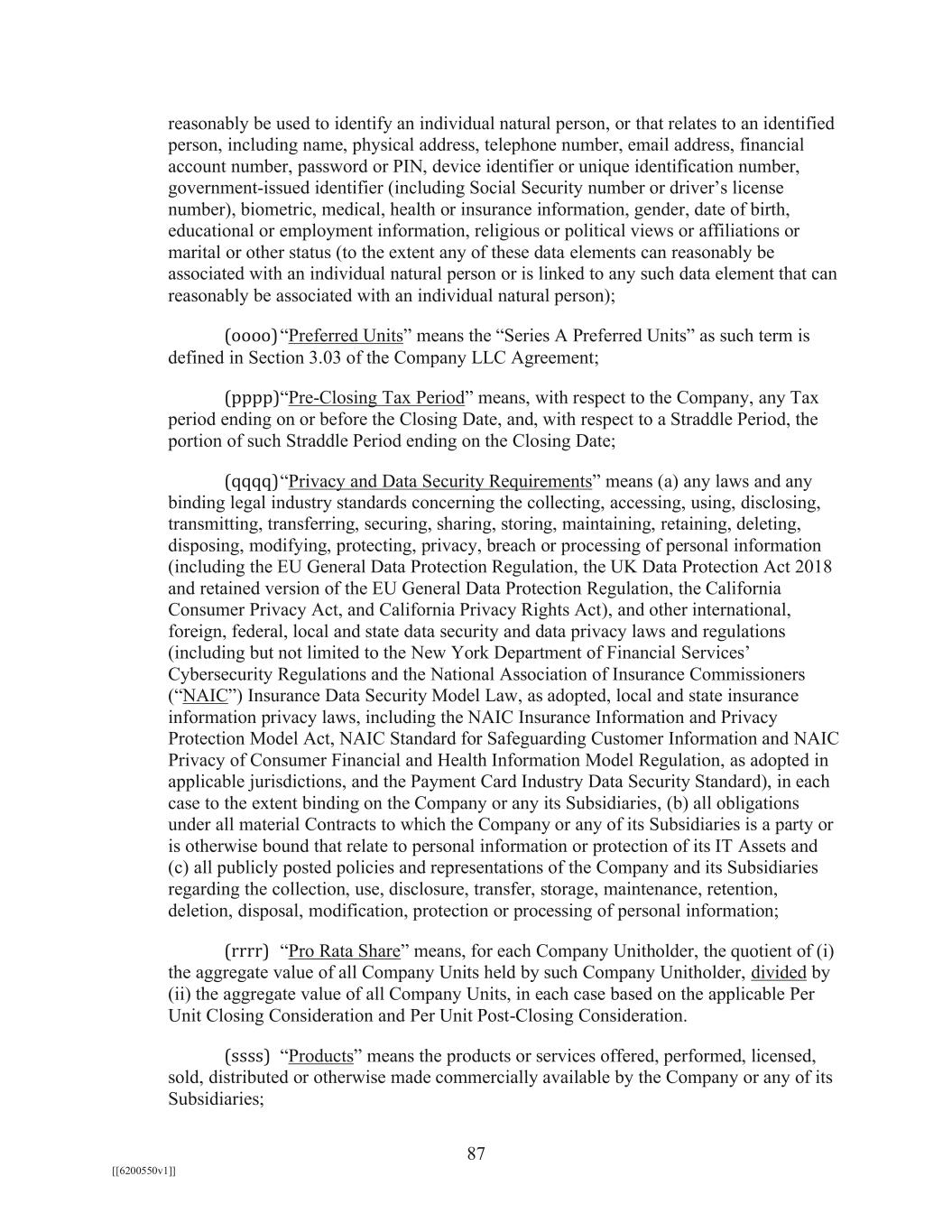 87 [[6200550v1]] reasonably be used to identify an individual natural person, or that relates to an identified person, including name, physical address, telephone number, email address, financial account number, password or PIN, device identifier or unique identification number, government-issued identifier (including Social Security number or driver’s license number), biometric, medical, health or insurance information, gender, date of birth, educational or employment information, religious or political views or affiliations or marital or other status (to the extent any of these data elements can reasonably be associated with an individual natural person or is linked to any such data element that can reasonably be associated with an individual natural person); “Preferred Units” means the “Series A Preferred Units” as such term is defined in Section 3.03 of the Company LLC Agreement; “Pre-Closing Tax Period” means, with respect to the Company, any Tax period ending on or before the Closing Date, and, with respect to a Straddle Period, the portion of such Straddle Period ending on the Closing Date; “Privacy and Data Security Requirements” means (a) any laws and any binding legal industry standards concerning the collecting, accessing, using, disclosing, transmitting, transferring, securing, sharing, storing, maintaining, retaining, deleting, disposing, modifying, protecting, privacy, breach or processing of personal information (including the EU General Data Protection Regulation, the UK Data Protection Act 2018 and retained version of the EU General Data Protection Regulation, the California Consumer Privacy Act, and California Privacy Rights Act), and other international, foreign, federal, local and state data security and data privacy laws and regulations (including but not limited to the New York Department of Financial Services’ Cybersecurity Regulations and the National Association of Insurance Commissioners (“NAIC”) Insurance Data Security Model Law, as adopted, local and state insurance information privacy laws, including the NAIC Insurance Information and Privacy Protection Model Act, NAIC Standard for Safeguarding Customer Information and NAIC Privacy of Consumer Financial and Health Information Model Regulation, as adopted in applicable jurisdictions, and the Payment Card Industry Data Security Standard), in each case to the extent binding on the Company or any its Subsidiaries, (b) all obligations under all material Contracts to which the Company or any of its Subsidiaries is a party or is otherwise bound that relate to personal information or protection of its IT Assets and (c) all publicly posted policies and representations of the Company and its Subsidiaries regarding the collection, use, disclosure, transfer, storage, maintenance, retention, deletion, disposal, modification, protection or processing of personal information; “Pro Rata Share” means, for each Company Unitholder, the quotient of (i) the aggregate value of all Company Units held by such Company Unitholder, divided by (ii) the aggregate value of all Company Units, in each case based on the applicable Per Unit Closing Consideration and Per Unit Post-Closing Consideration. “Products” means the products or services offered, performed, licensed, sold, distributed or otherwise made commercially available by the Company or any of its Subsidiaries;