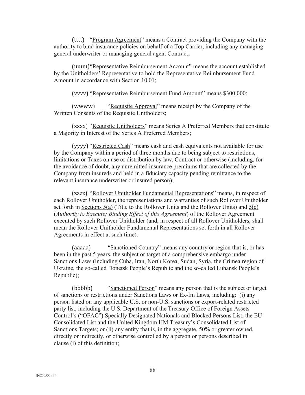 88 [[6200550v1]] “Program Agreement” means a Contract providing the Company with the authority to bind insurance policies on behalf of a Top Carrier, including any managing general underwriter or managing general agent Contract; “Representative Reimbursement Account” means the account established by the Unitholders’ Representative to hold the Representative Reimbursement Fund Amount in accordance with Section 10.01; “Representative Reimbursement Fund Amount” means $300,000; “Requisite Approval” means receipt by the Company of the Written Consents of the Requisite Unitholders; “Requisite Unitholders” means Series A Preferred Members that constitute a Majority in Interest of the Series A Preferred Members; “Restricted Cash” means cash and cash equivalents not available for use by the Company within a period of three months due to being subject to restrictions, limitations or Taxes on use or distribution by law, Contract or otherwise (including, for the avoidance of doubt, any unremitted insurance premiums that are collected by the Company from insureds and held in a fiduciary capacity pending remittance to the relevant insurance underwriter or insured person); “Rollover Unitholder Fundamental Representations” means, in respect of each Rollover Unitholder, the representations and warranties of such Rollover Unitholder set forth in Sections 5(a) (Title to the Rollover Units and the Rollover Units) and 5(c) (Authority to Execute; Binding Effect of this Agreement) of the Rollover Agreement executed by such Rollover Unitholder (and, in respect of all Rollover Unitholders, shall mean the Rollover Unitholder Fundamental Representations set forth in all Rollover Agreements in effect at such time). “Sanctioned Country” means any country or region that is, or has been in the past 5 years, the subject or target of a comprehensive embargo under Sanctions Laws (including Cuba, Iran, North Korea, Sudan, Syria, the Crimea region of Ukraine, the so-called Donetsk People’s Republic and the so-called Luhansk People’s Republic); “Sanctioned Person” means any person that is the subject or target of sanctions or restrictions under Sanctions Laws or Ex-Im Laws, including: (i) any person listed on any applicable U.S. or non-U.S. sanctions or export-related restricted party list, including the U.S. Department of the Treasury Office of Foreign Assets Control’s (“OFAC”) Specially Designated Nationals and Blocked Persons List, the EU Consolidated List and the United Kingdom HM Treasury’s Consolidated List of Sanctions Targets; or (ii) any entity that is, in the aggregate, 50% or greater owned, directly or indirectly, or otherwise controlled by a person or persons described in clause (i) of this definition;